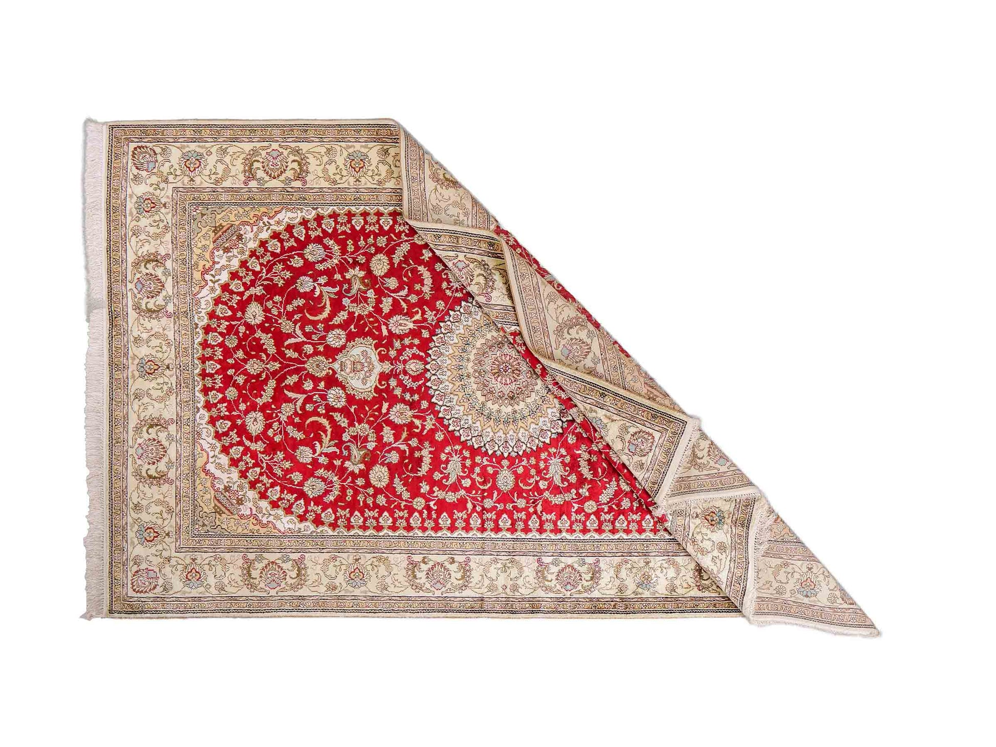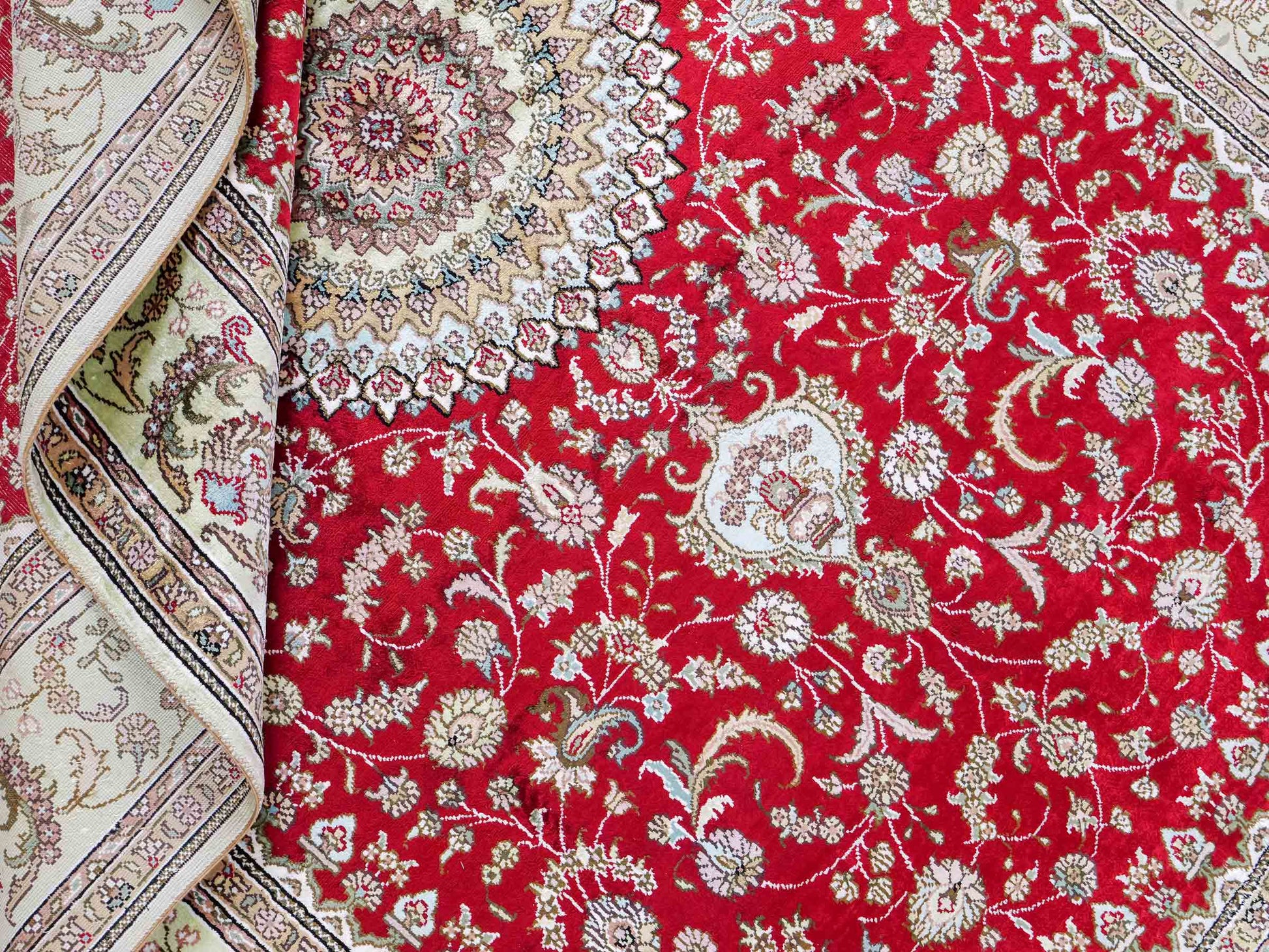 Wool with Silk: These rugs require particularly careful storage, as the combination of wool and silk makes both materials sensitive. Store them in a cool, dry place away from direct sunlight. A constant temperature of about 18 degrees Celsius is ideal. Use breathable cotton dust covers to protect the rug while ensuring ventilation. Regular inspections help to detect mold and pests early.