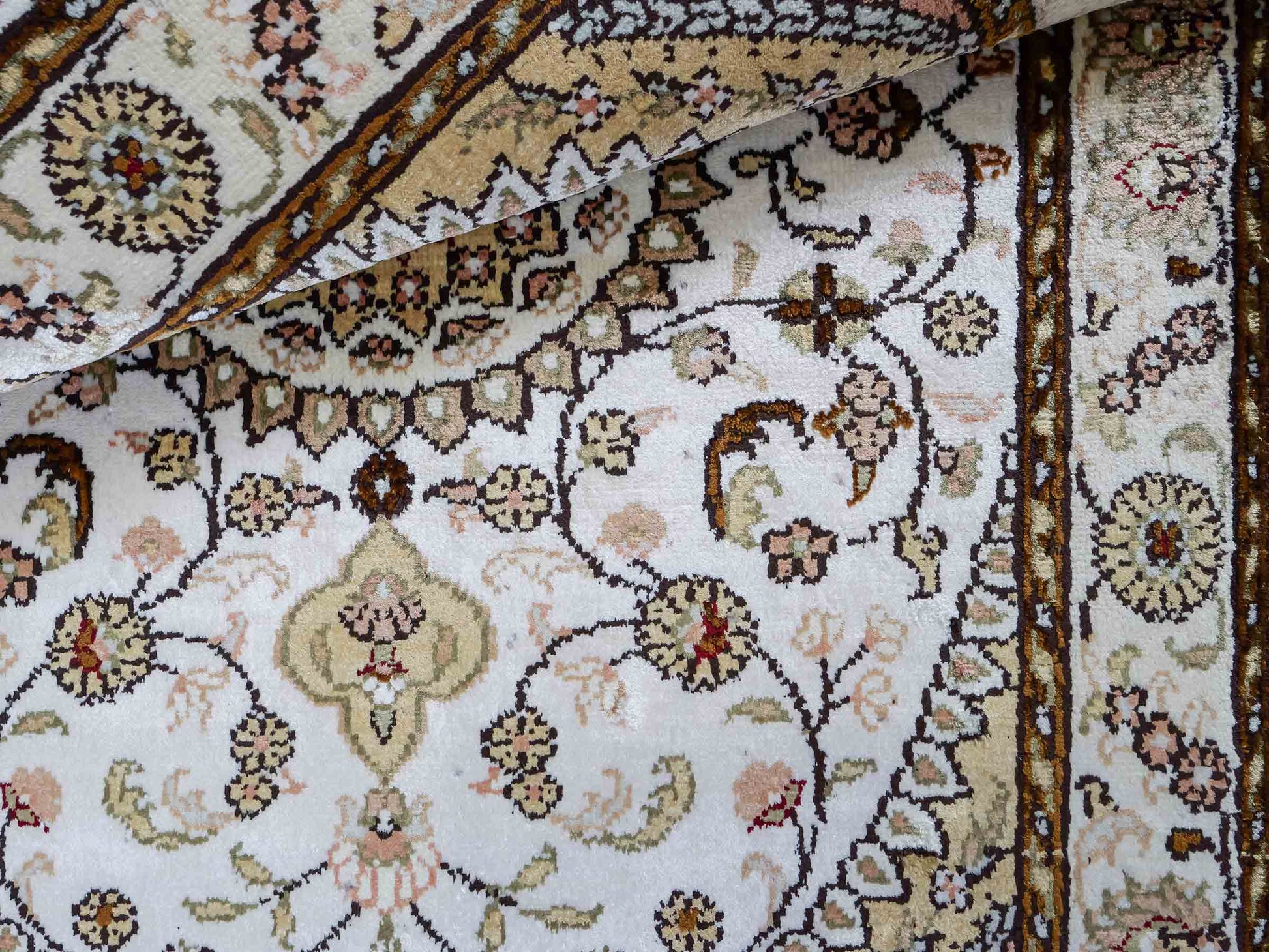 Wool with Silk: These rugs require particularly careful storage, as the combination of wool and silk makes both materials sensitive. Store them in a cool, dry place away from direct sunlight. A constant temperature of about 18 degrees Celsius is ideal. Use breathable cotton dust covers to protect the rug while ensuring ventilation. Regular inspections help to detect mold and pests early.