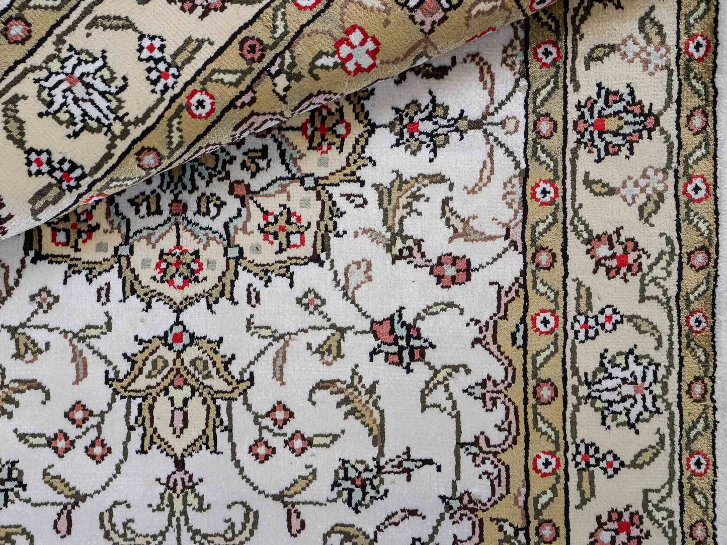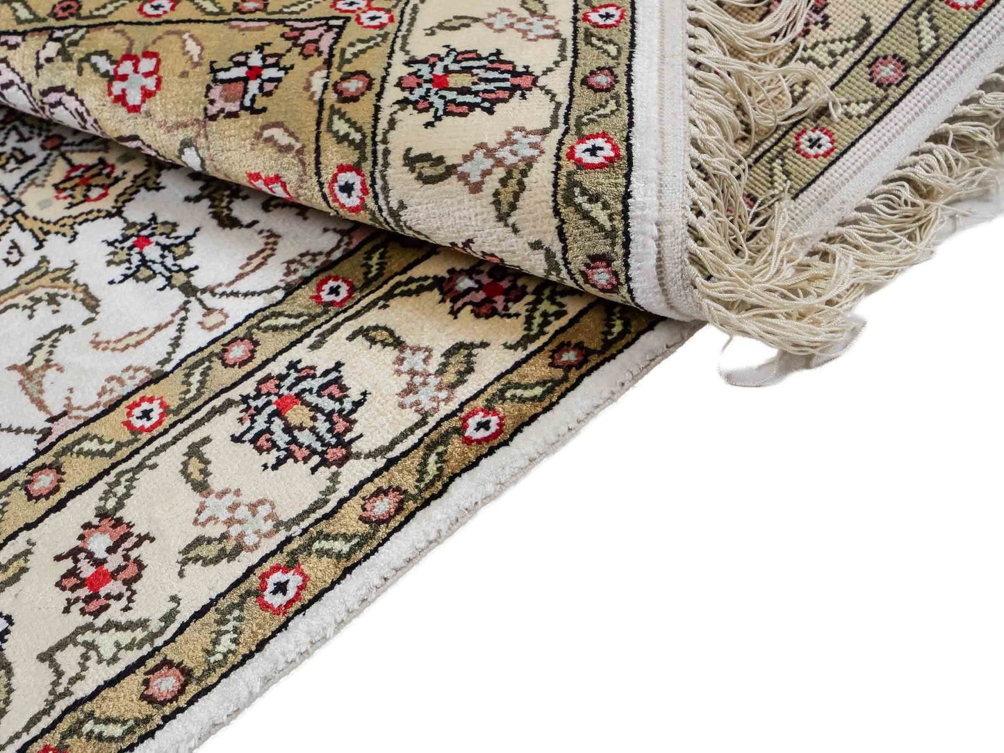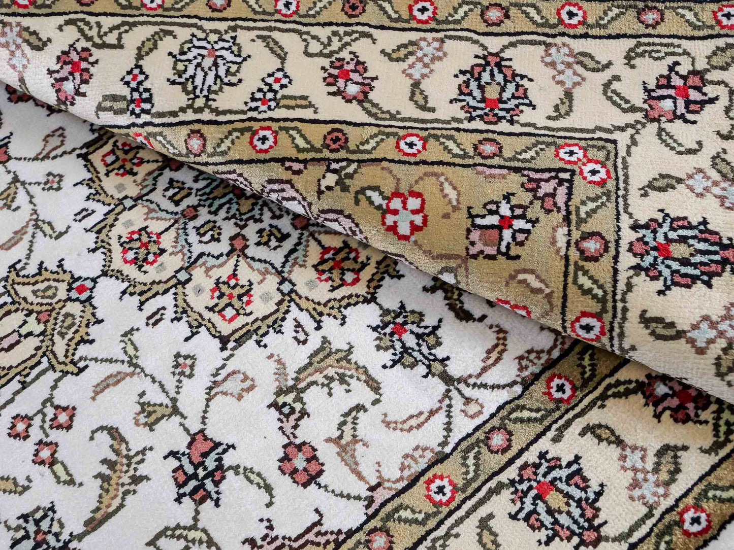 Wool with Silk: These rugs require particularly careful storage, as the combination of wool and silk makes both materials sensitive. Store them in a cool, dry place away from direct sunlight. A constant temperature of about 18 degrees Celsius is ideal. Use breathable cotton dust covers to protect the rug while ensuring ventilation. Regular inspections help to detect mold and pests early.