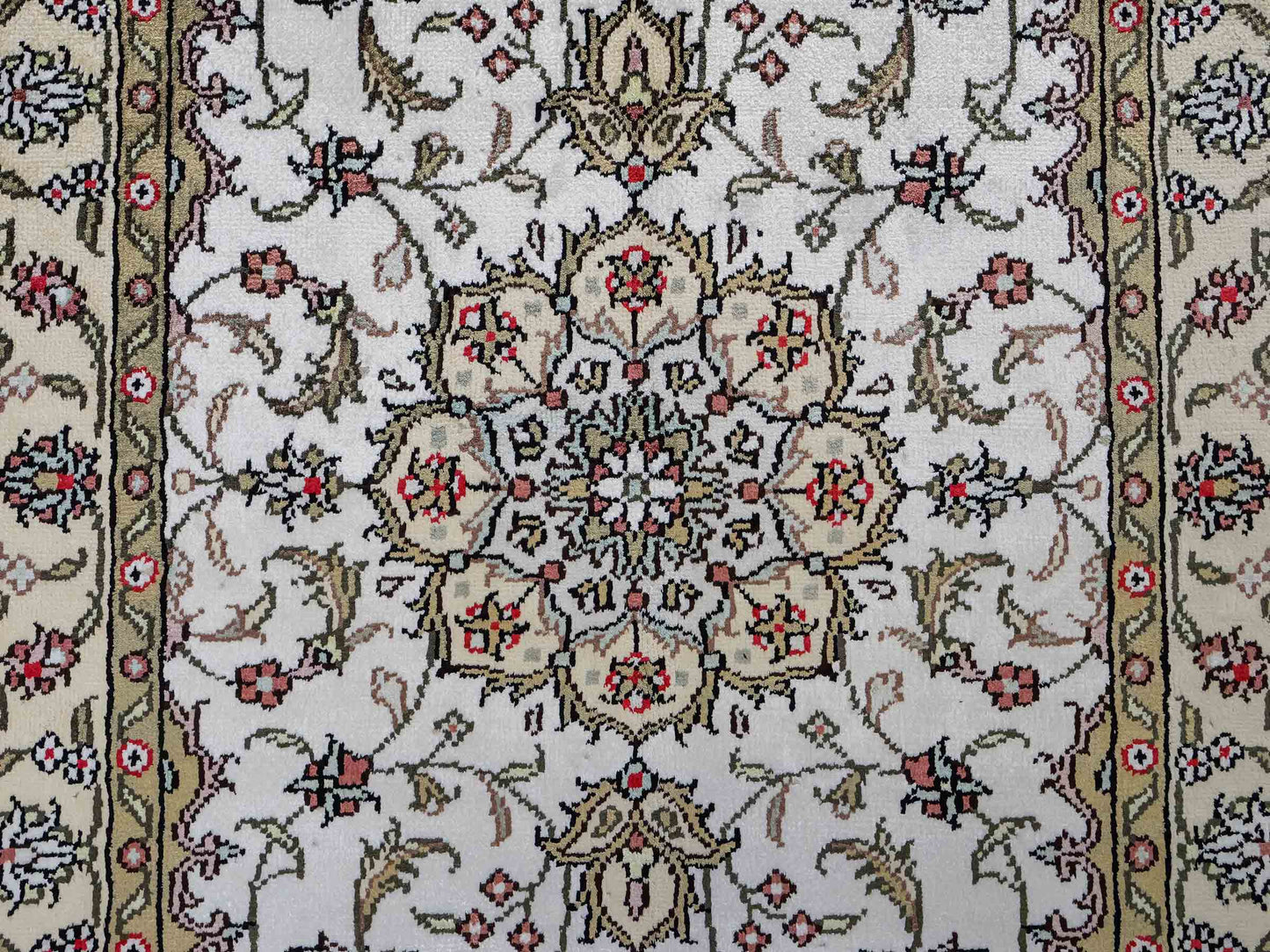 Handcrafted in the traditional way in China, this unique piece impresses with its classic Qom design and timeless color palette.