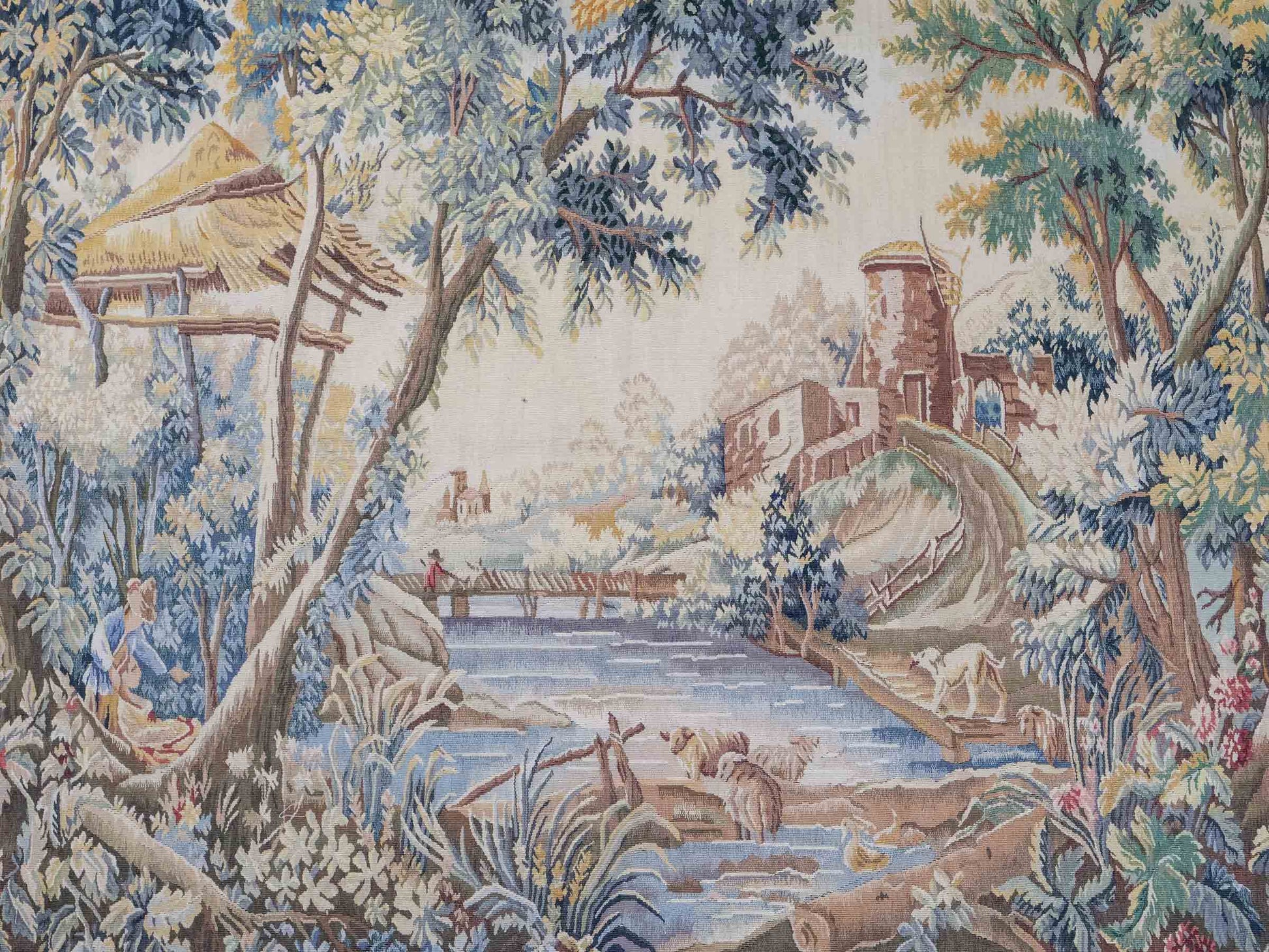 Embark on a journey through time with this handcrafted Chinese wall tapestry in a charming Gobelin design. The floral embossed border frames a picturesque landscape with a blooming forest, an idyllic river surrounded by animals, and a small village—evoking the feel of an artistic painting and bringing a harmonious atmosphere into your home.