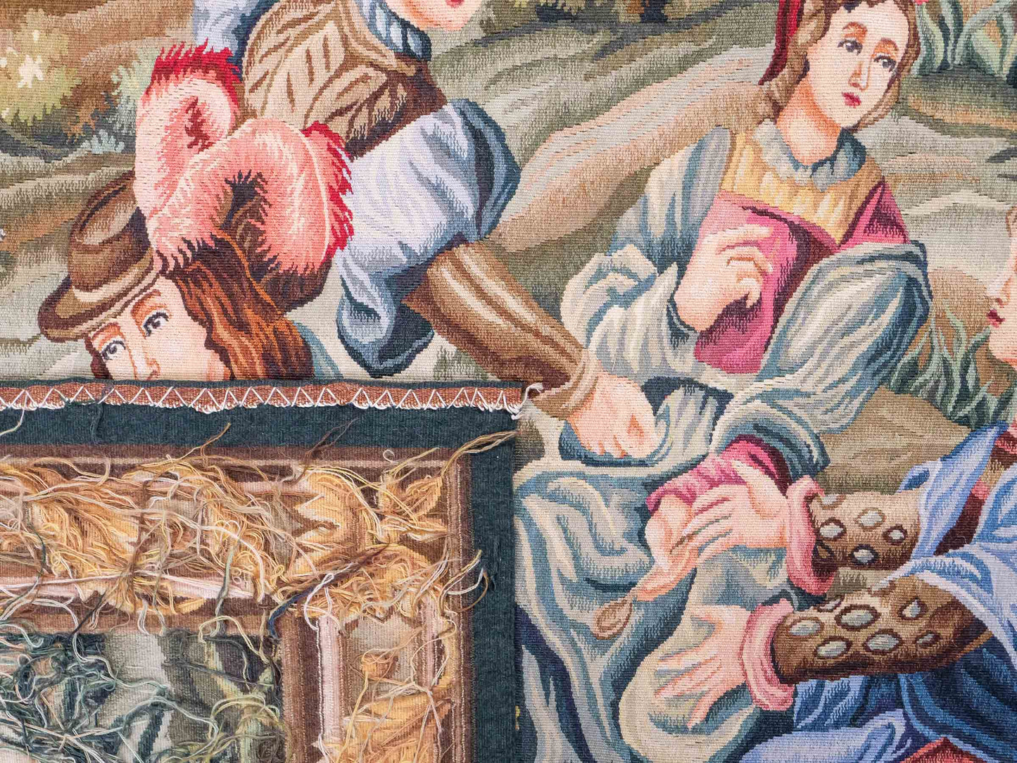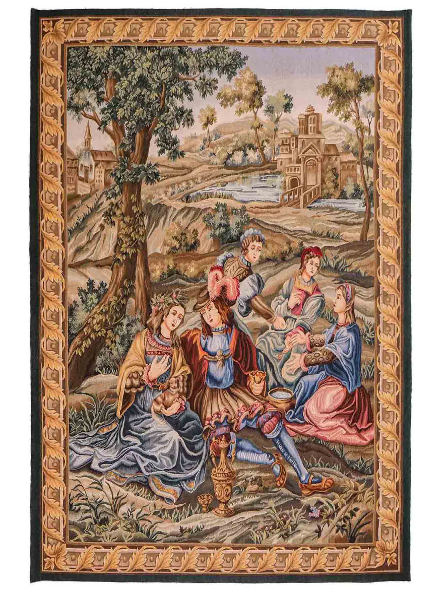 Embark on a journey through time with this handcrafted Chinese wall tapestry in charming Gobelin design. The floral border in soft beige and deep green frames an idyllic landscape scene where four women and a man are sitting together at the edge of a path, chatting and drinking in nature. In the background, you can see a bridge leading to a city and a hill in the distance.