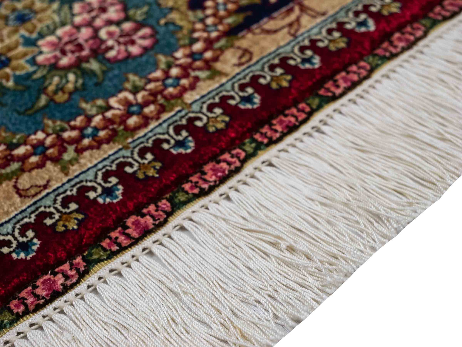 The pile and warp are made of pure silk, which not only grants the rug incredible worth, an unparalleled tactile experience, and breathtaking beauty but also imparts a uniquely shimmering appearance under different angles and lighting conditions.