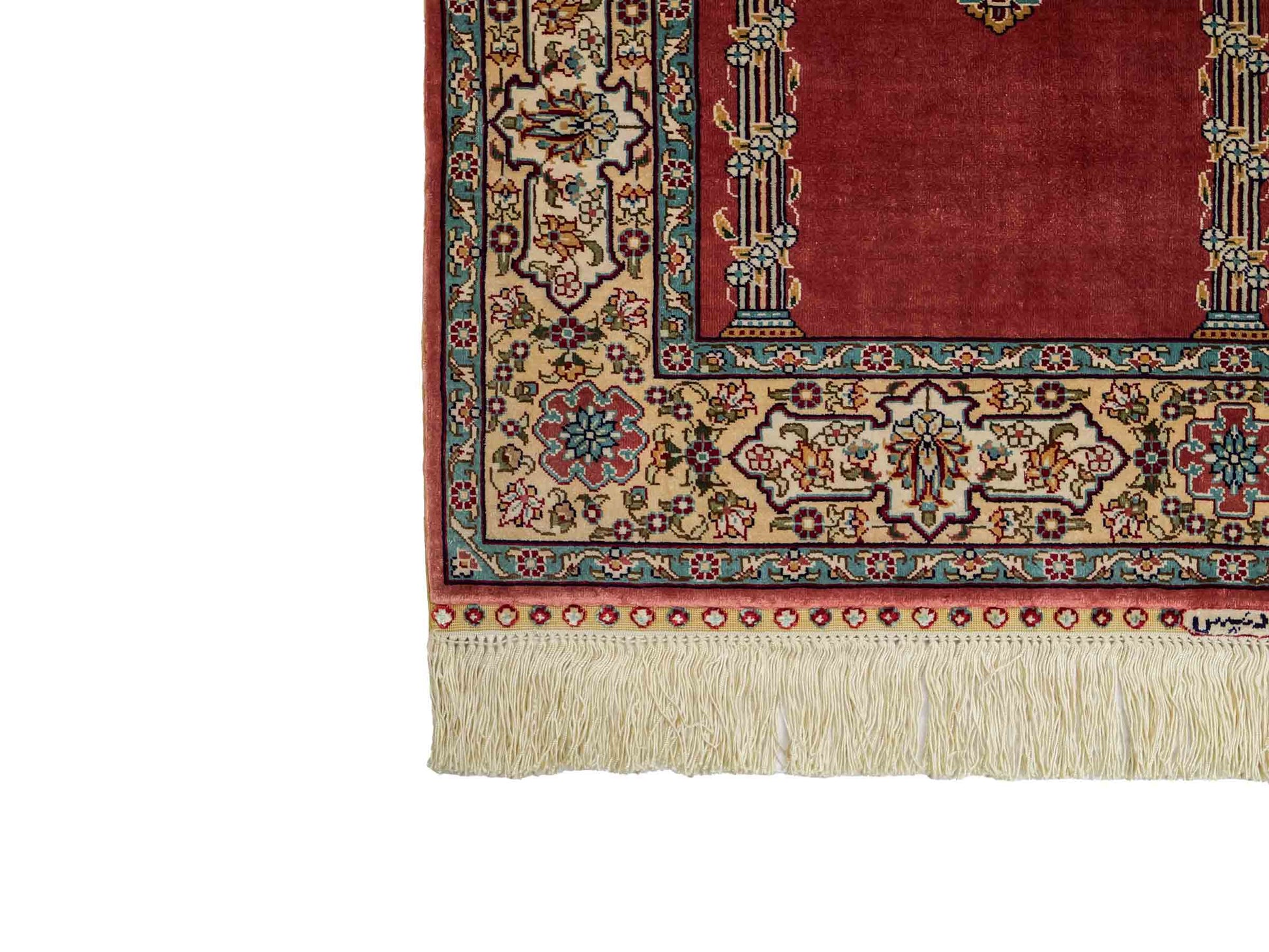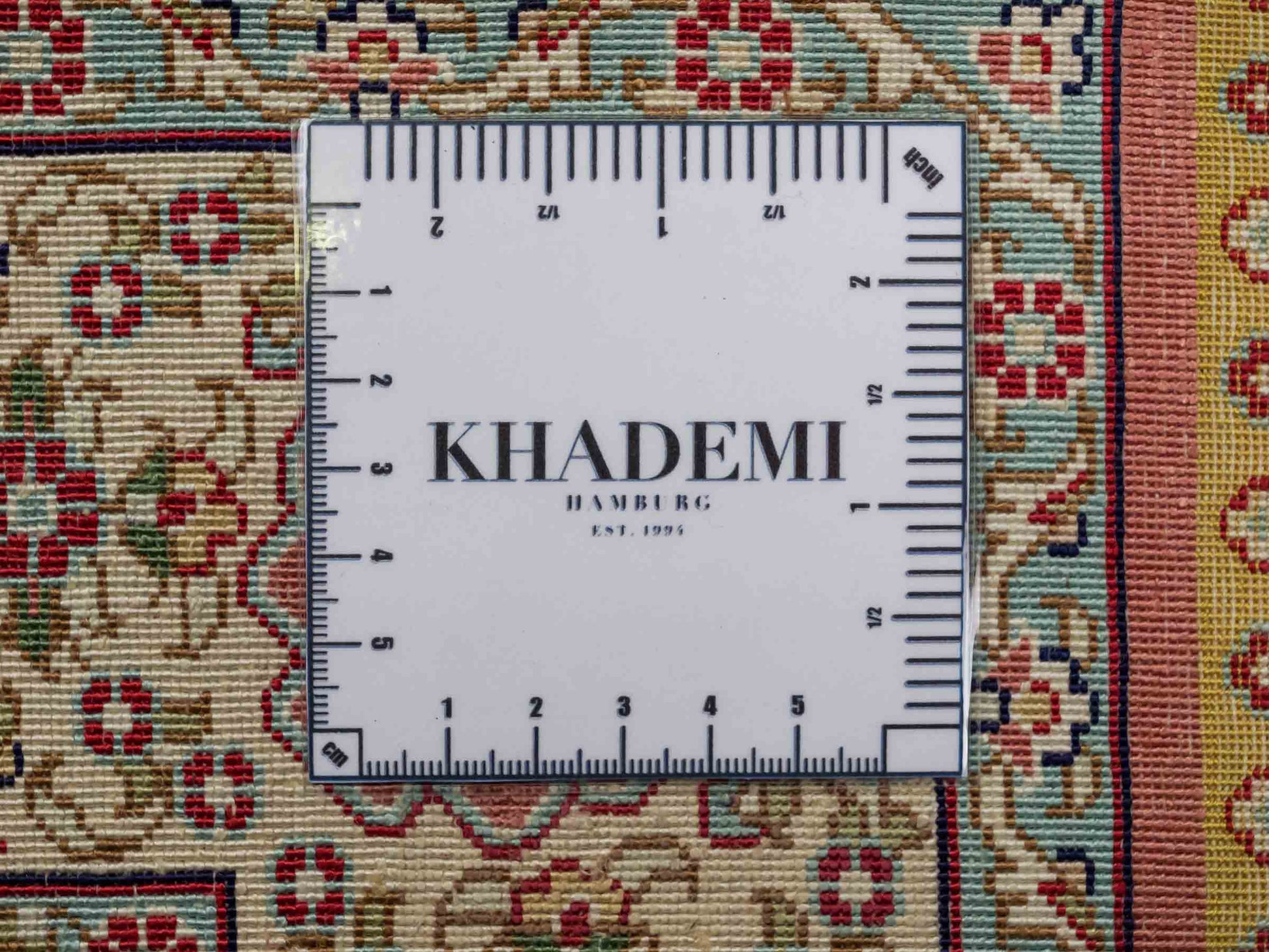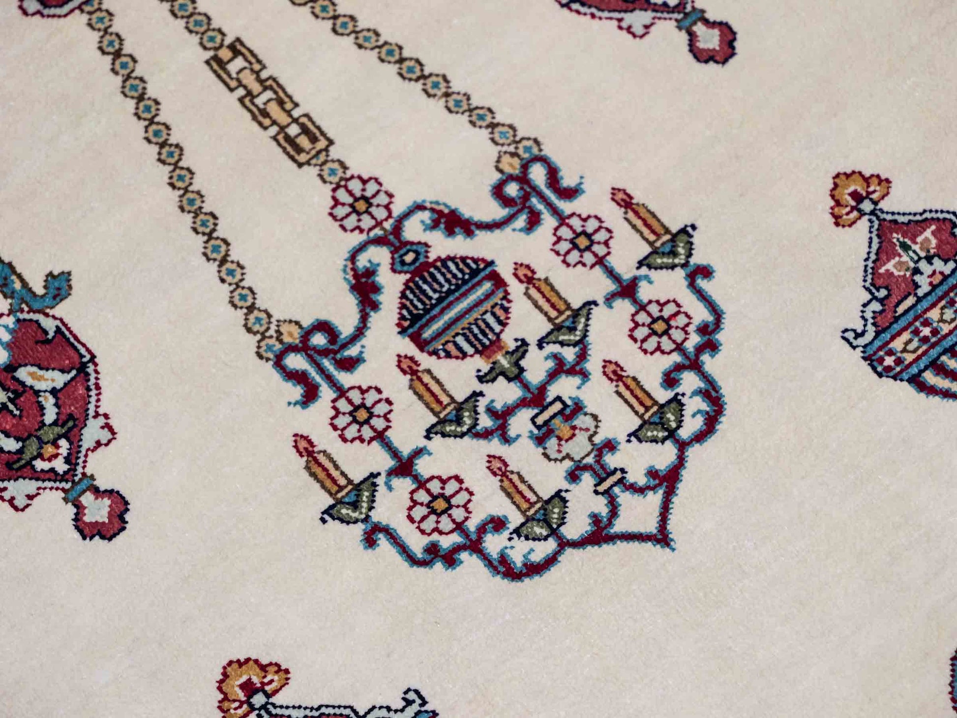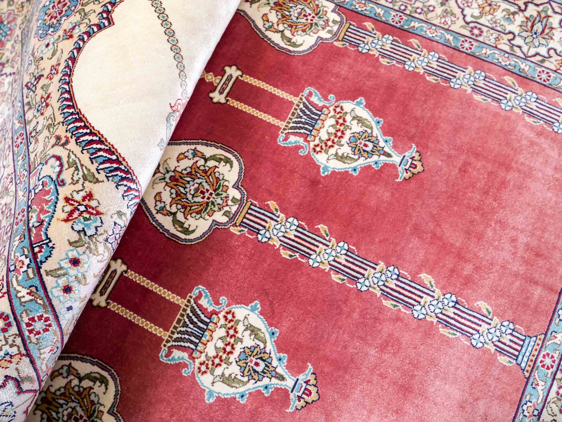 The pile and warp are made of pure silk, which not only grants the rug incredible worth, an unparalleled tactile experience, and breathtaking beauty but also imparts a uniquely shimmering appearance under different angles and lighting conditions.
