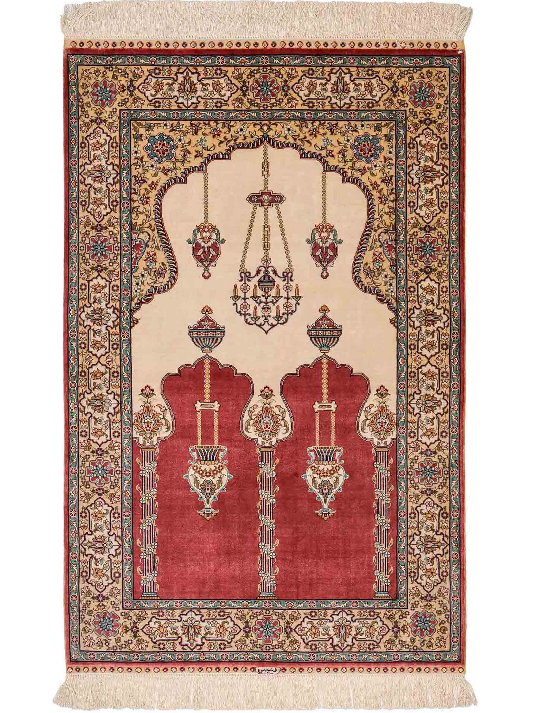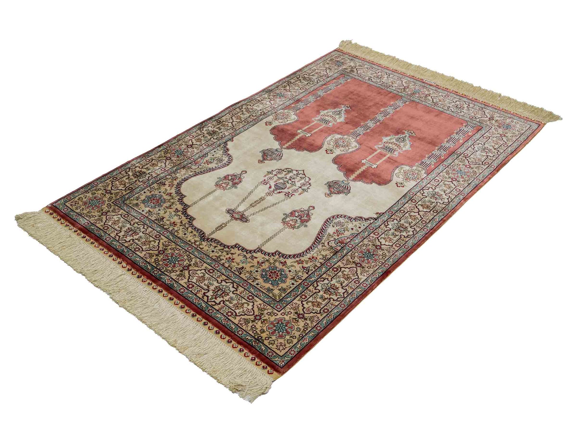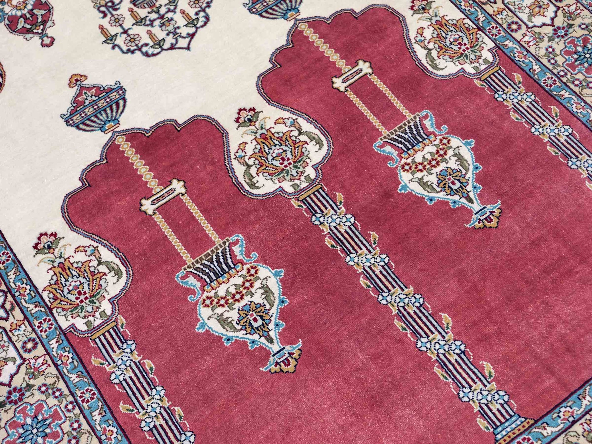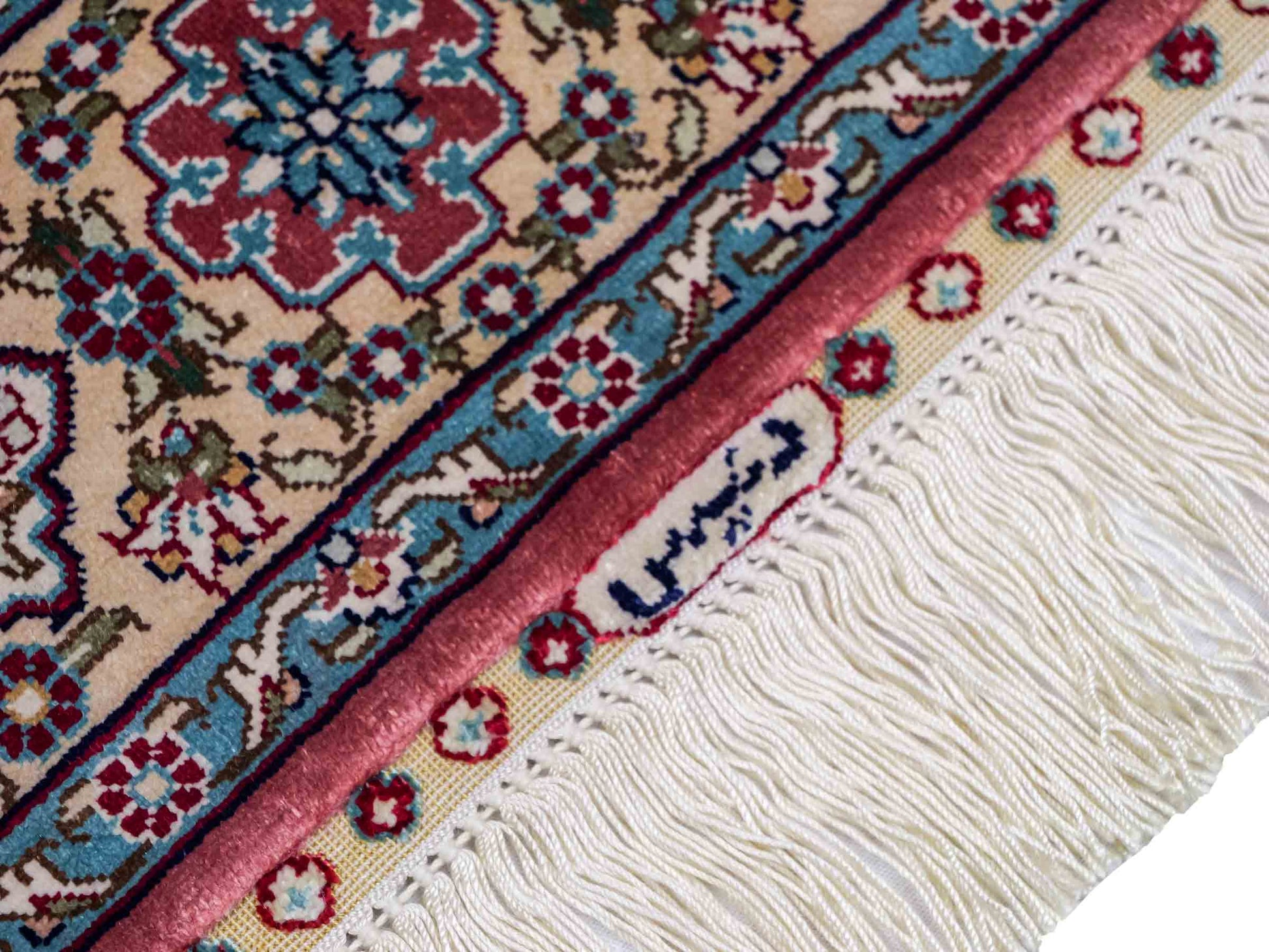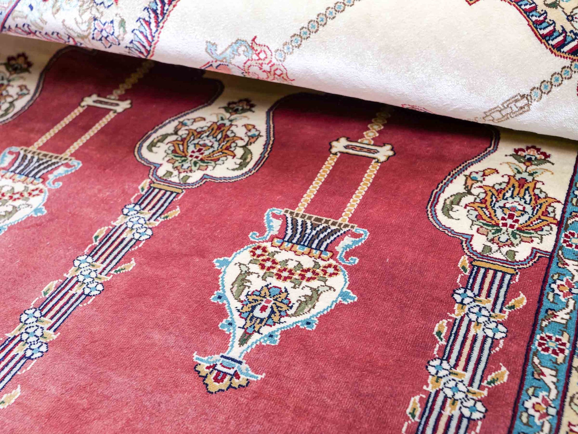 The pile and warp are made of pure silk, which not only grants the rug incredible worth, an unparalleled tactile experience, and breathtaking beauty but also imparts a uniquely shimmering appearance under different angles and lighting conditions.
