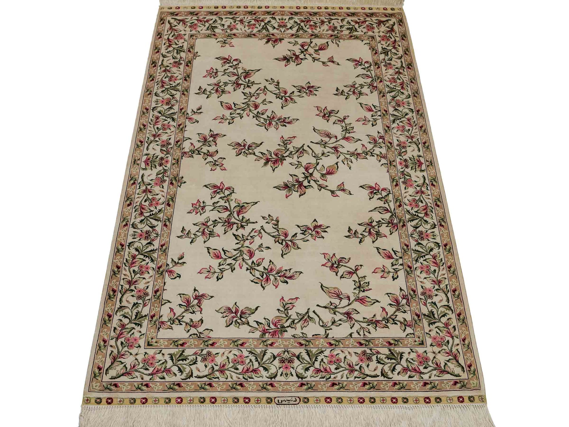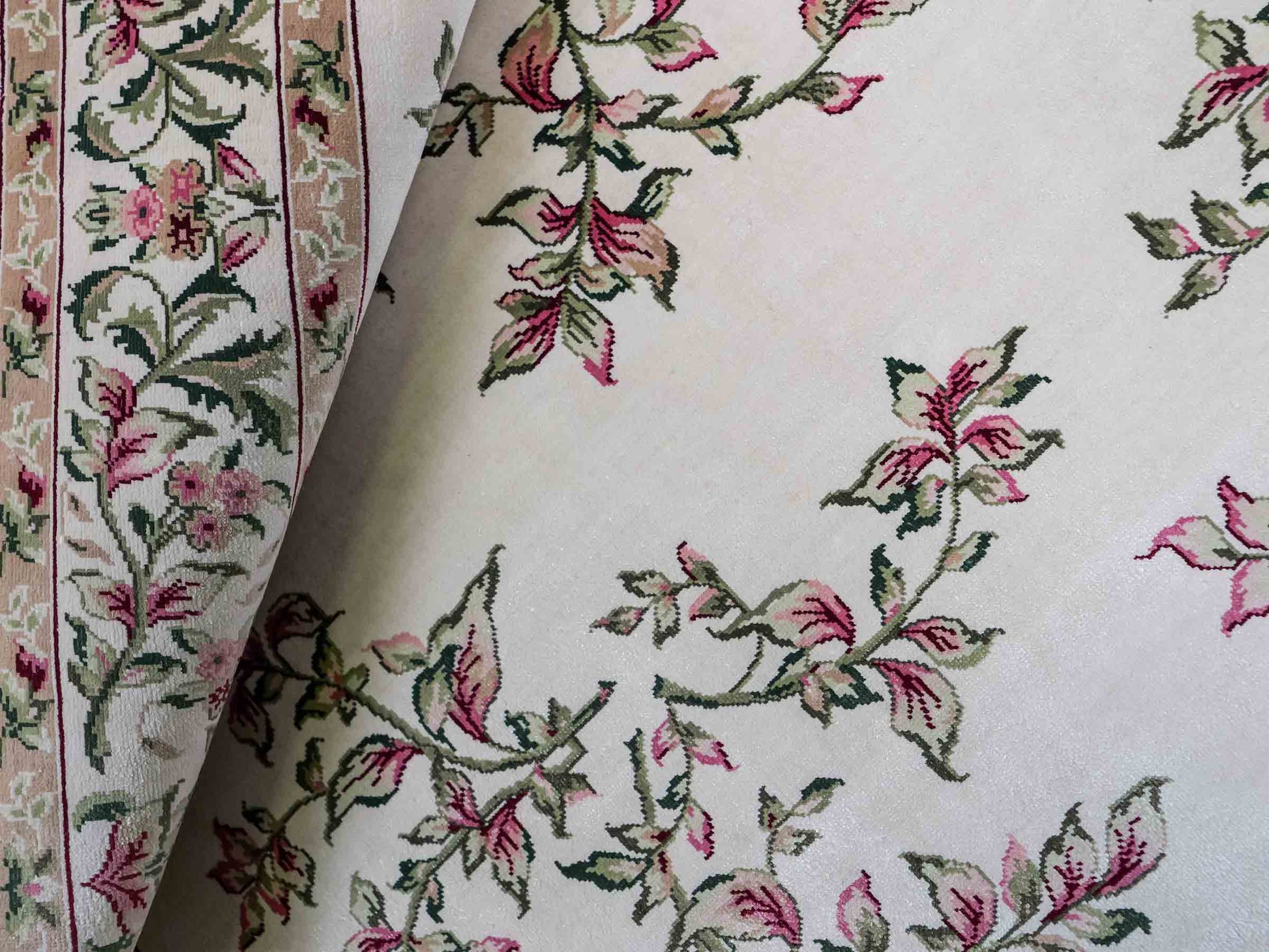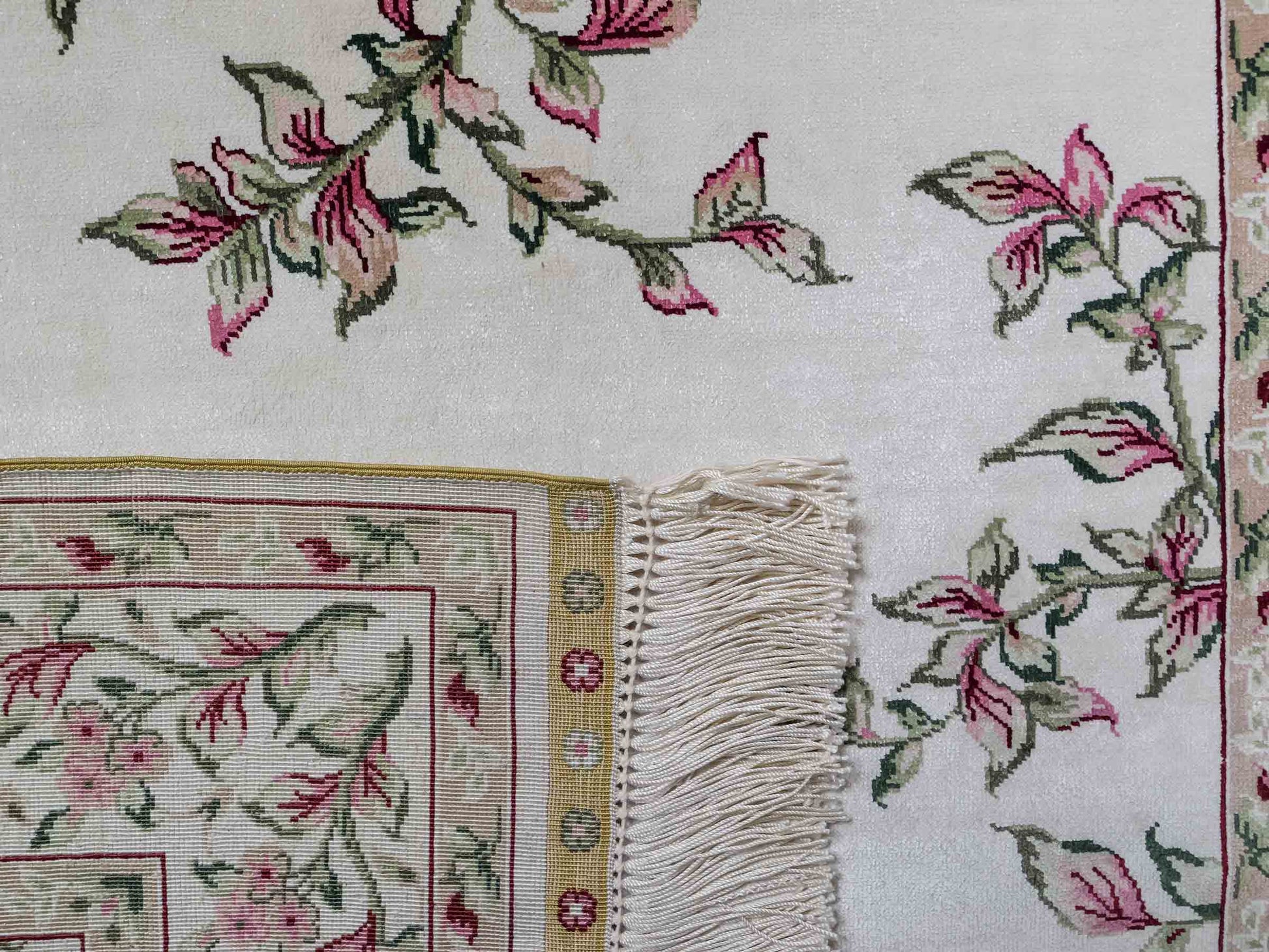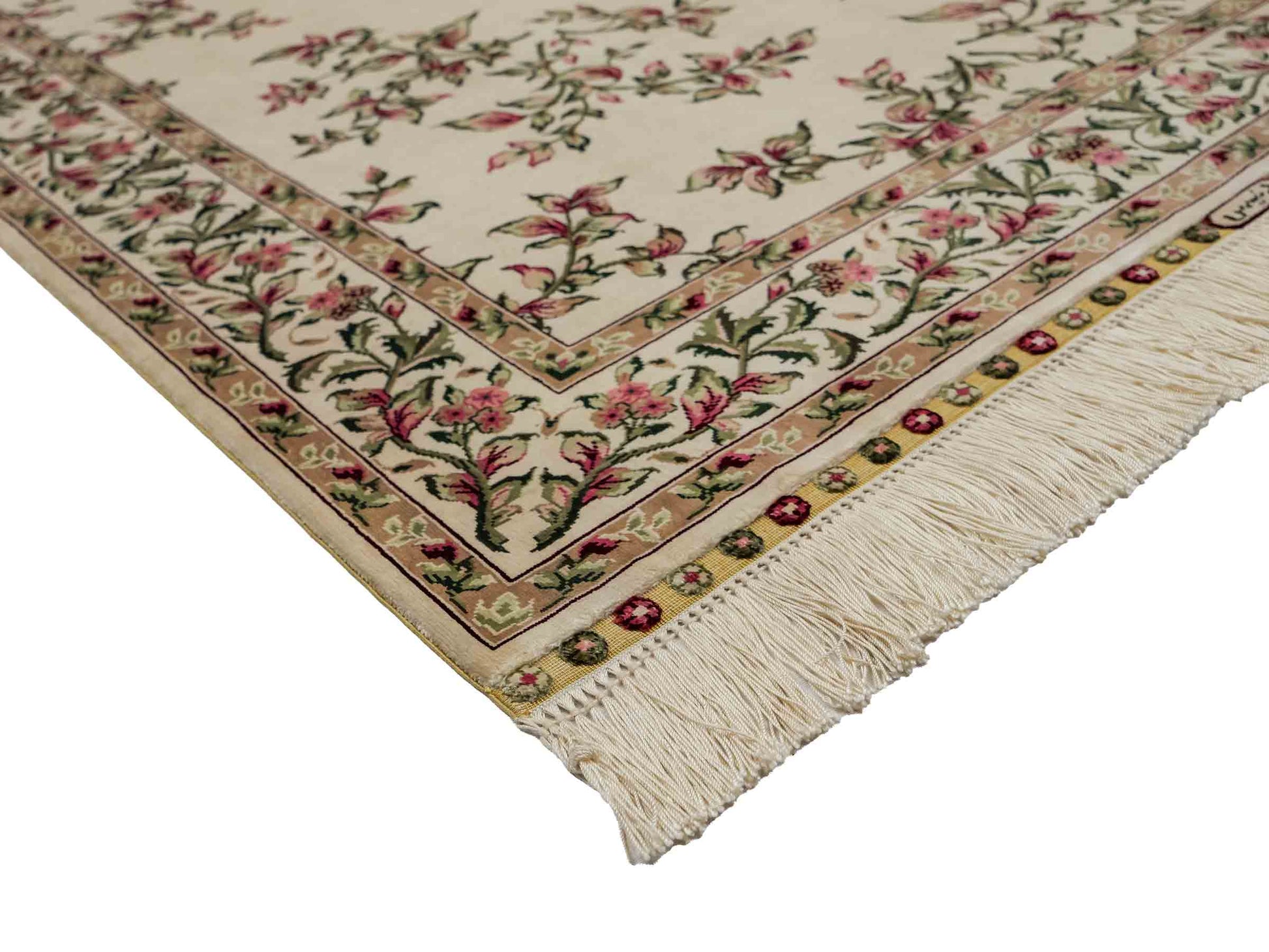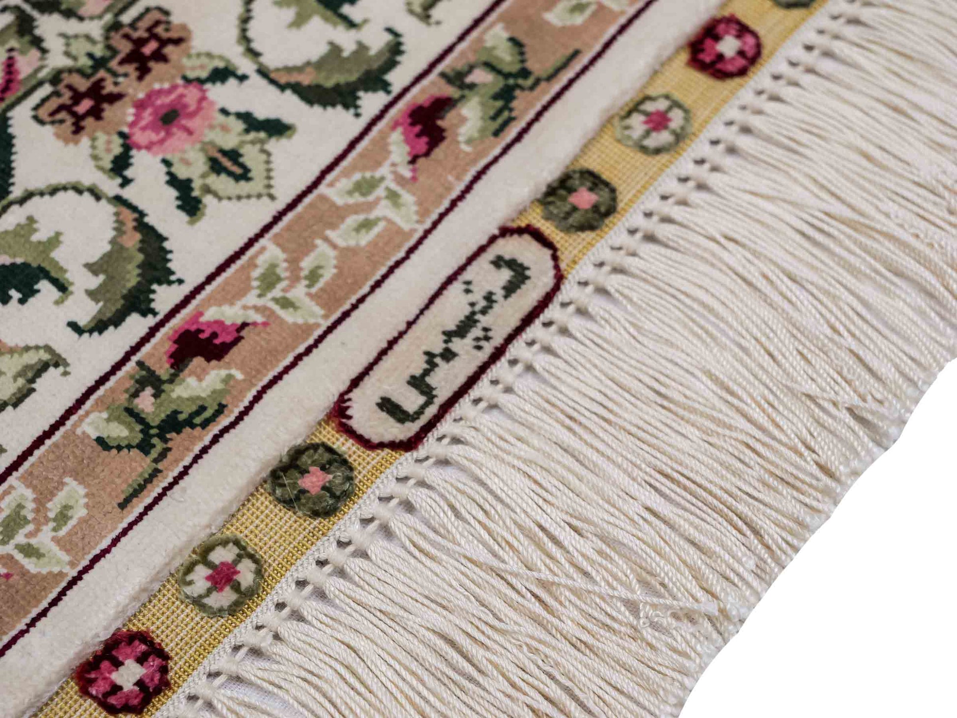 The pile and warp are made of pure silk, which not only grants the rug incredible worth, an unparalleled tactile experience, and breathtaking beauty but also imparts a uniquely shimmering appearance under different angles and lighting conditions.