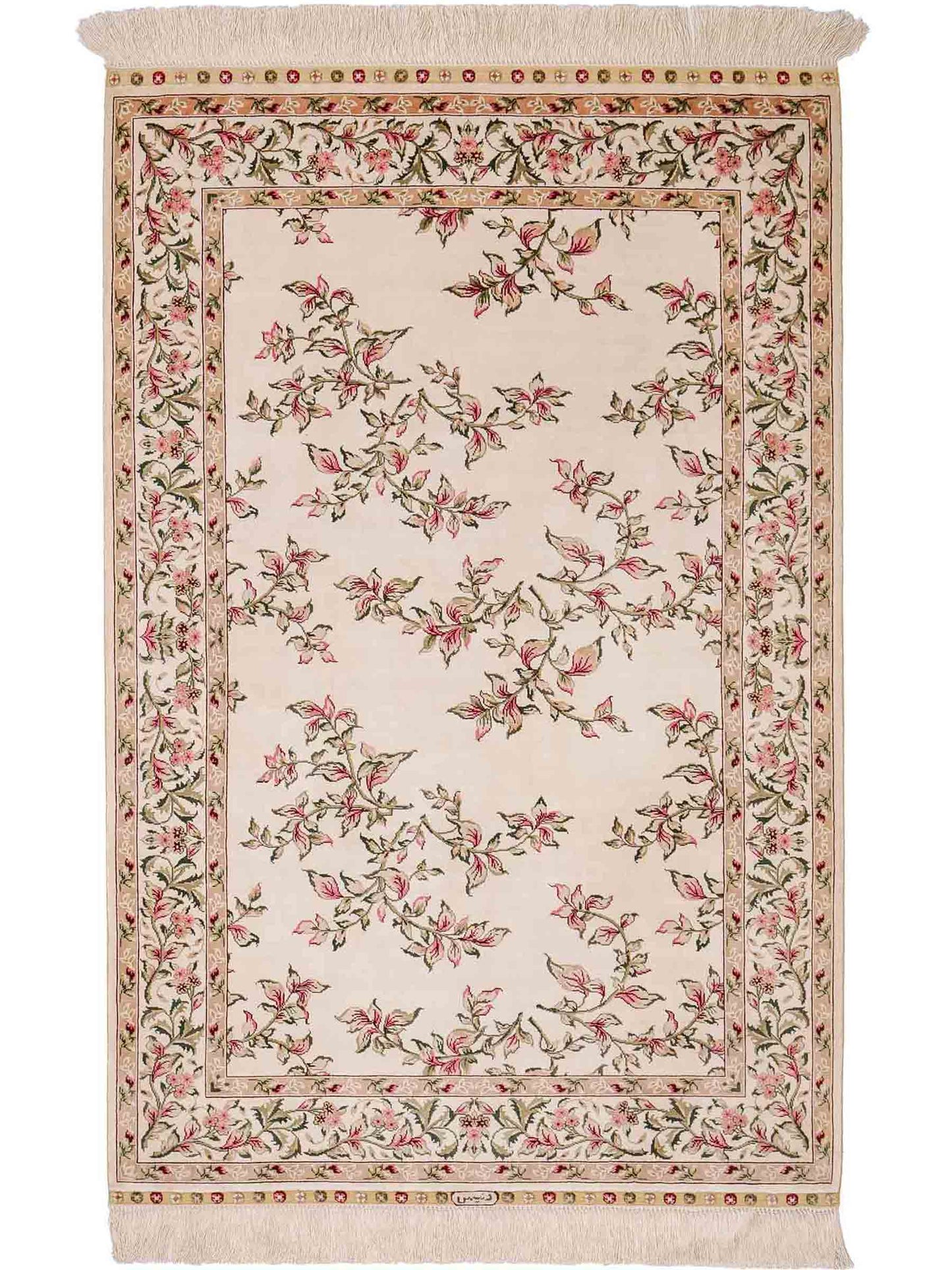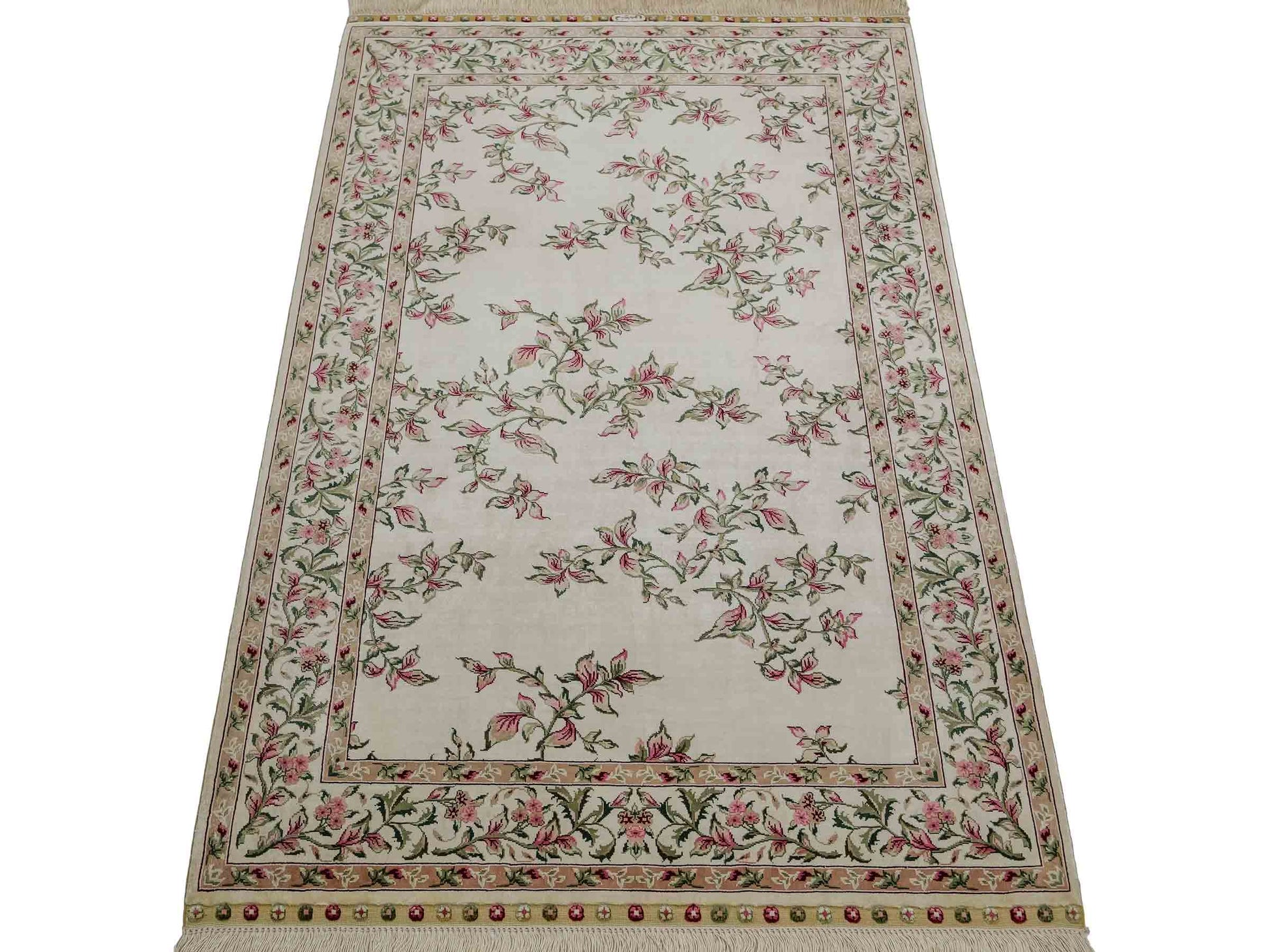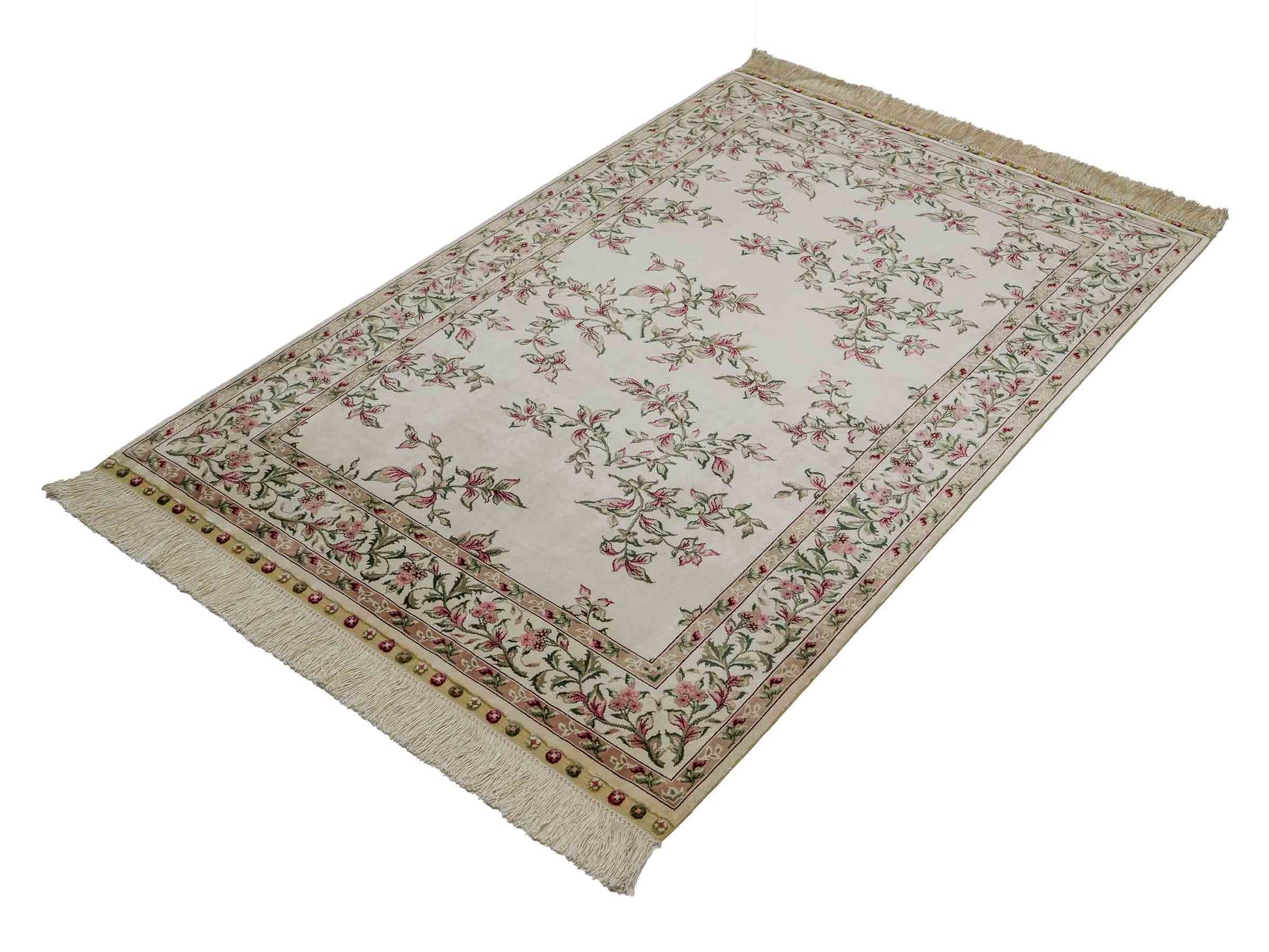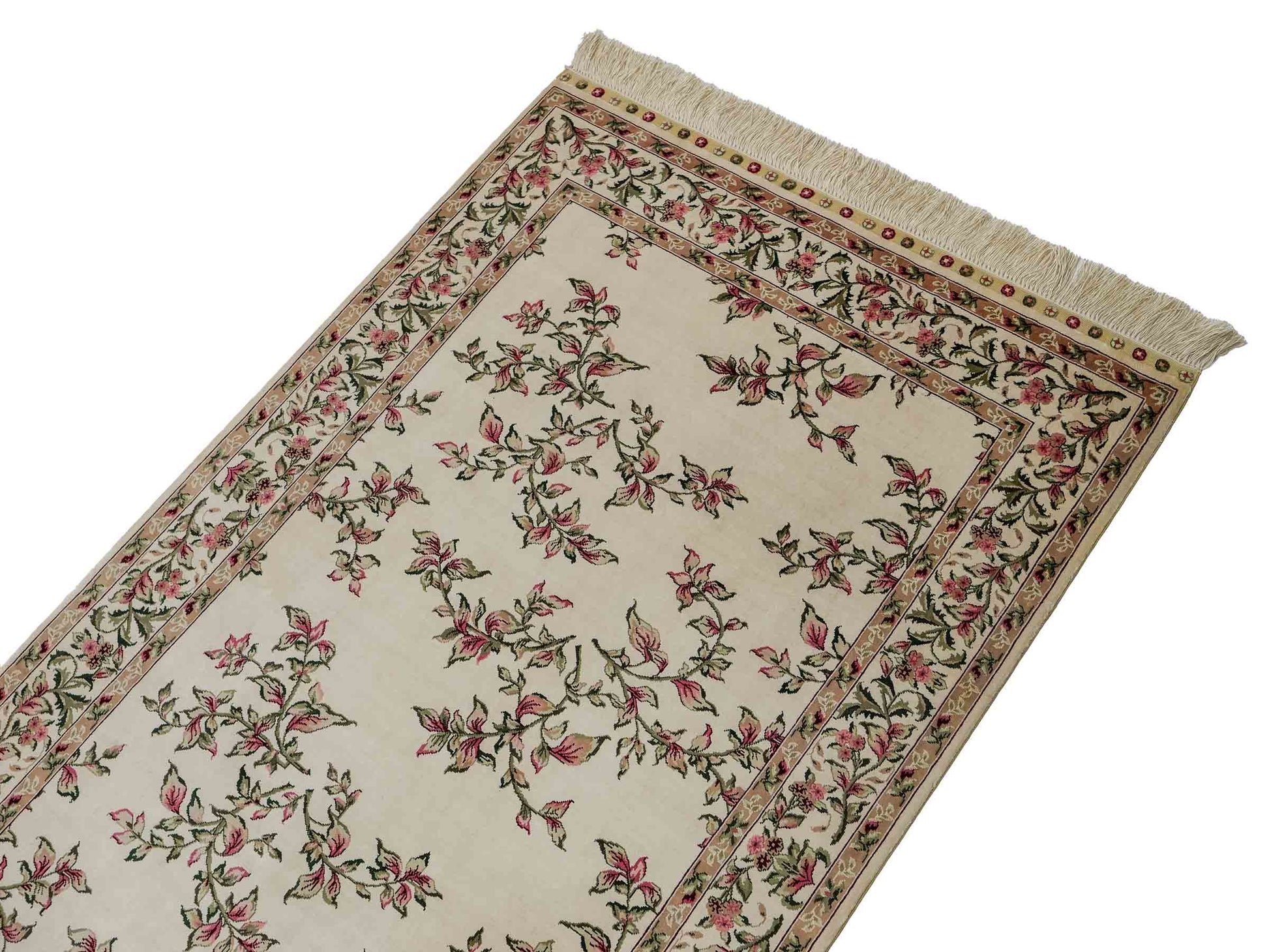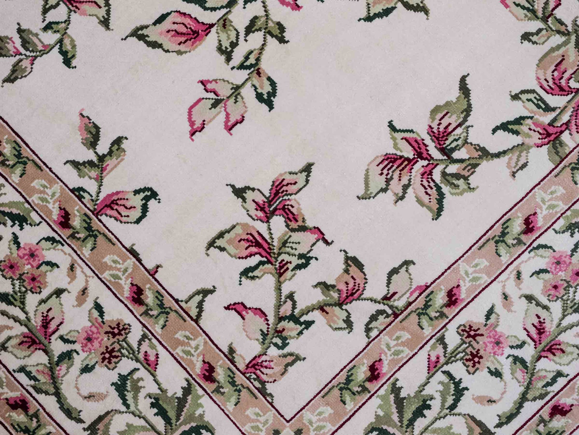 The pile and warp are made of pure silk, which not only grants the rug incredible worth, an unparalleled tactile experience, and breathtaking beauty but also imparts a uniquely shimmering appearance under different angles and lighting conditions.