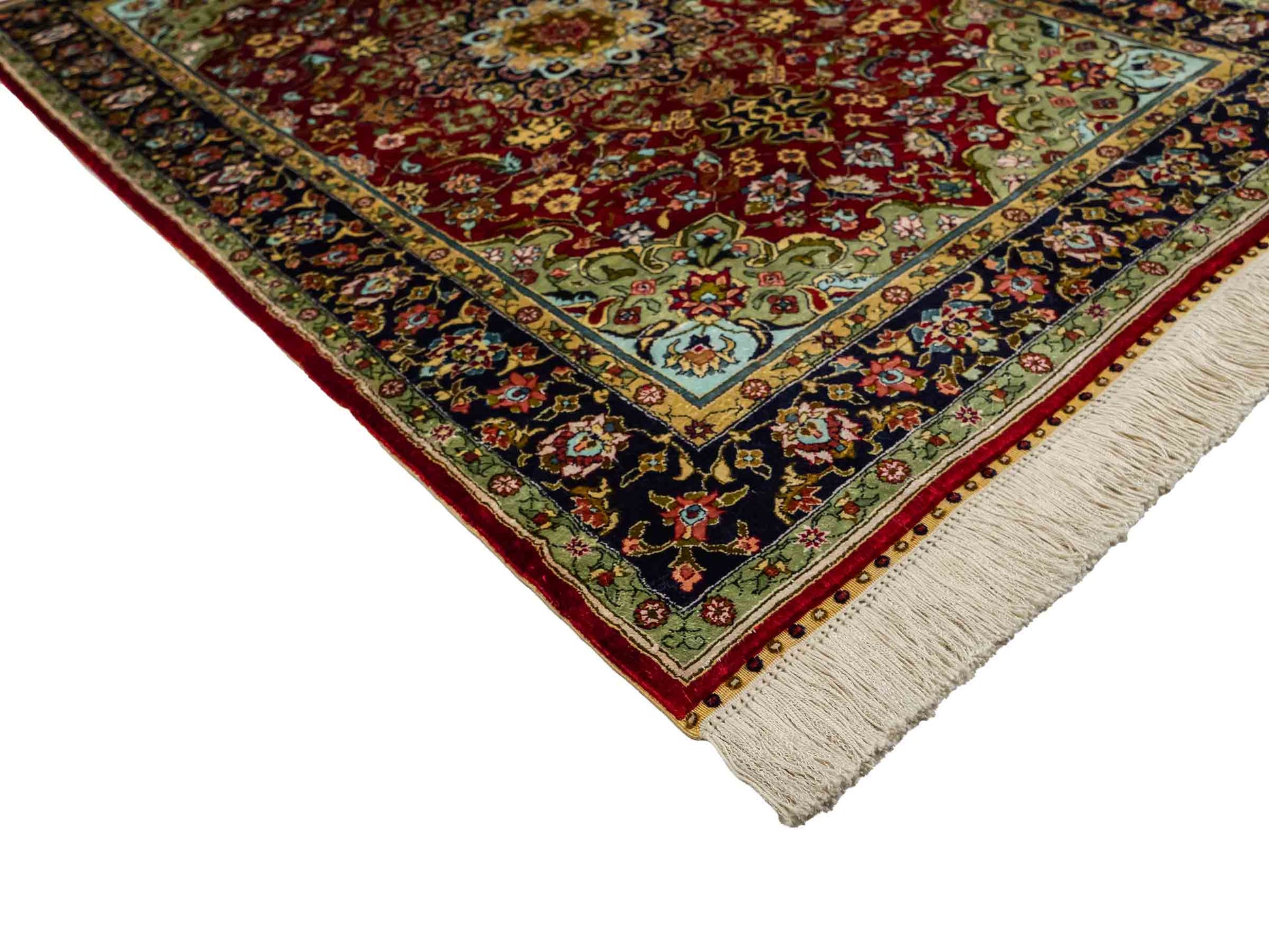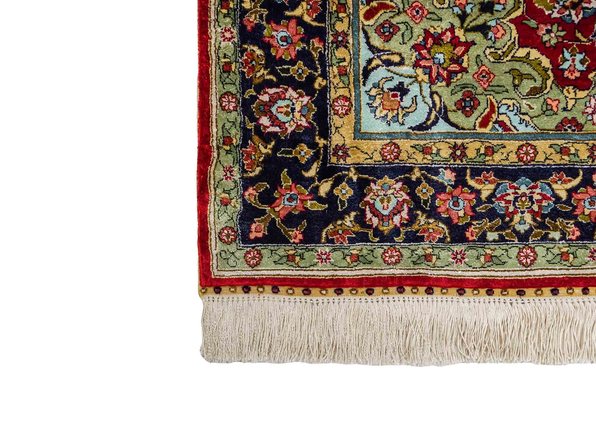 Made from delicate silk, the rug radiates with vivid hues that have been carefully enhanced through meticulous cleaning and dyeing. The luxurious silk and precise handcraftsmanship ensure not only superior quality but also an unrivaled sheen that brightens any space.