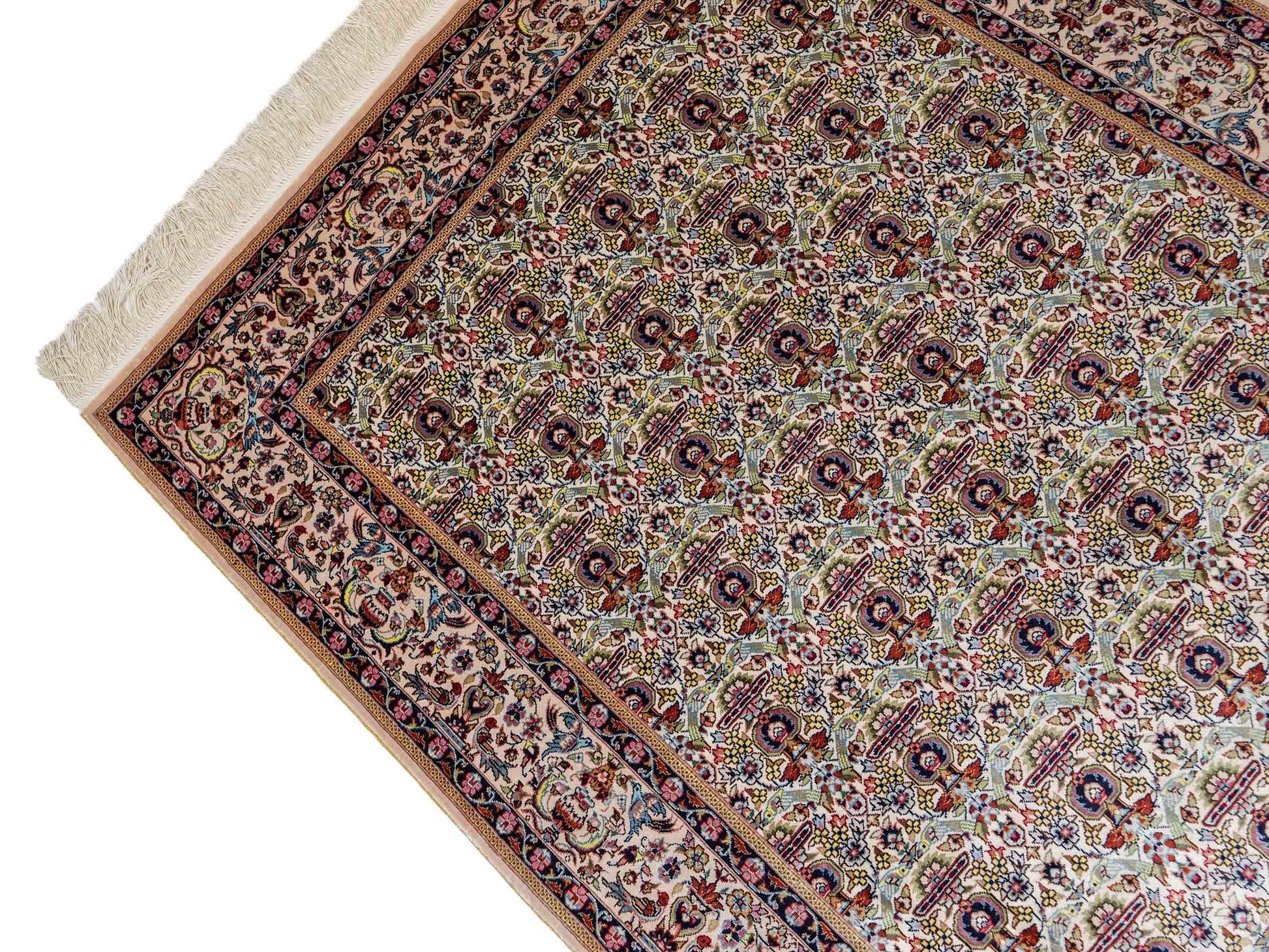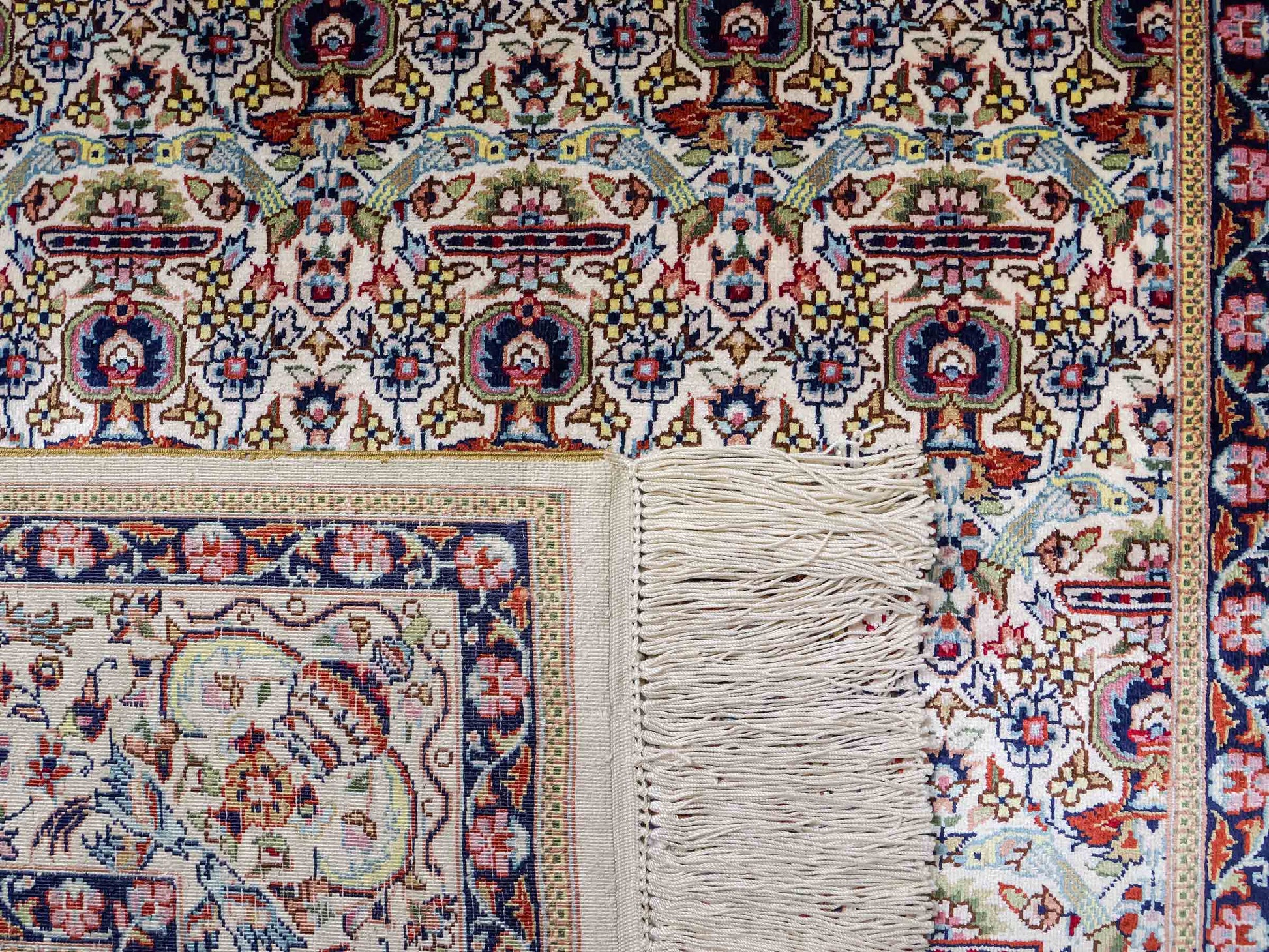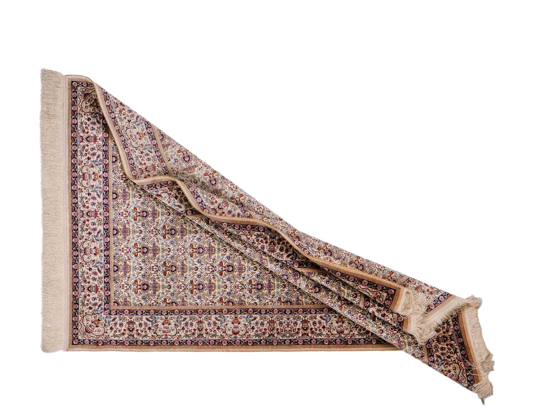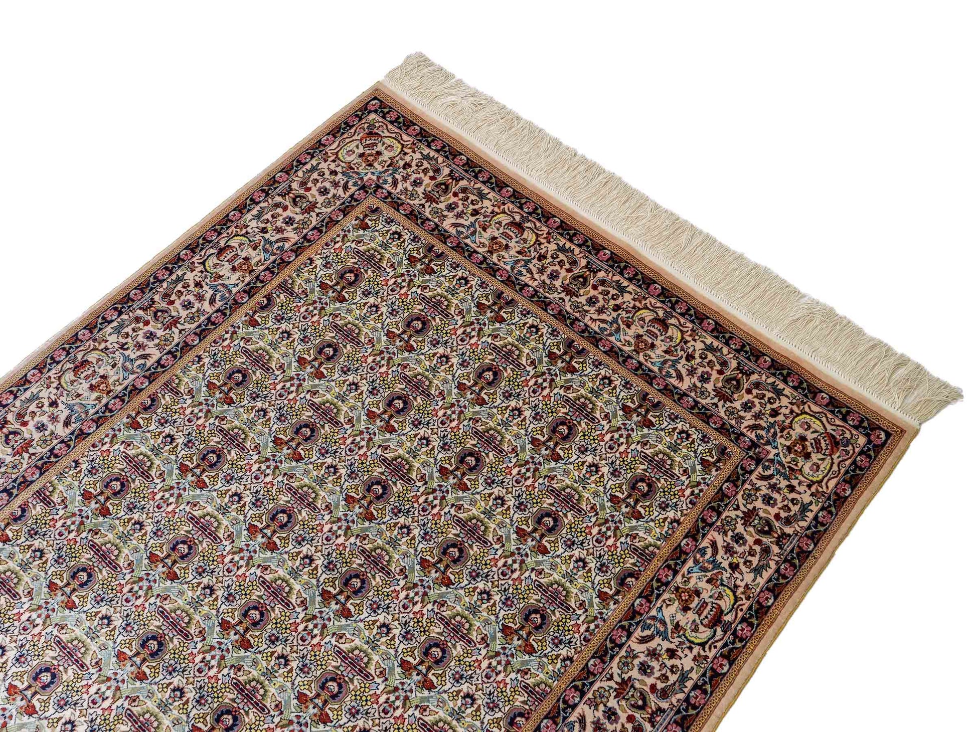 The pile and warp are made of pure silk, which not only grants the rug incredible worth, an unparalleled tactile experience, and breathtaking beauty but also imparts a uniquely shimmering appearance under different angles and lighting conditions.