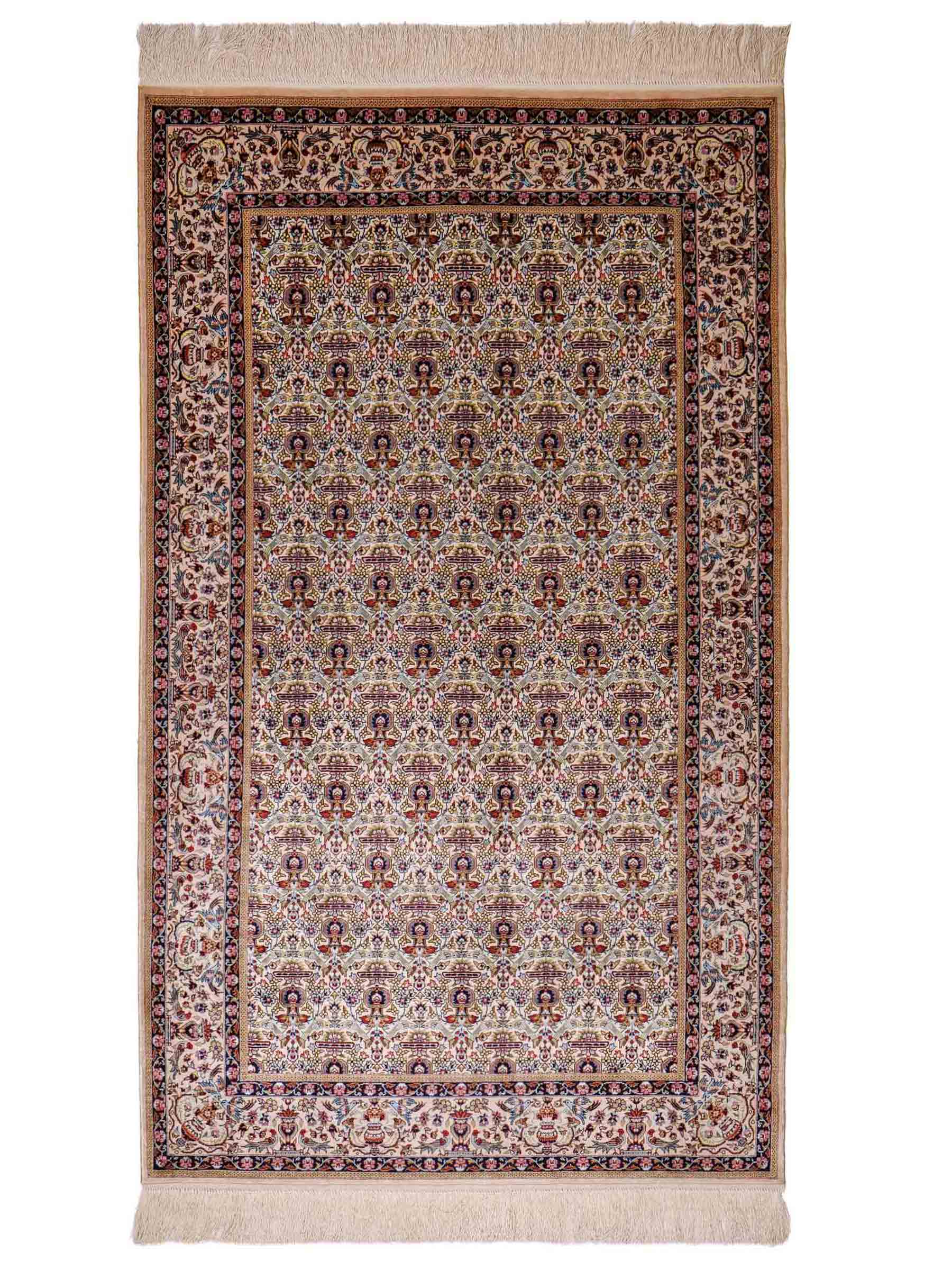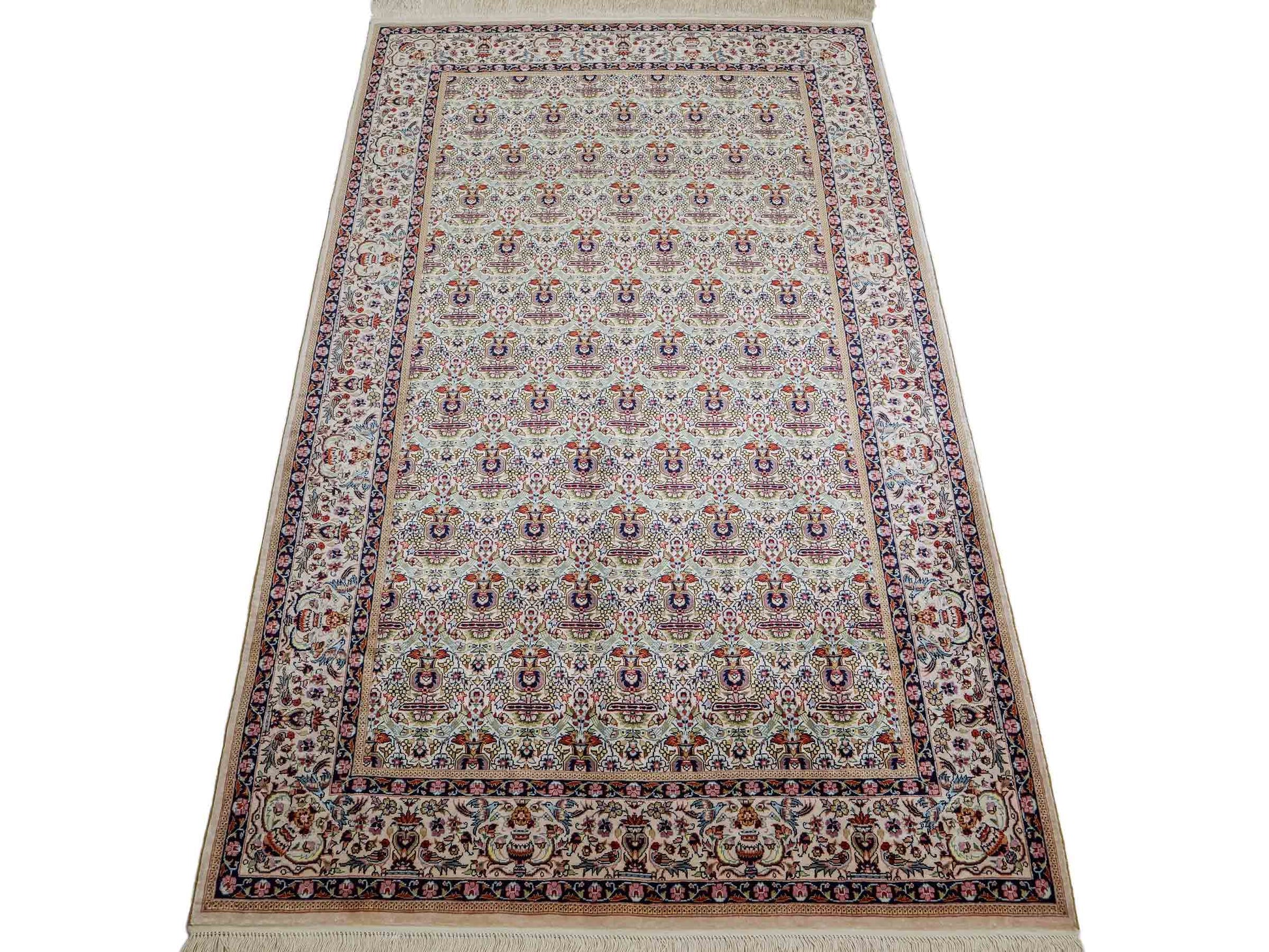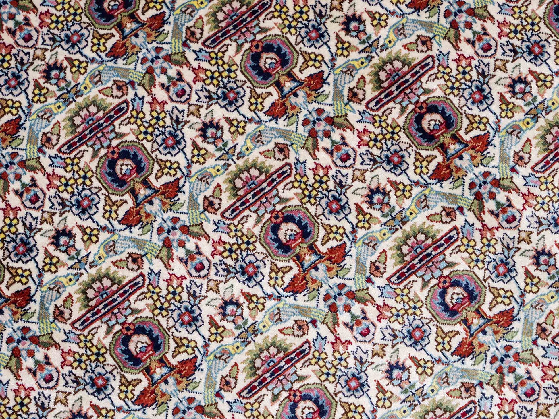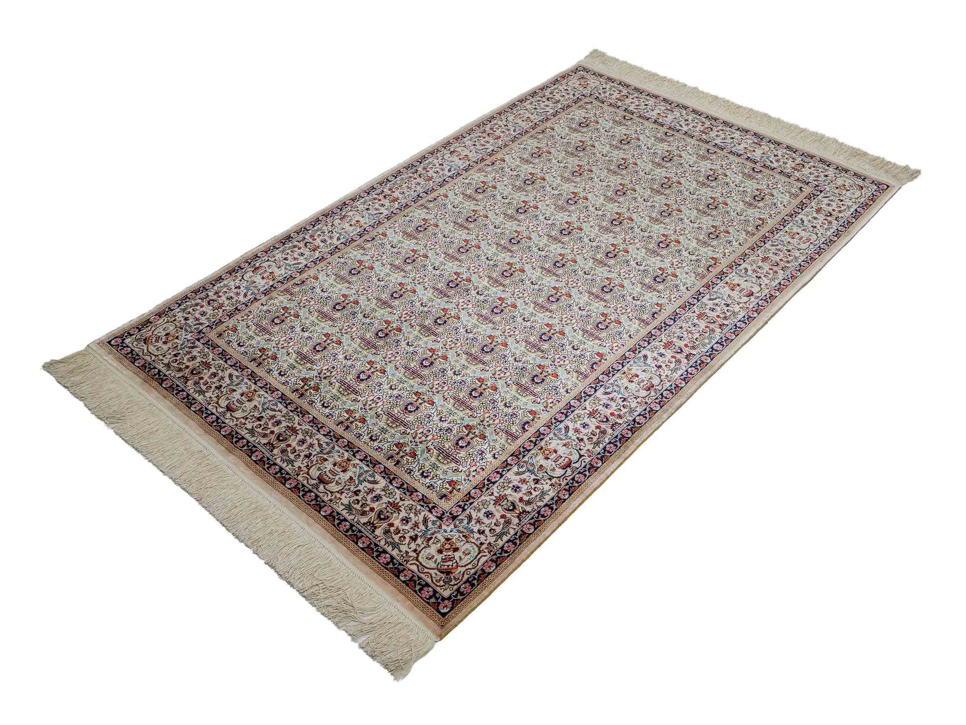 The pile and warp are made of pure silk, which not only grants the rug incredible worth, an unparalleled tactile experience, and breathtaking beauty but also imparts a uniquely shimmering appearance under different angles and lighting conditions.