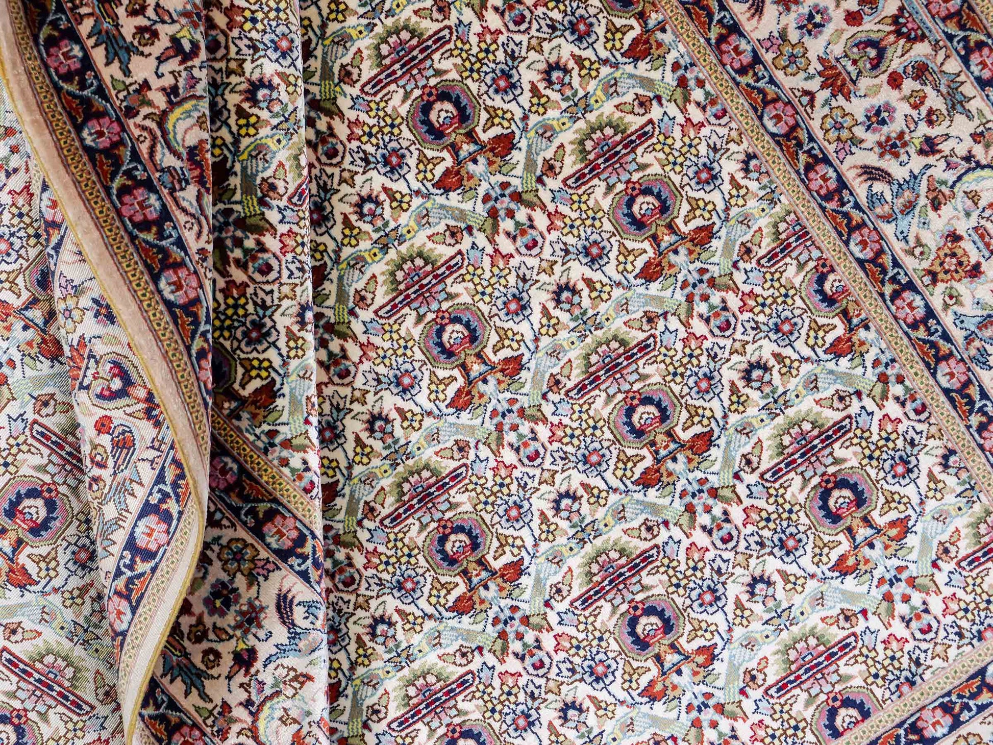 Wool with Silk: These rugs require particularly careful storage, as the combination of wool and silk makes both materials sensitive. Store them in a cool, dry place away from direct sunlight. A constant temperature of about 18 degrees Celsius is ideal. Use breathable cotton dust covers to protect the rug while ensuring ventilation. Regular inspections help to detect mold and pests early.