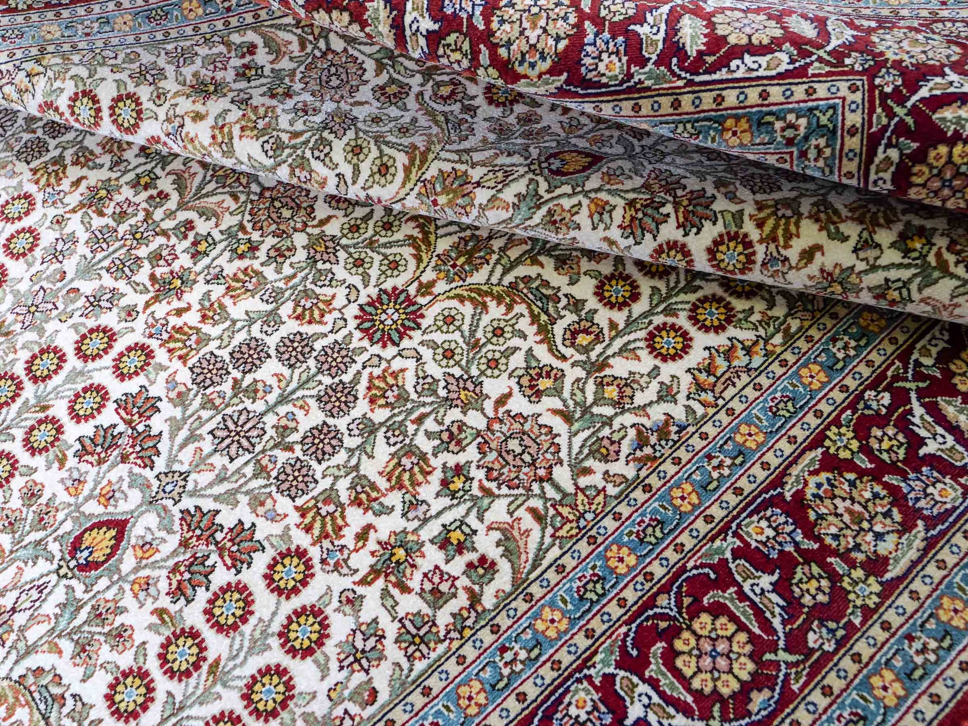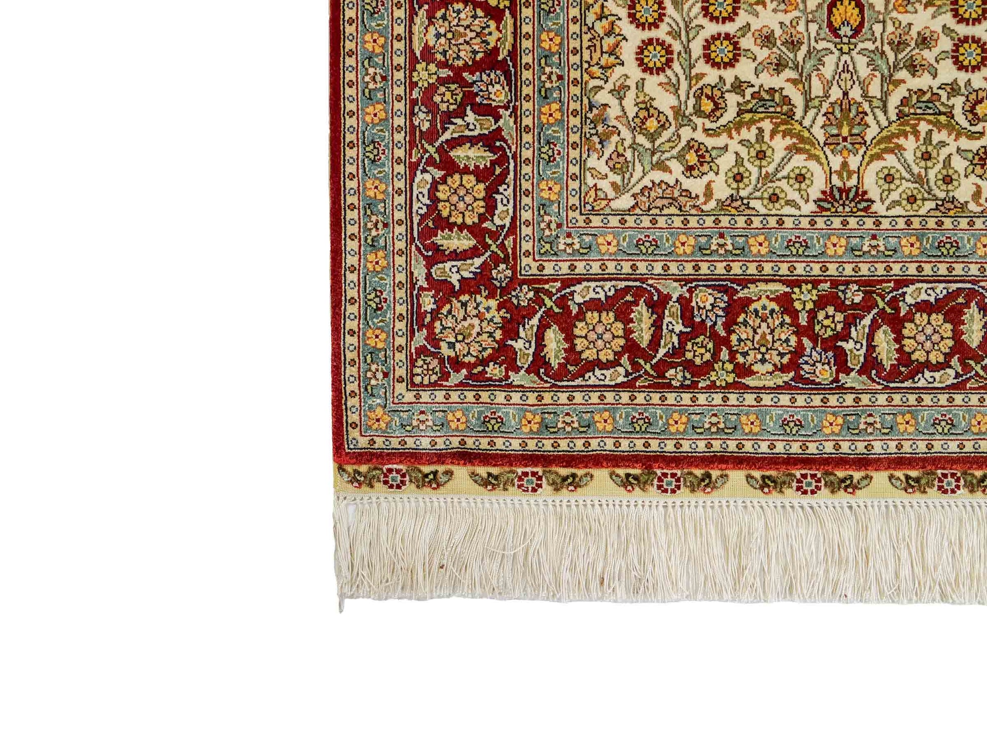 The pile and warp are made of pure silk, which not only grants the rug incredible worth, an unparalleled tactile experience, and breathtaking beauty but also imparts a uniquely shimmering appearance under different angles and lighting conditions.