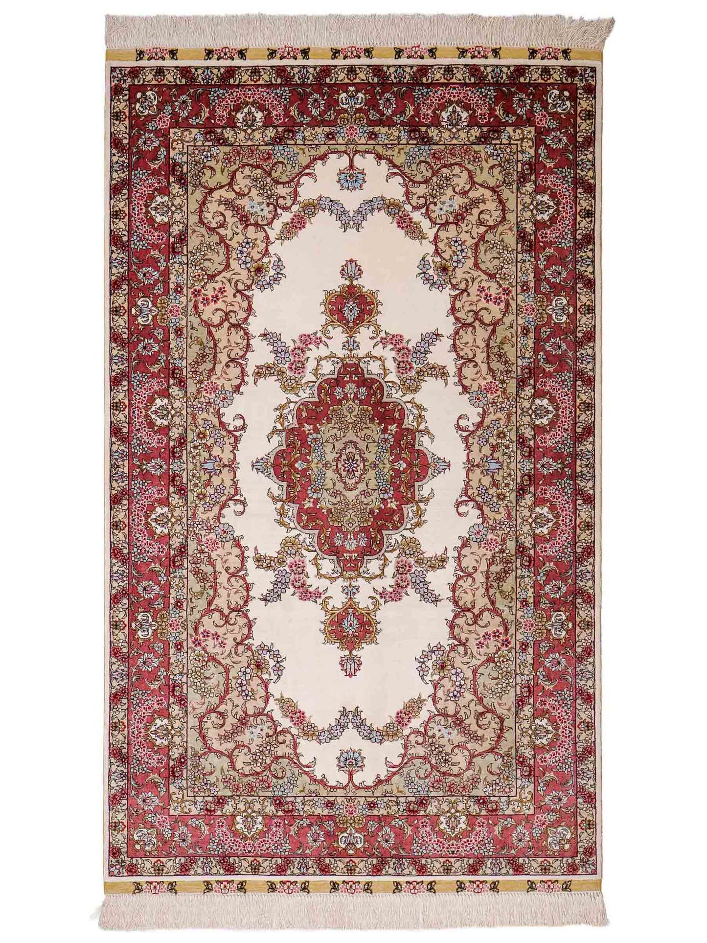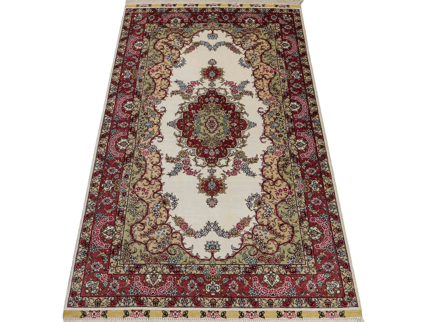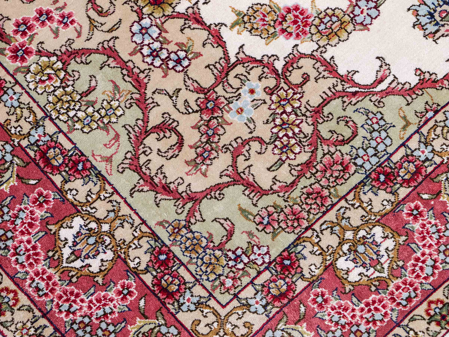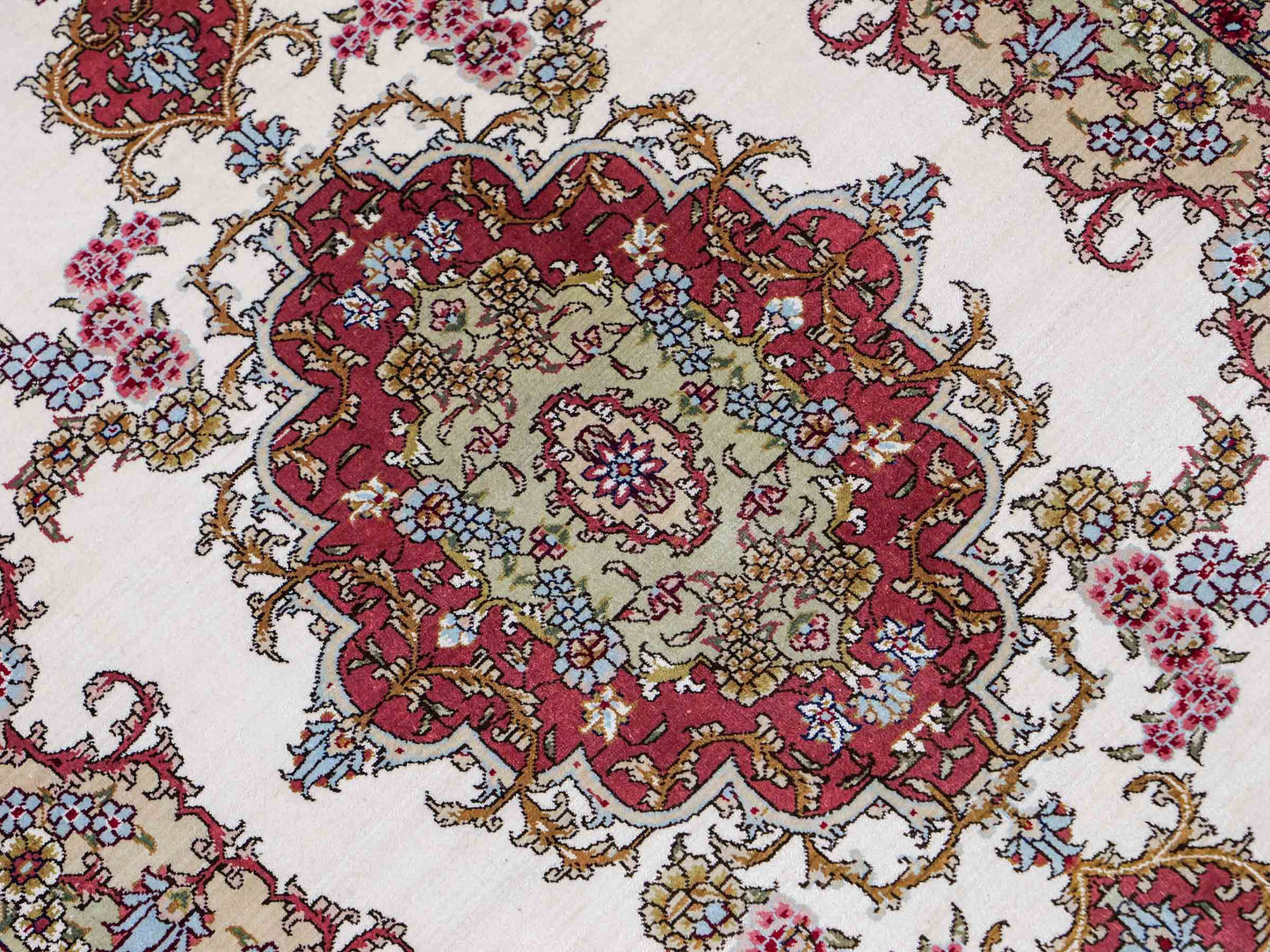 The pile and warp are made of pure silk, which not only grants the rug incredible worth, an unparalleled tactile experience, and breathtaking beauty but also imparts a uniquely shimmering appearance under different angles and lighting conditions.
