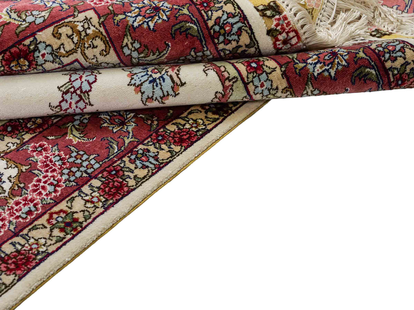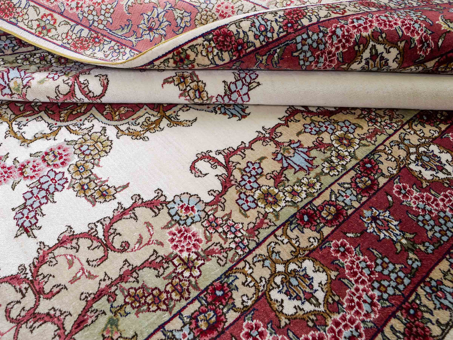 Wool with Silk: These rugs require particularly careful storage, as the combination of wool and silk makes both materials sensitive. Store them in a cool, dry place away from direct sunlight. A constant temperature of about 18 degrees Celsius is ideal. Use breathable cotton dust covers to protect the rug while ensuring ventilation. Regular inspections help to detect mold and pests early.