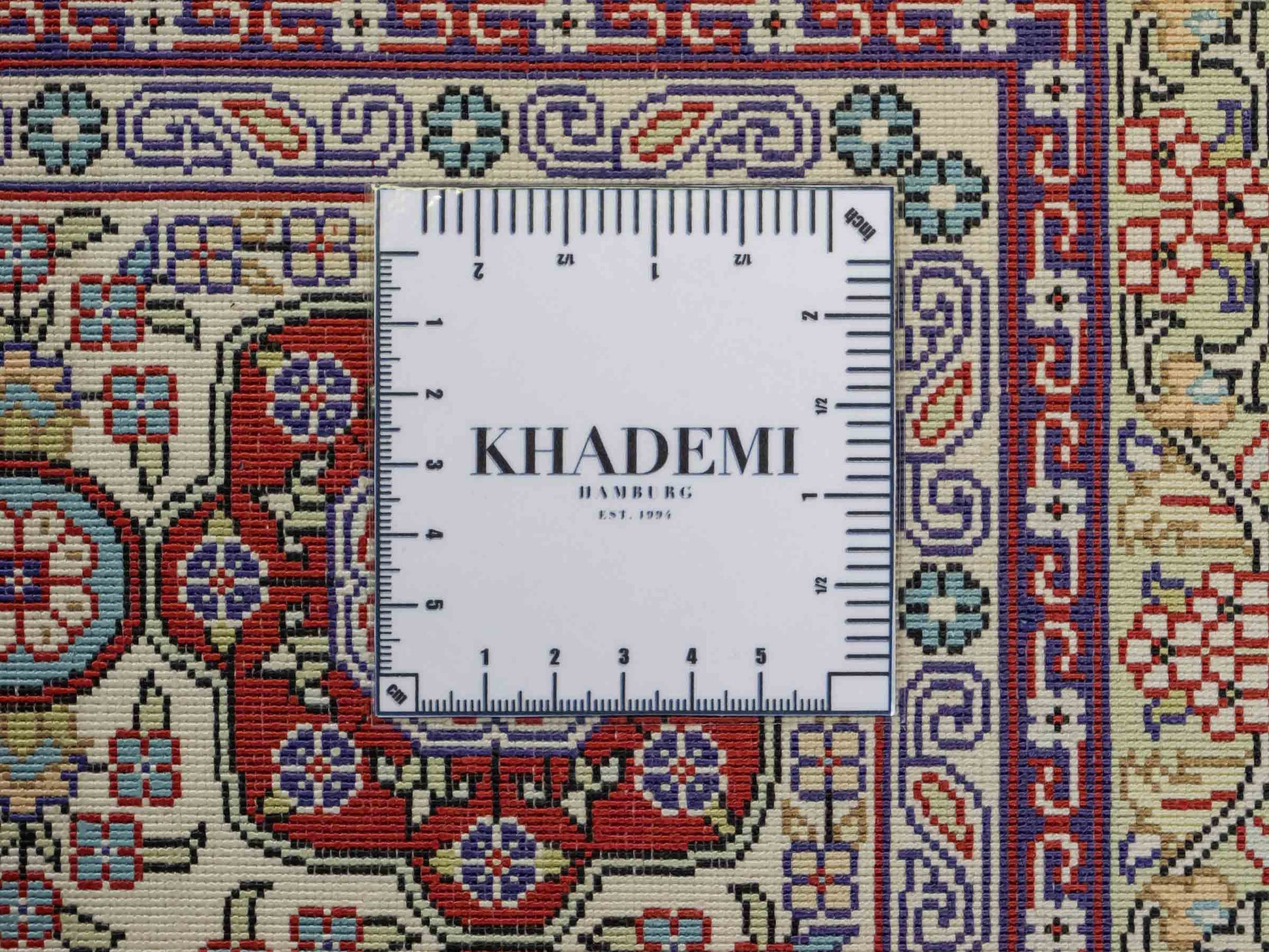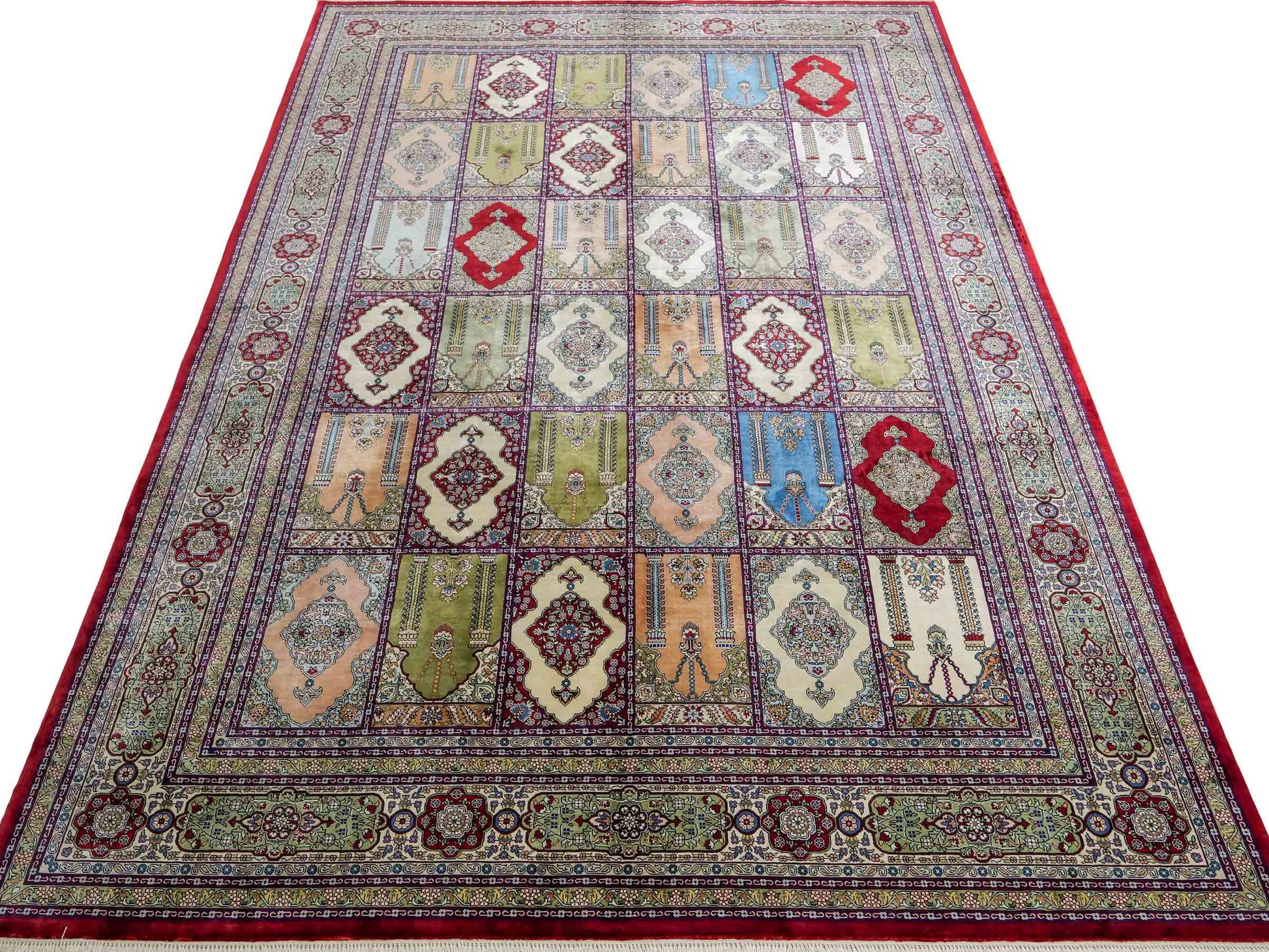 The pile and warp are made of pure silk, which not only grants the rug incredible worth, an unparalleled tactile experience, and breathtaking beauty but also imparts a uniquely shimmering appearance under different angles and lighting conditions.