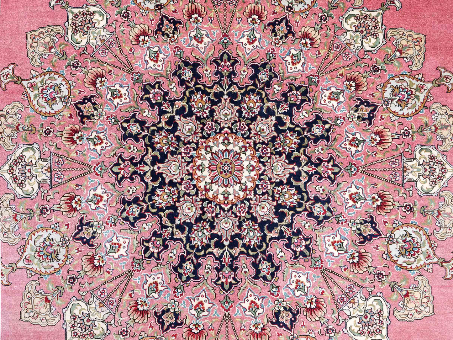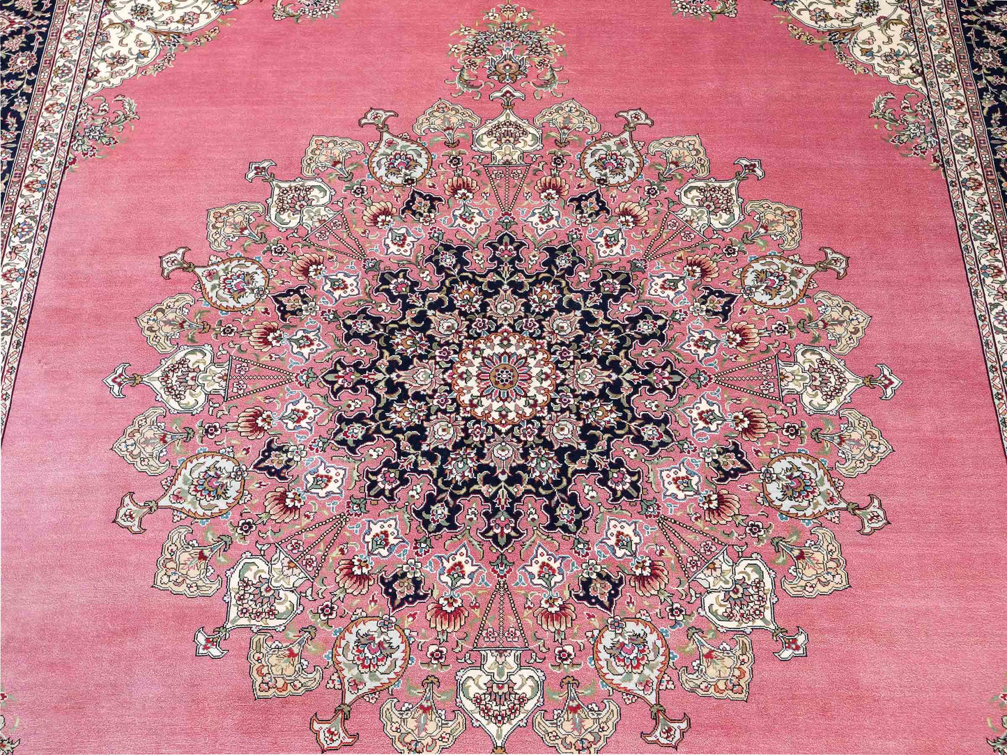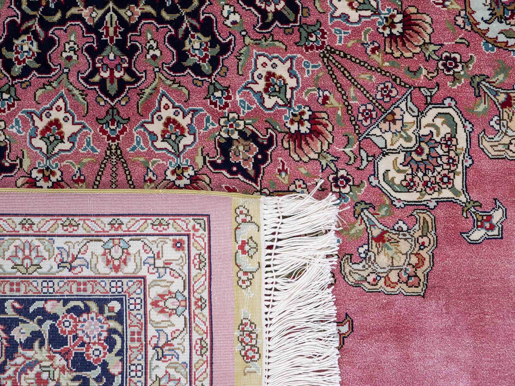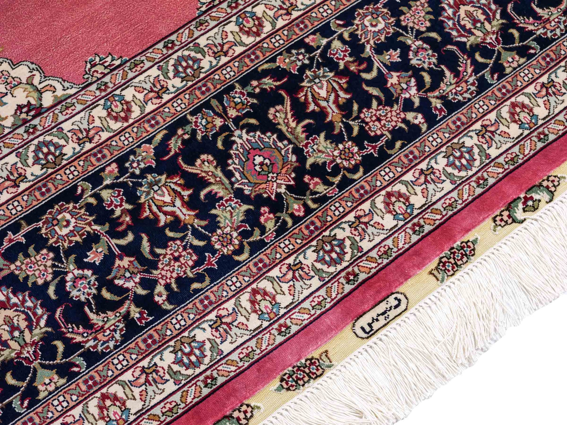 The pile and warp are made of pure silk, which not only grants the rug incredible worth, an unparalleled tactile experience, and breathtaking beauty but also imparts a uniquely shimmering appearance under different angles and lighting conditions.