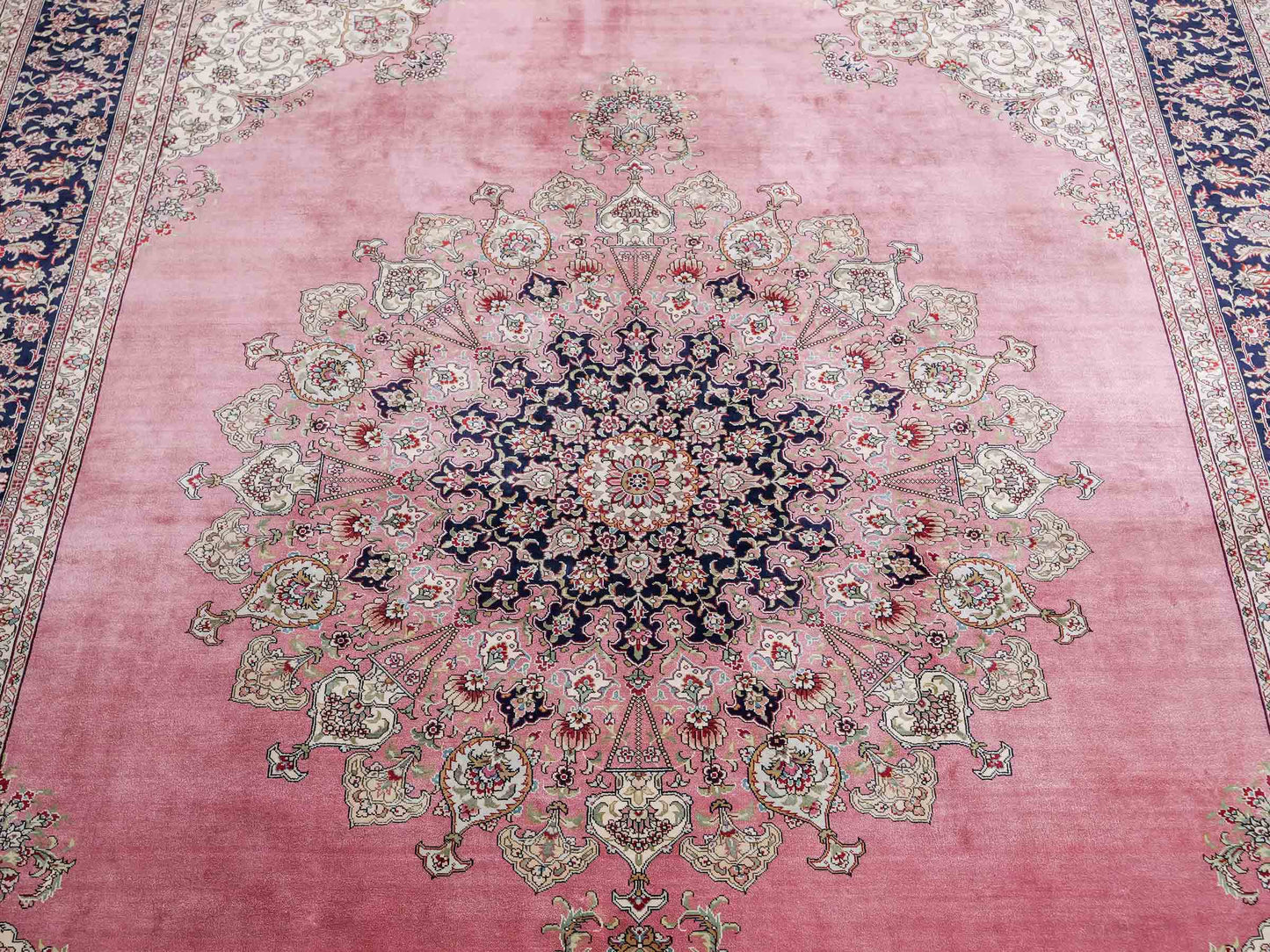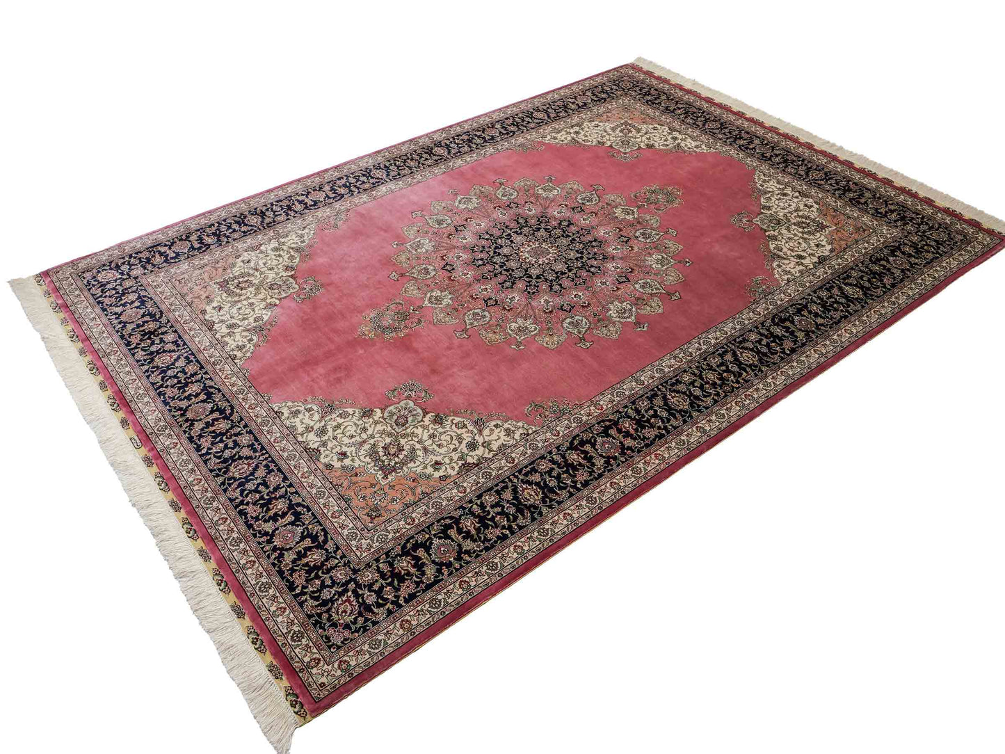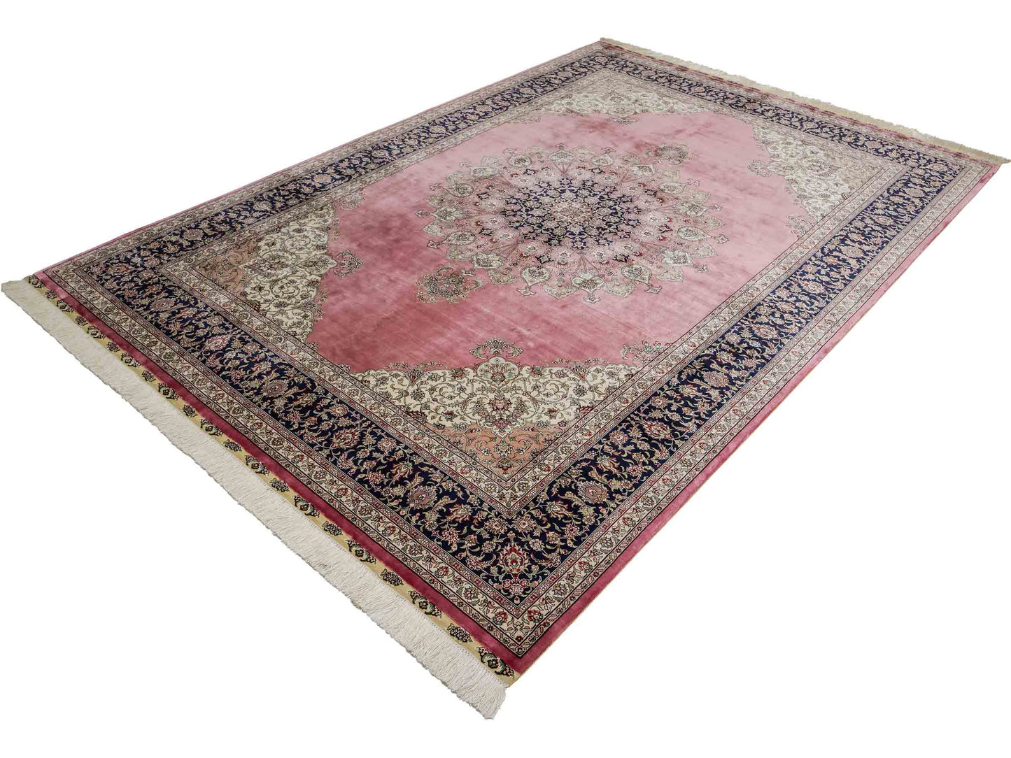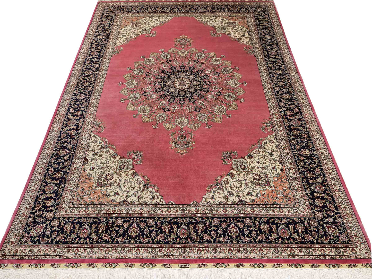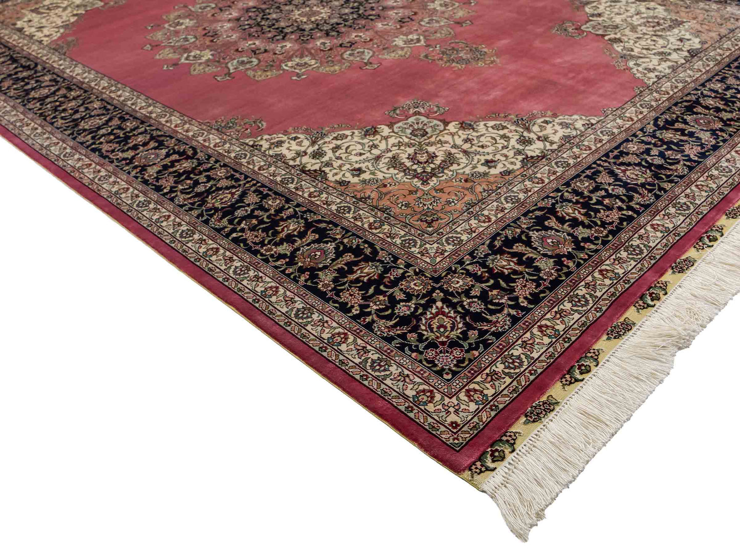 The pile and warp are made of pure silk, which not only grants the rug incredible worth, an unparalleled tactile experience, and breathtaking beauty but also imparts a uniquely shimmering appearance under different angles and lighting conditions.
