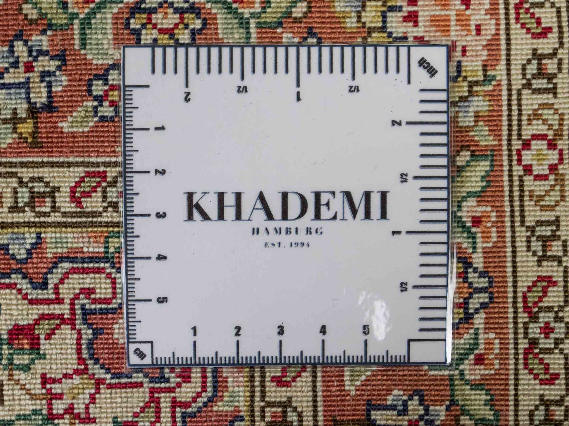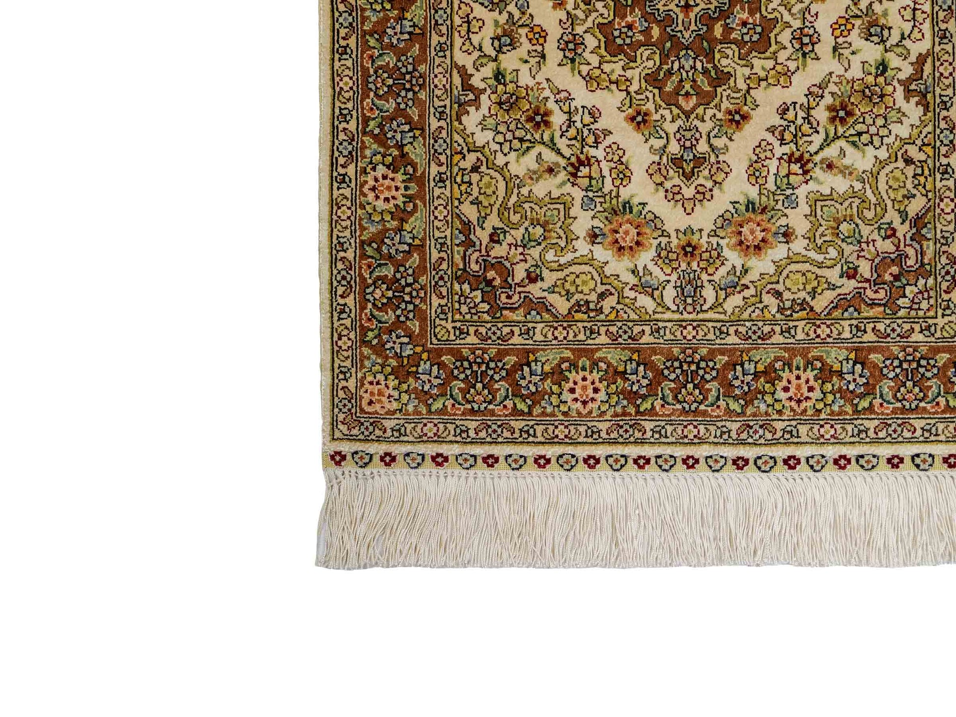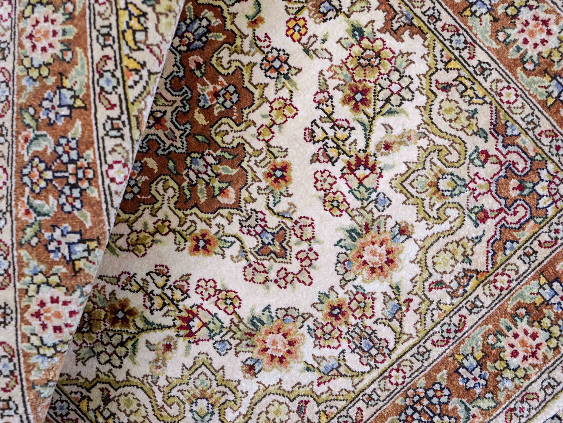 The pile and warp are made of pure silk, which not only grants the rug incredible worth, an unparalleled tactile experience, and breathtaking beauty but also imparts a uniquely shimmering appearance under different angles and lighting conditions.