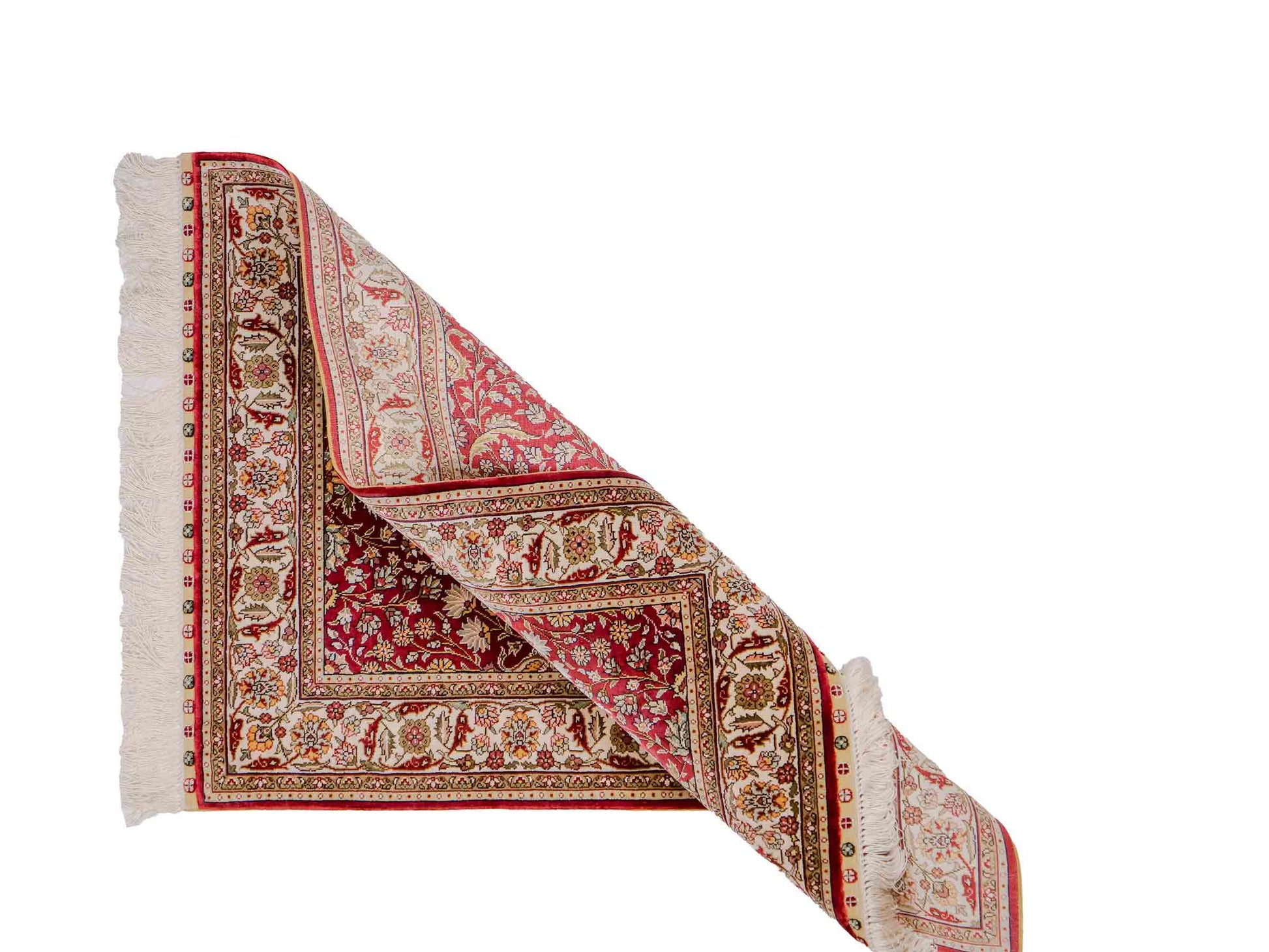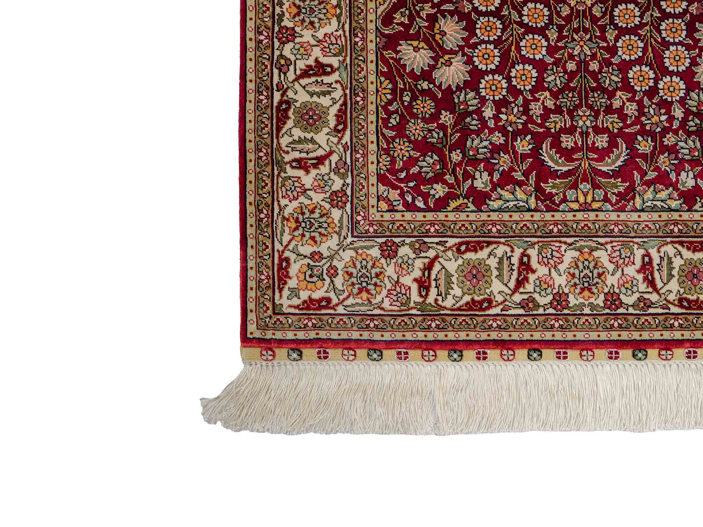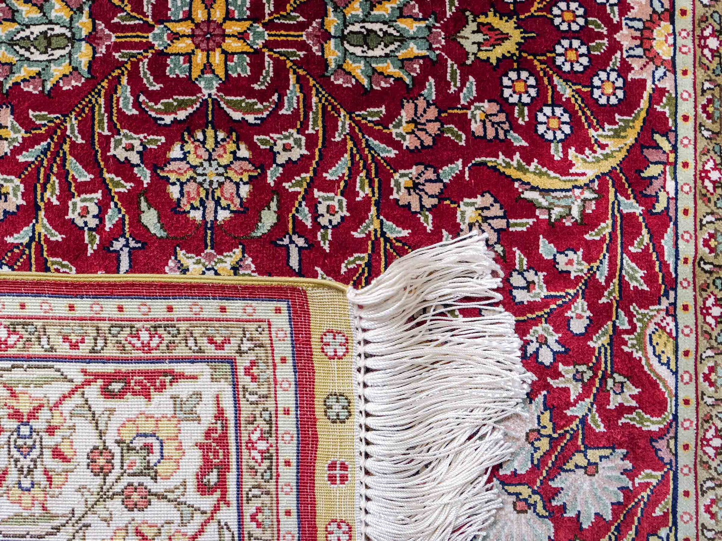 The pile and warp are made of pure silk, which not only grants the rug incredible worth, an unparalleled tactile experience, and breathtaking beauty but also imparts a uniquely shimmering appearance under different angles and lighting conditions.