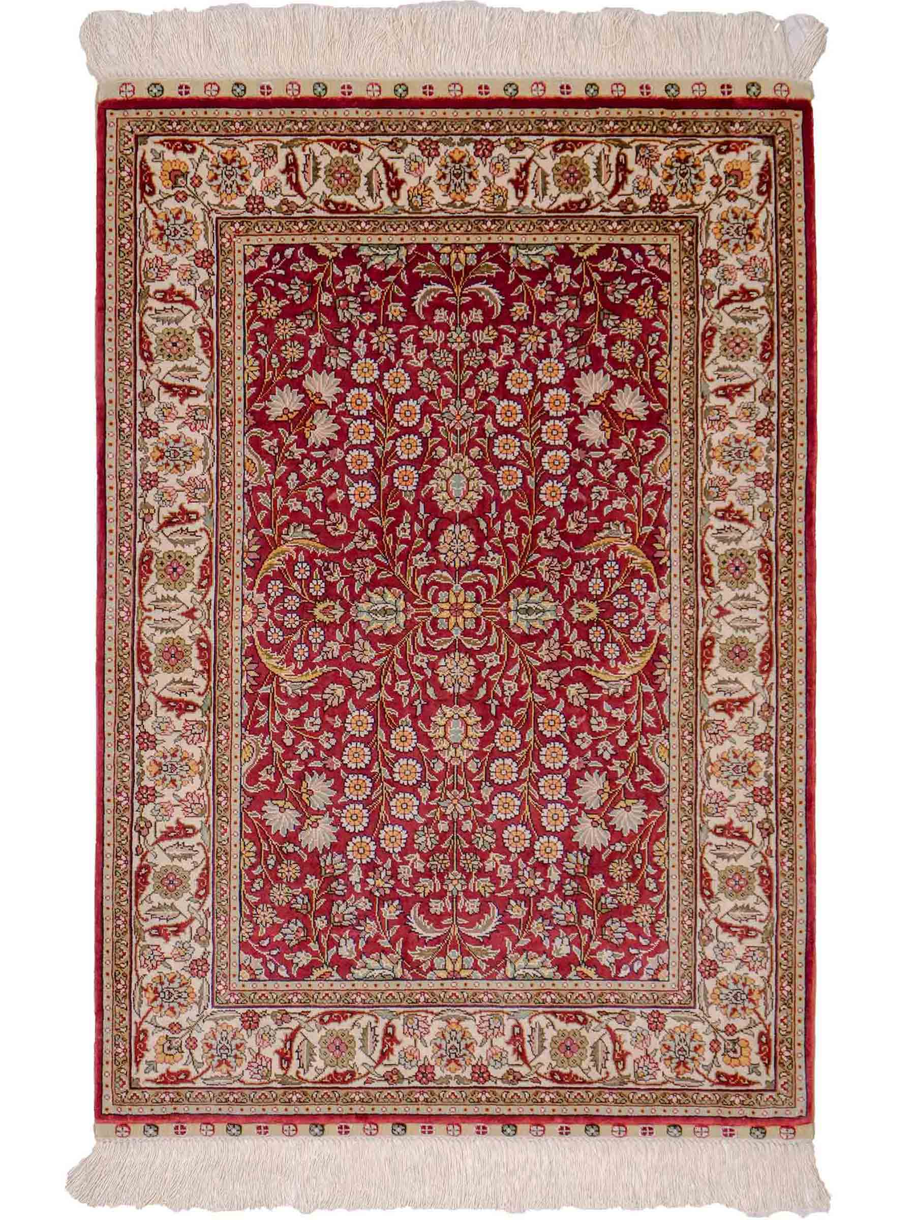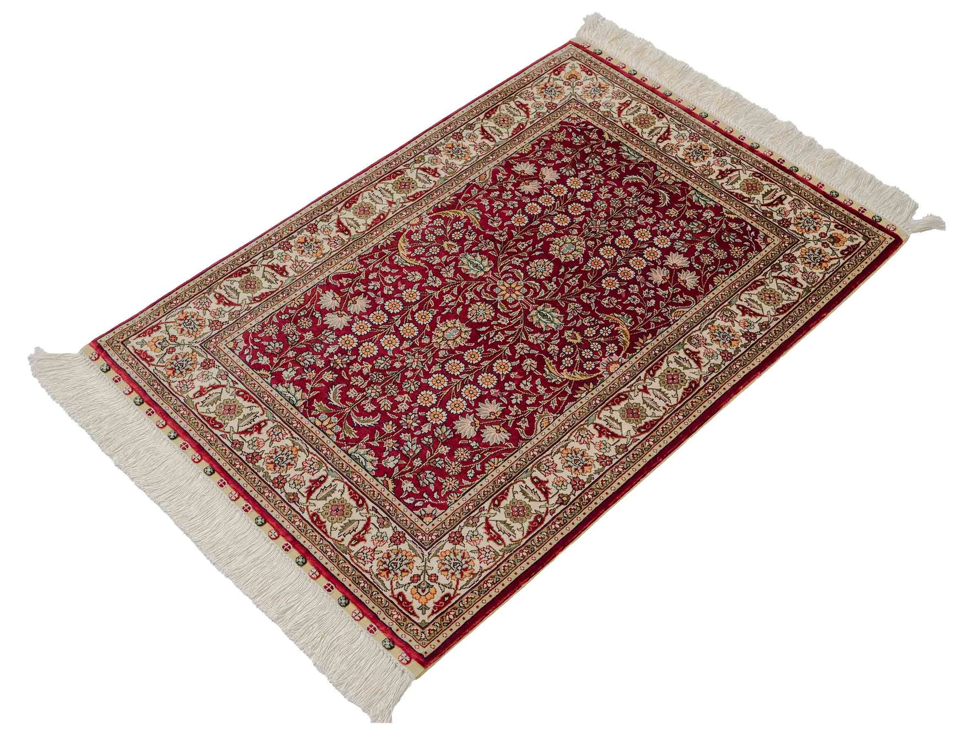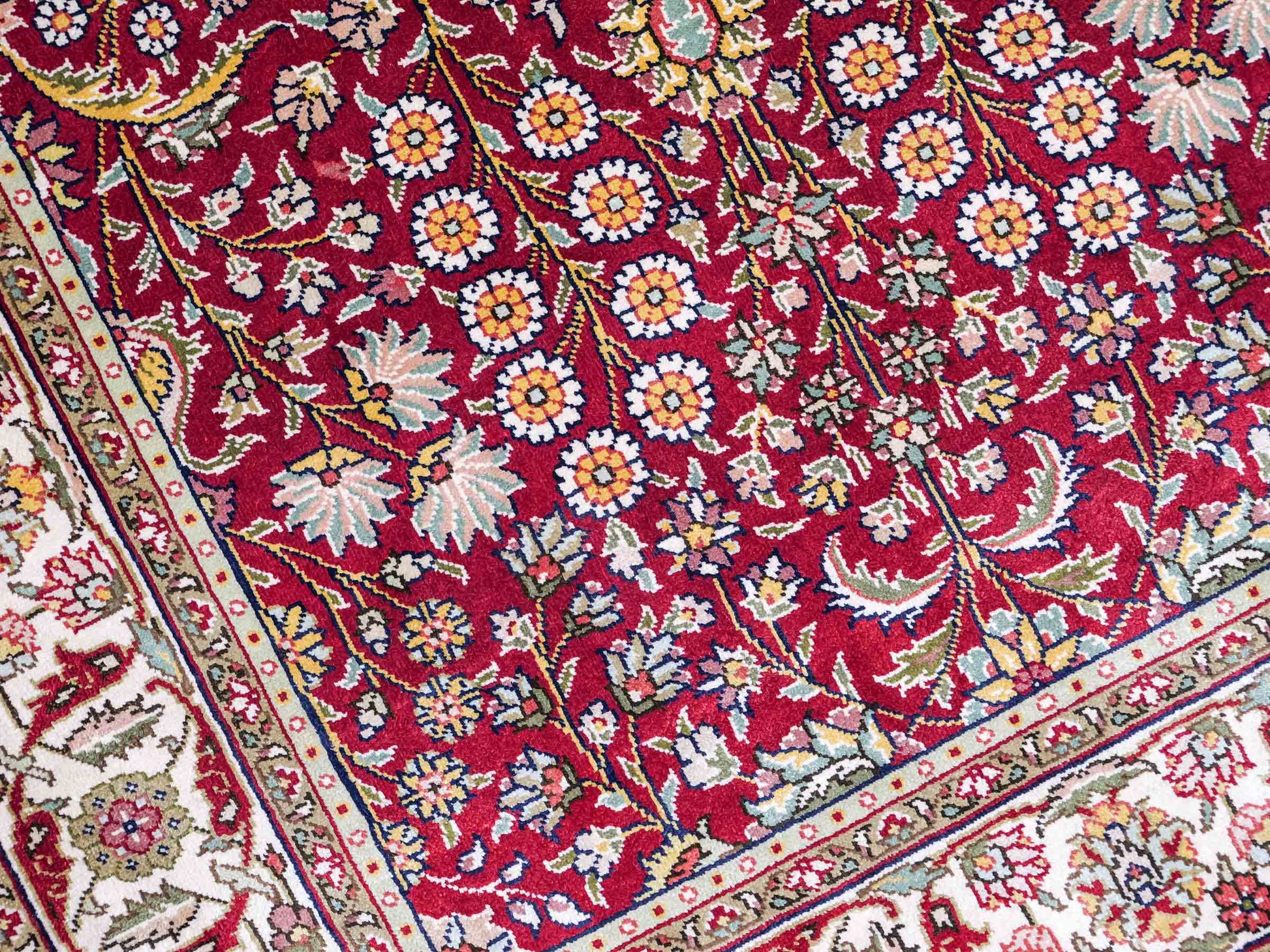 The pile and warp are made of pure silk, which not only grants the rug incredible worth, an unparalleled tactile experience, and breathtaking beauty but also imparts a uniquely shimmering appearance under different angles and lighting conditions.