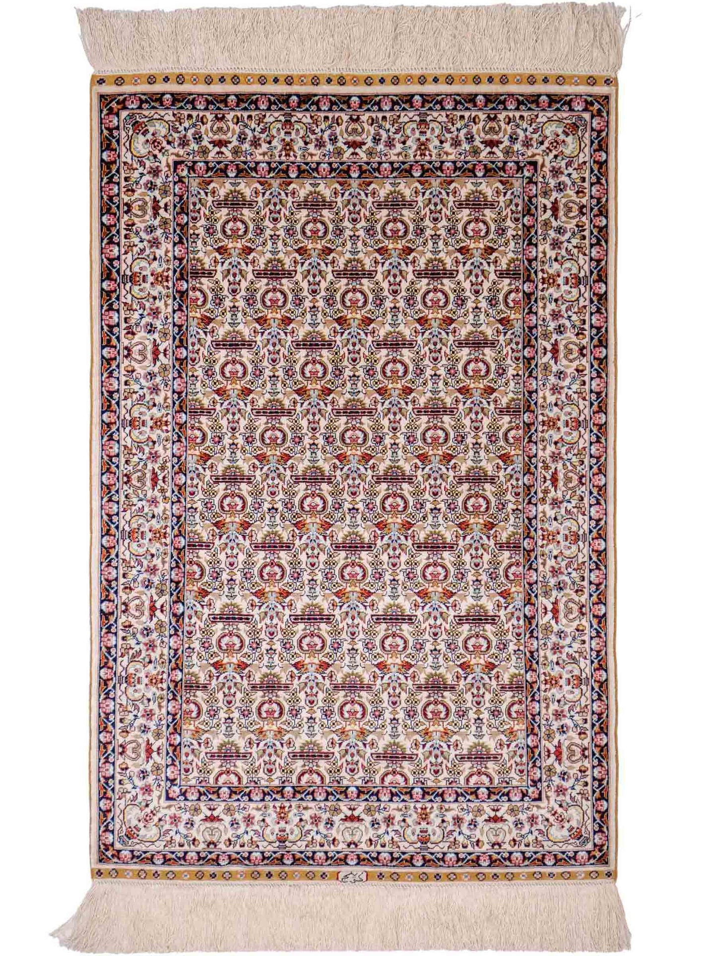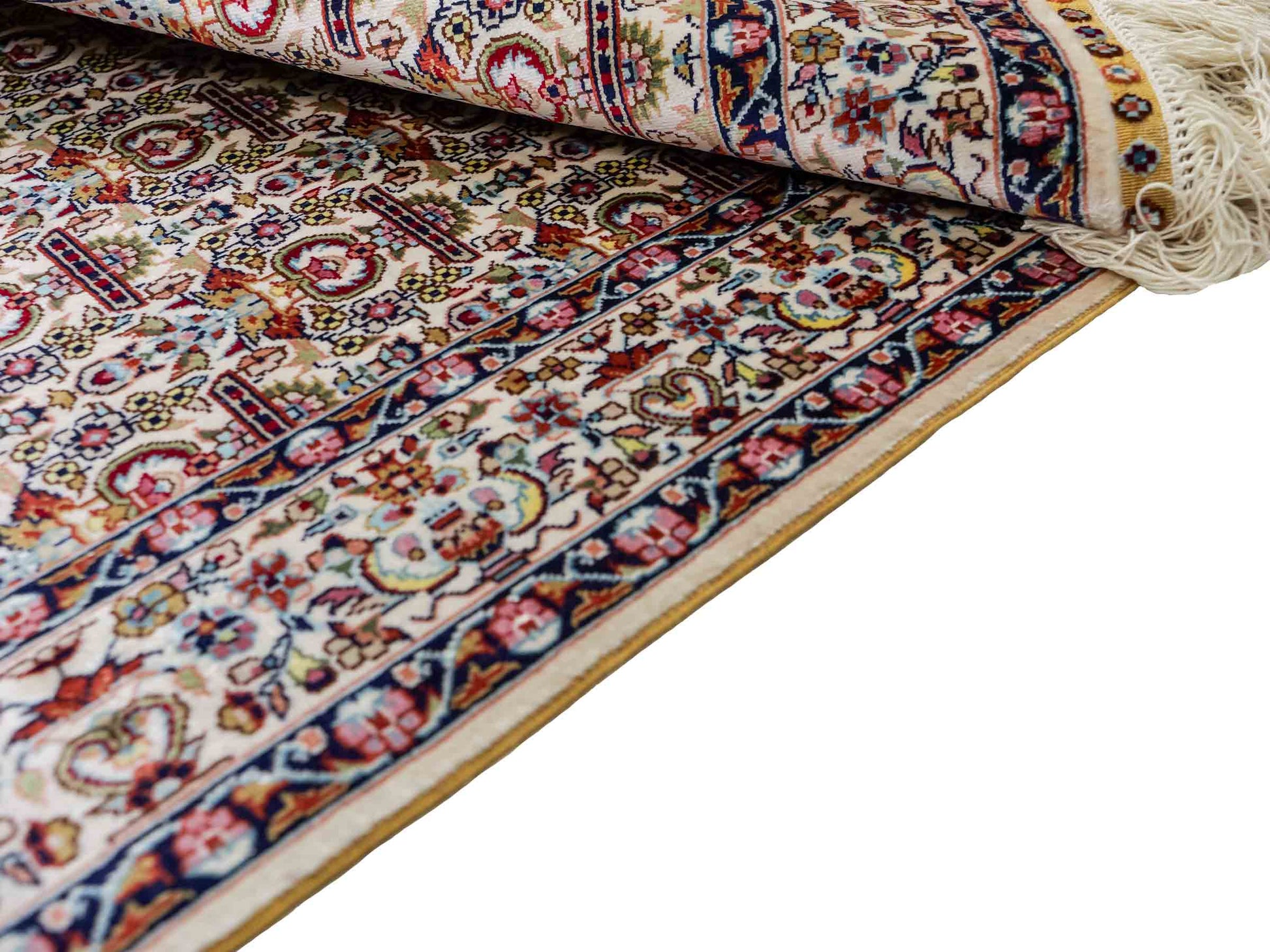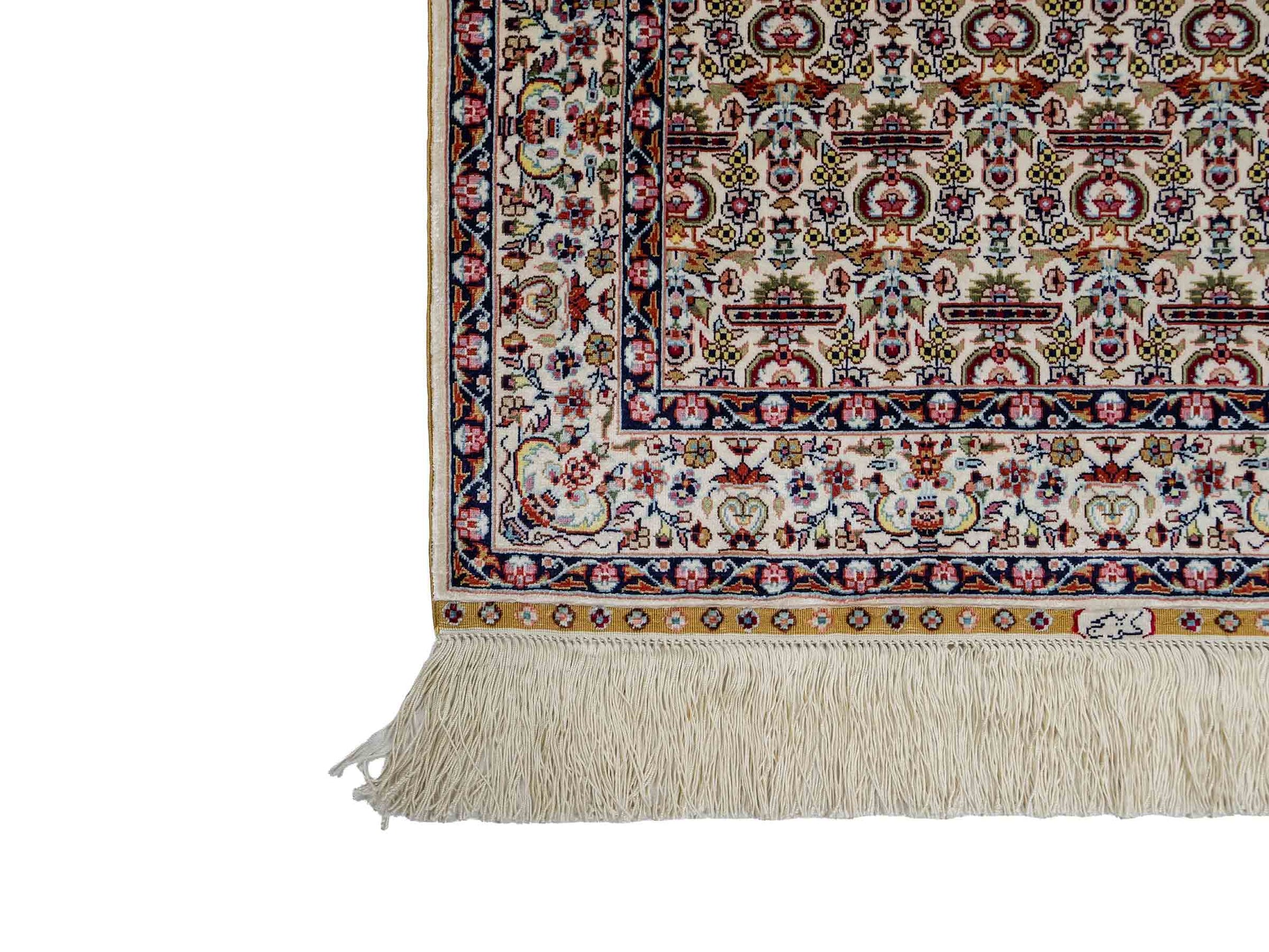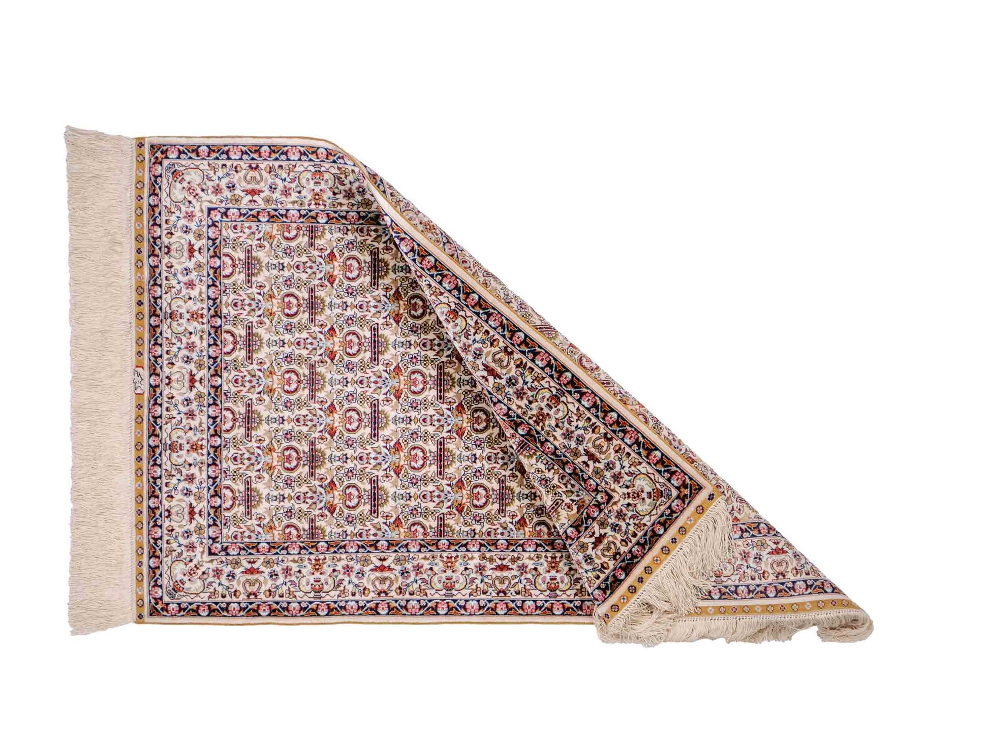 The pile and warp are made of pure silk, which not only grants the rug incredible worth, an unparalleled tactile experience, and breathtaking beauty but also imparts a uniquely shimmering appearance under different angles and lighting conditions.