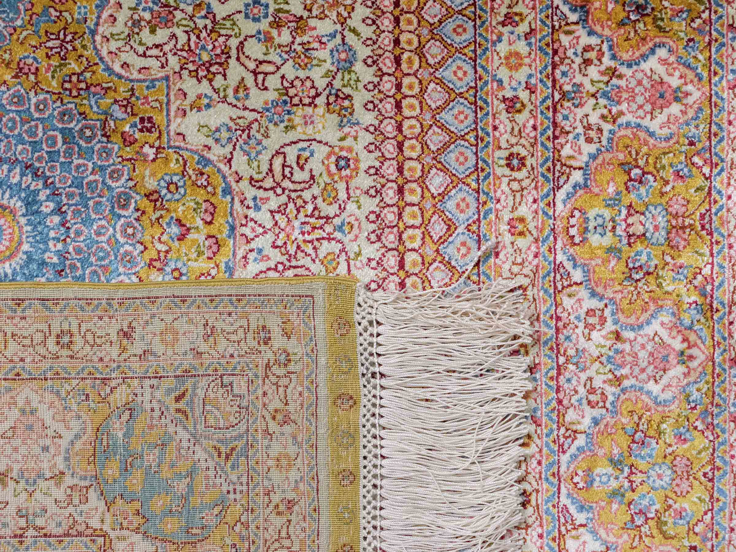 The pile and warp of this rug are made from pure silk, giving it exceptional value, an unrivaled tactile feel, and breathtaking beauty. Depending on how the light falls, the rug displays a unique shimmering effect, creating a captivating look from every angle.