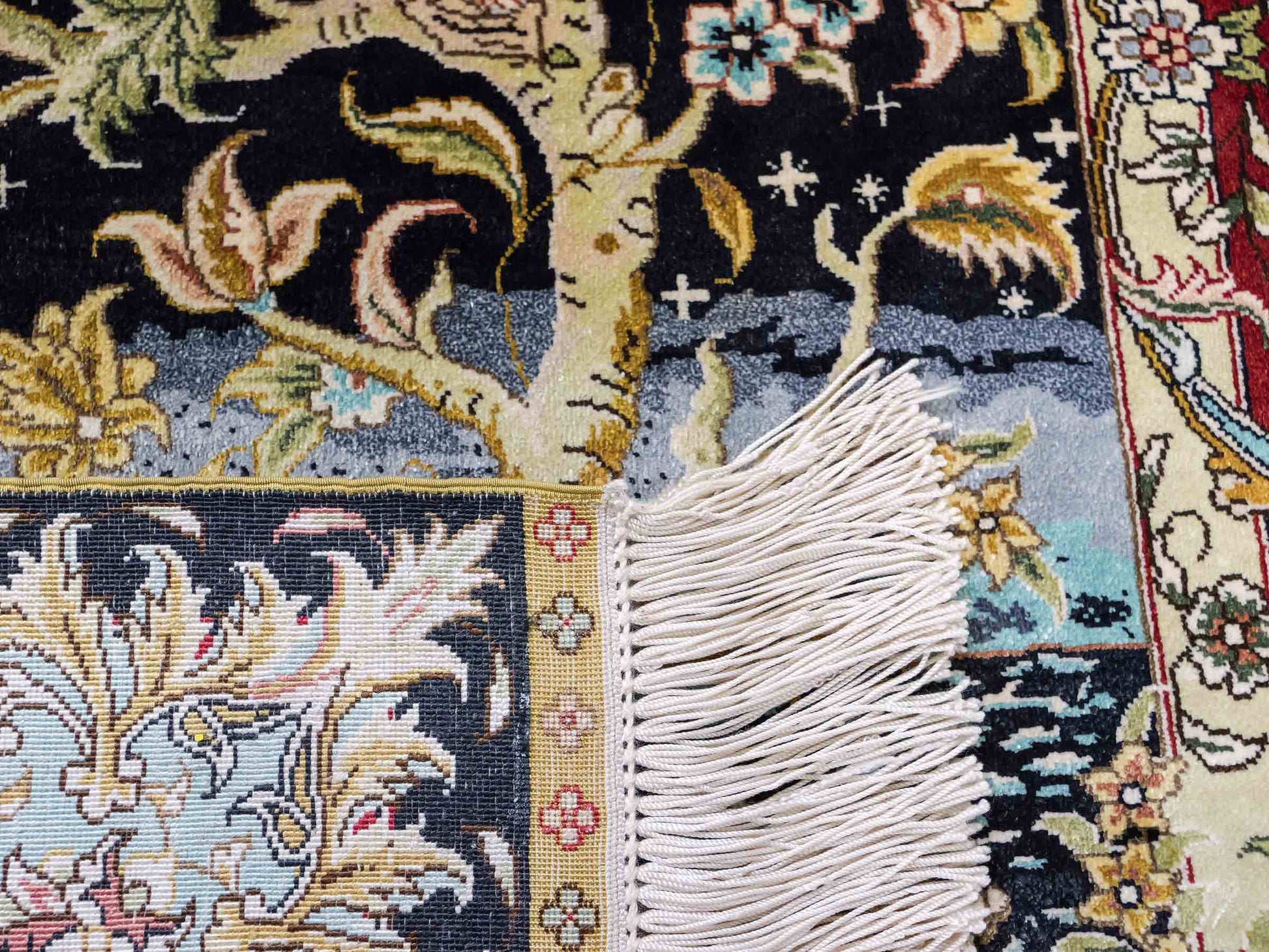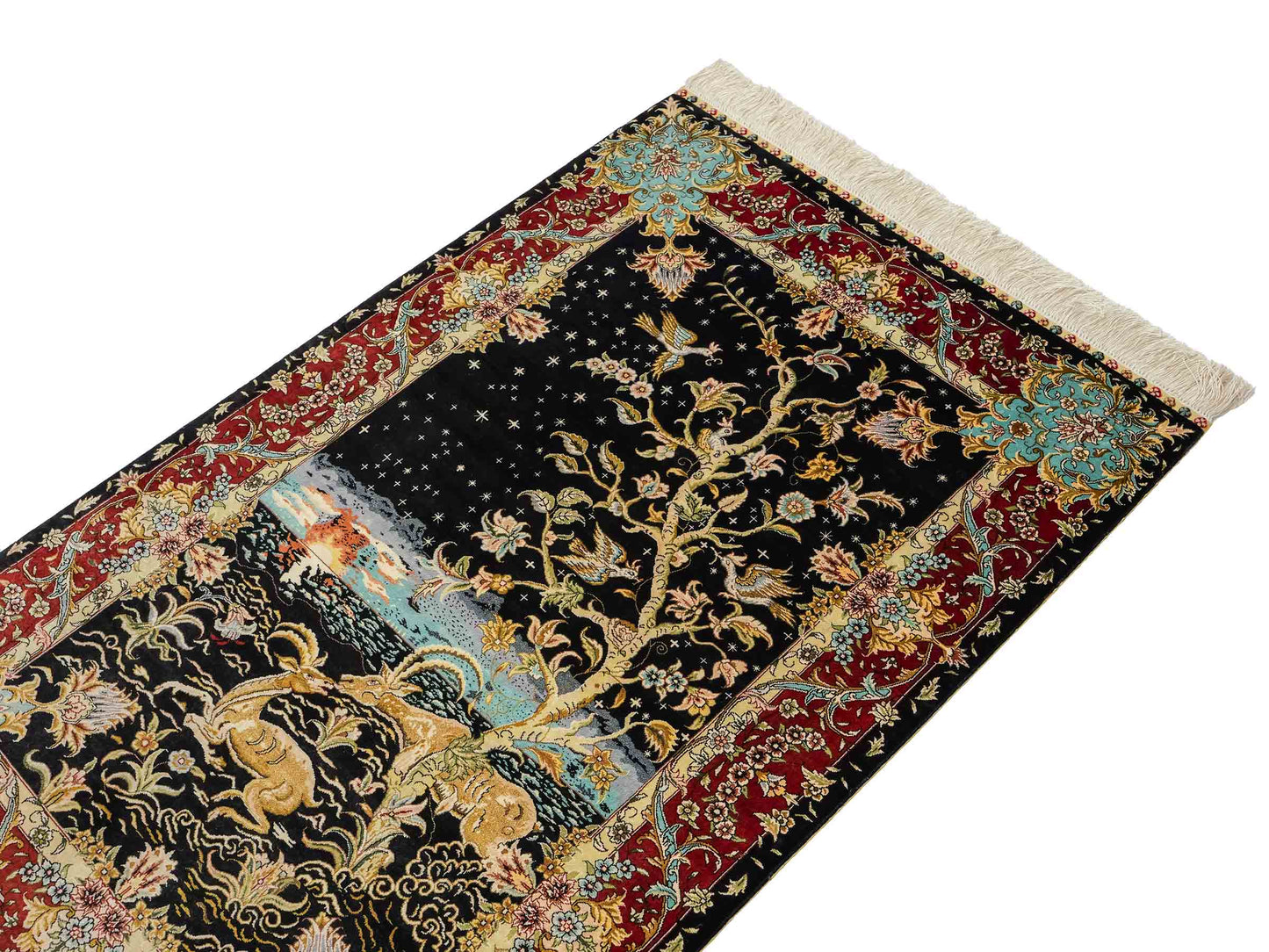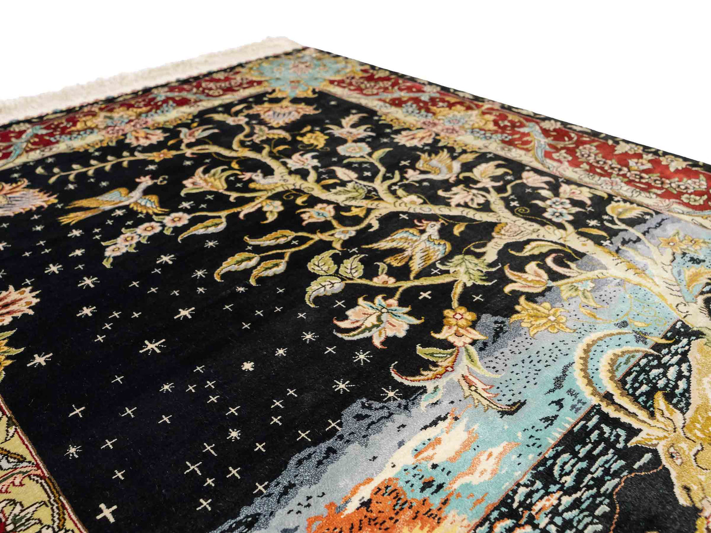 The pile and warp are made of pure silk, which not only grants the rug incredible worth, an unparalleled tactile experience, and breathtaking beauty but also imparts a uniquely shimmering appearance under different angles and lighting conditions.