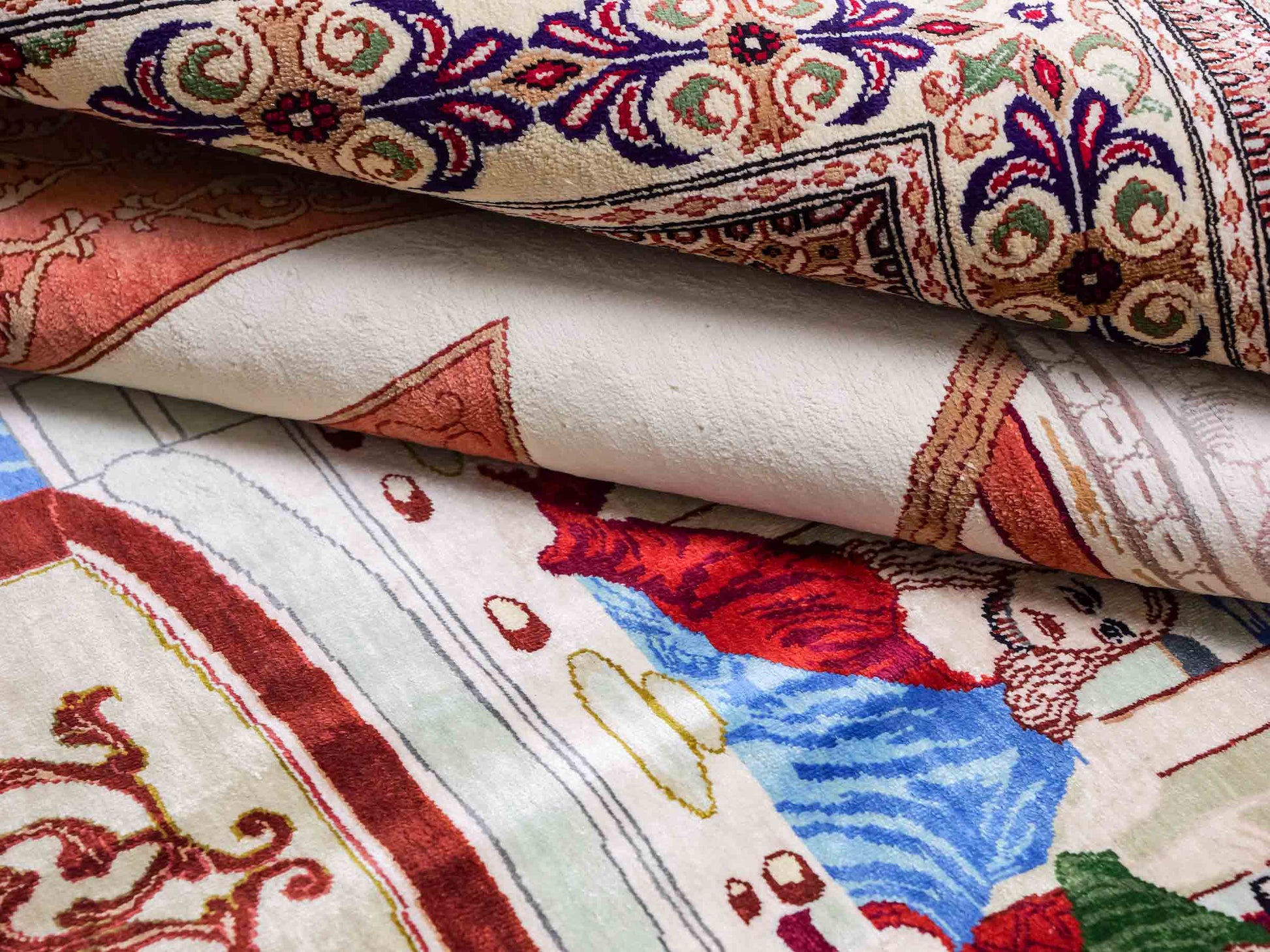 Wool with Silk: These rugs require particularly careful storage, as the combination of wool and silk makes both materials sensitive. Store them in a cool, dry place away from direct sunlight. A constant temperature of about 18 degrees Celsius is ideal. Use breathable cotton dust covers to protect the rug while ensuring ventilation. Regular inspections help to detect mold and pests early.