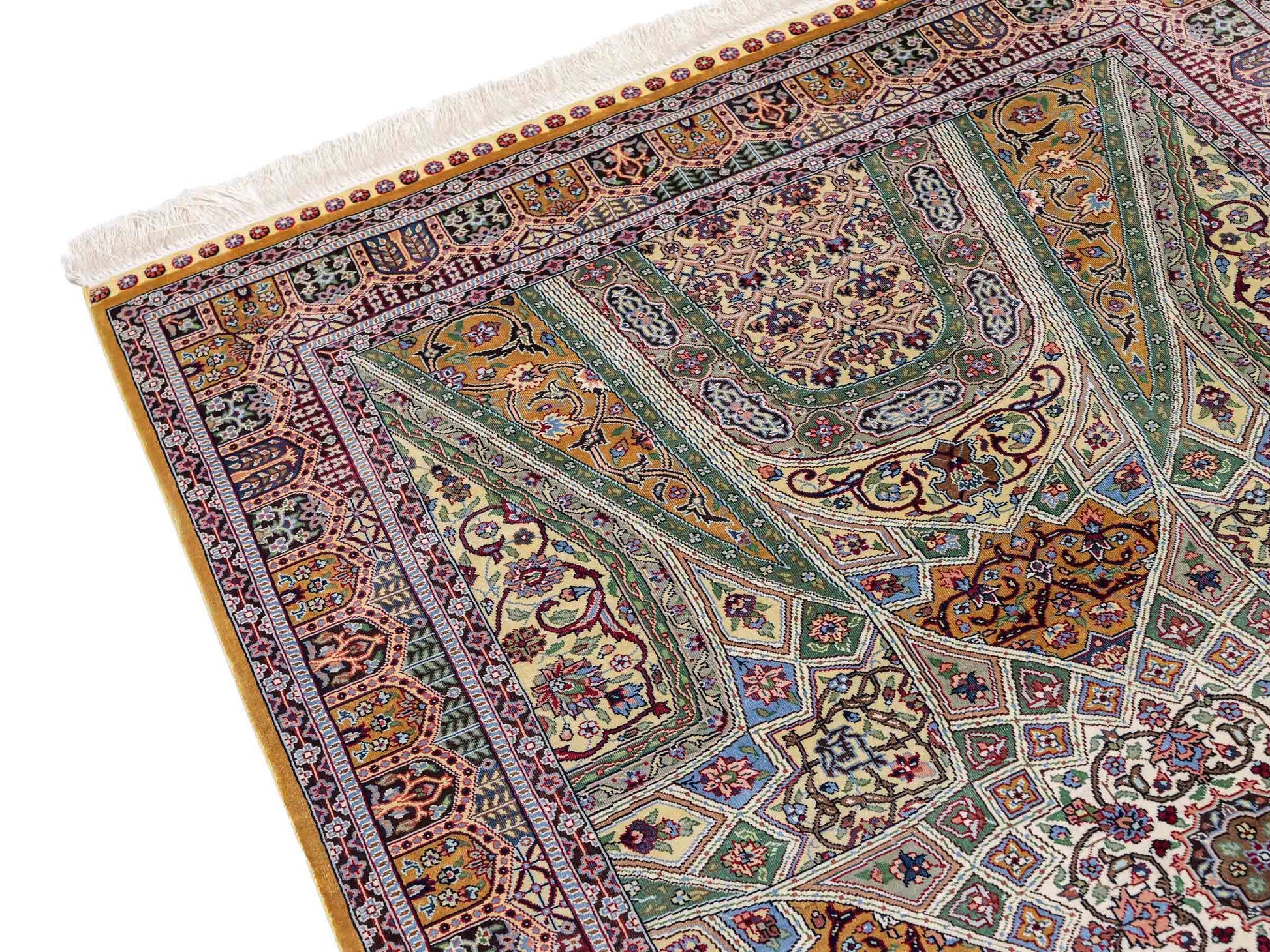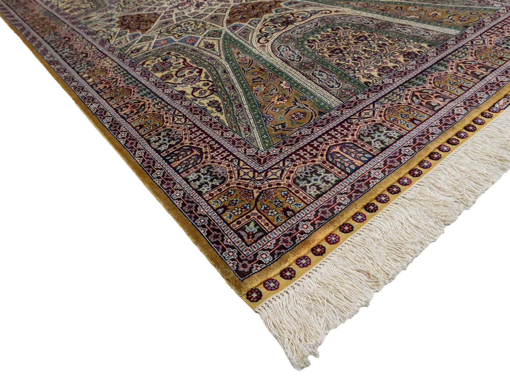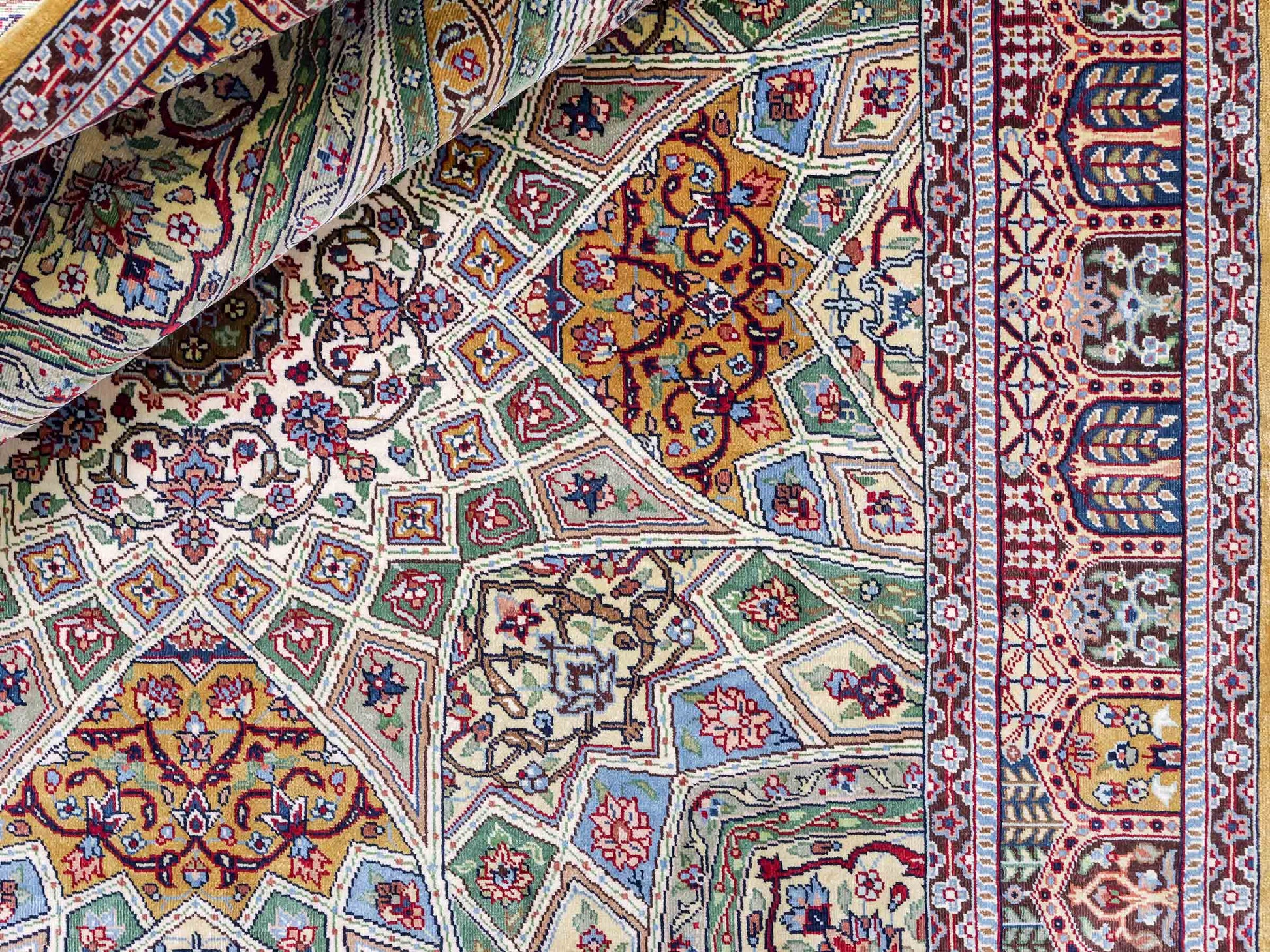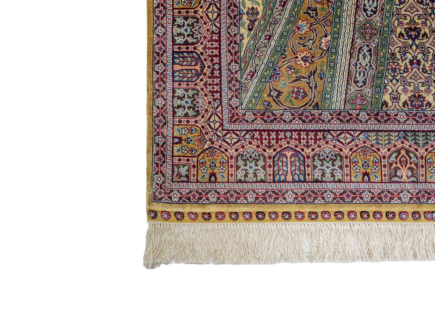 The pile and warp are made of pure silk, which not only grants the rug incredible worth, an unparalleled tactile experience, and breathtaking beauty but also imparts a uniquely shimmering appearance under different angles and lighting conditions.