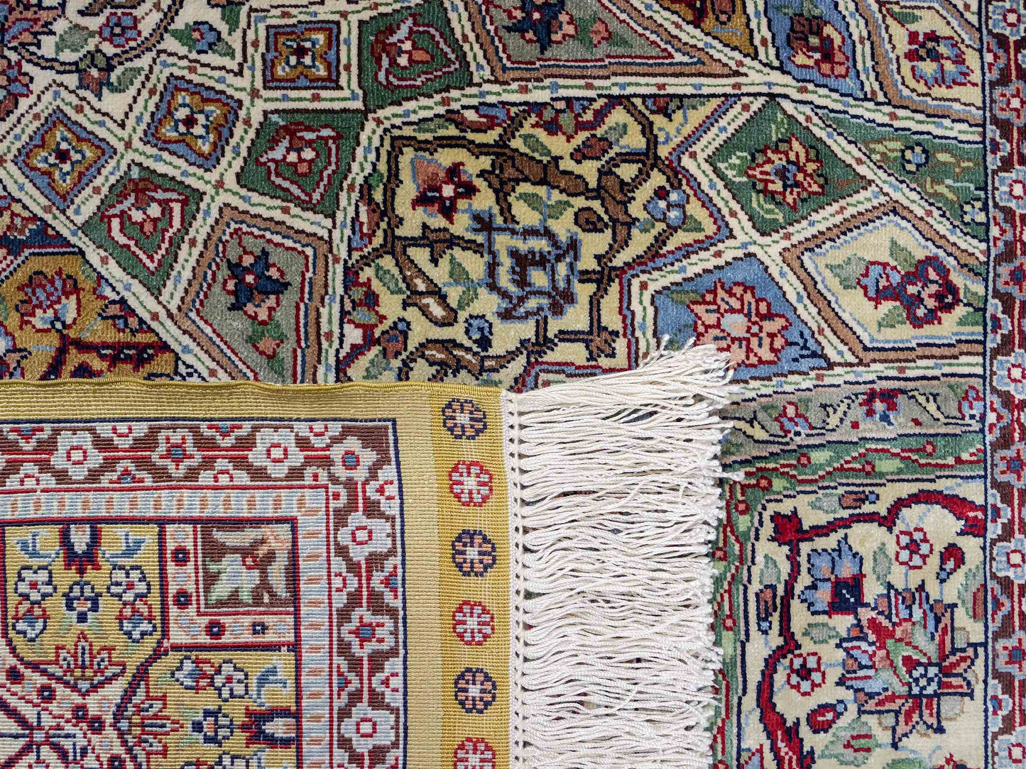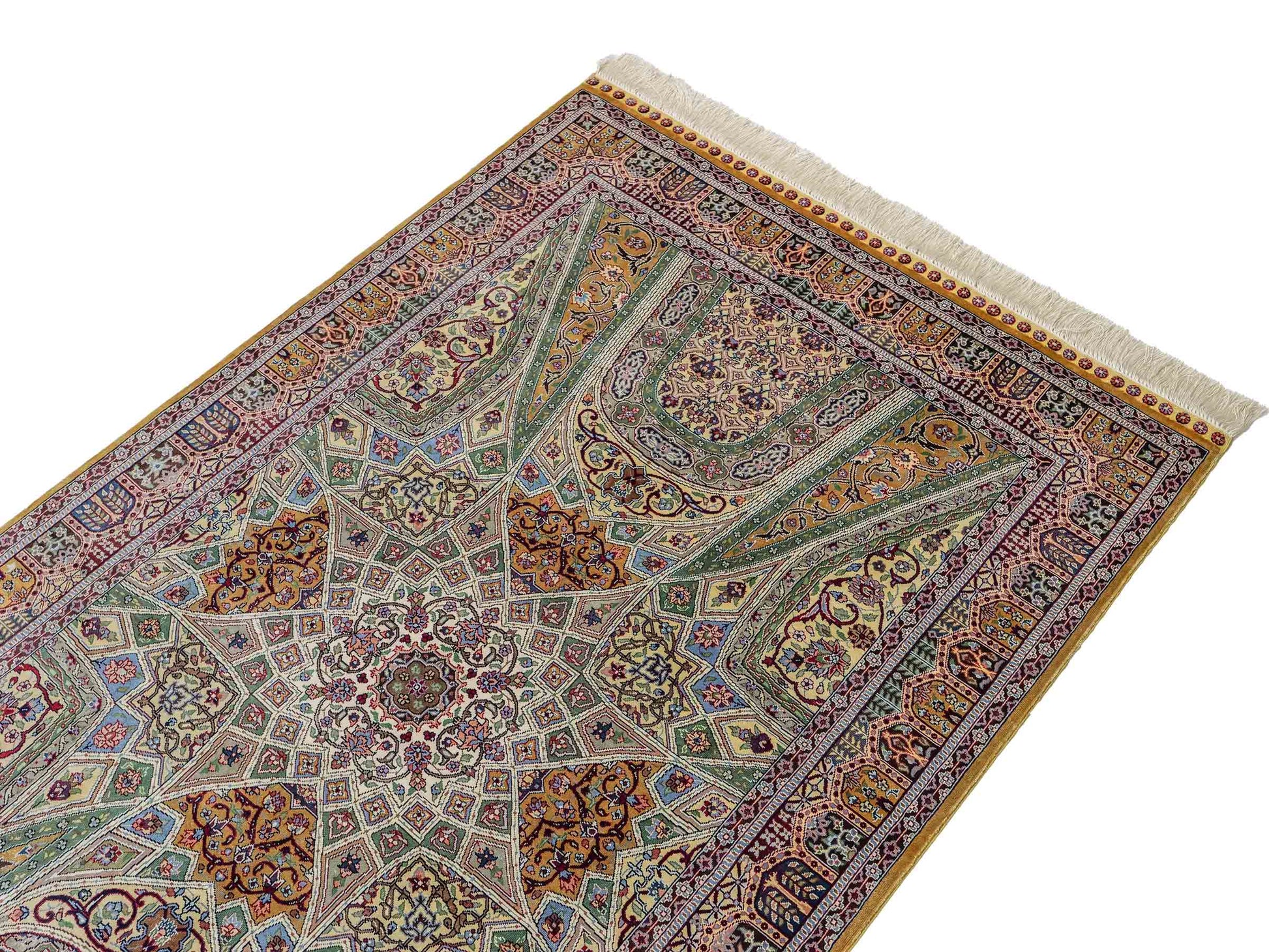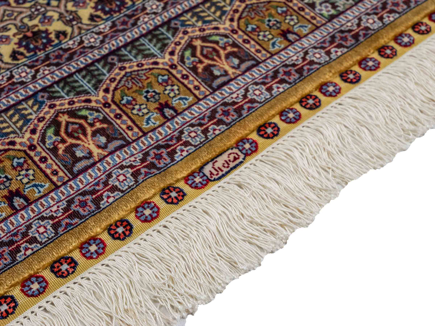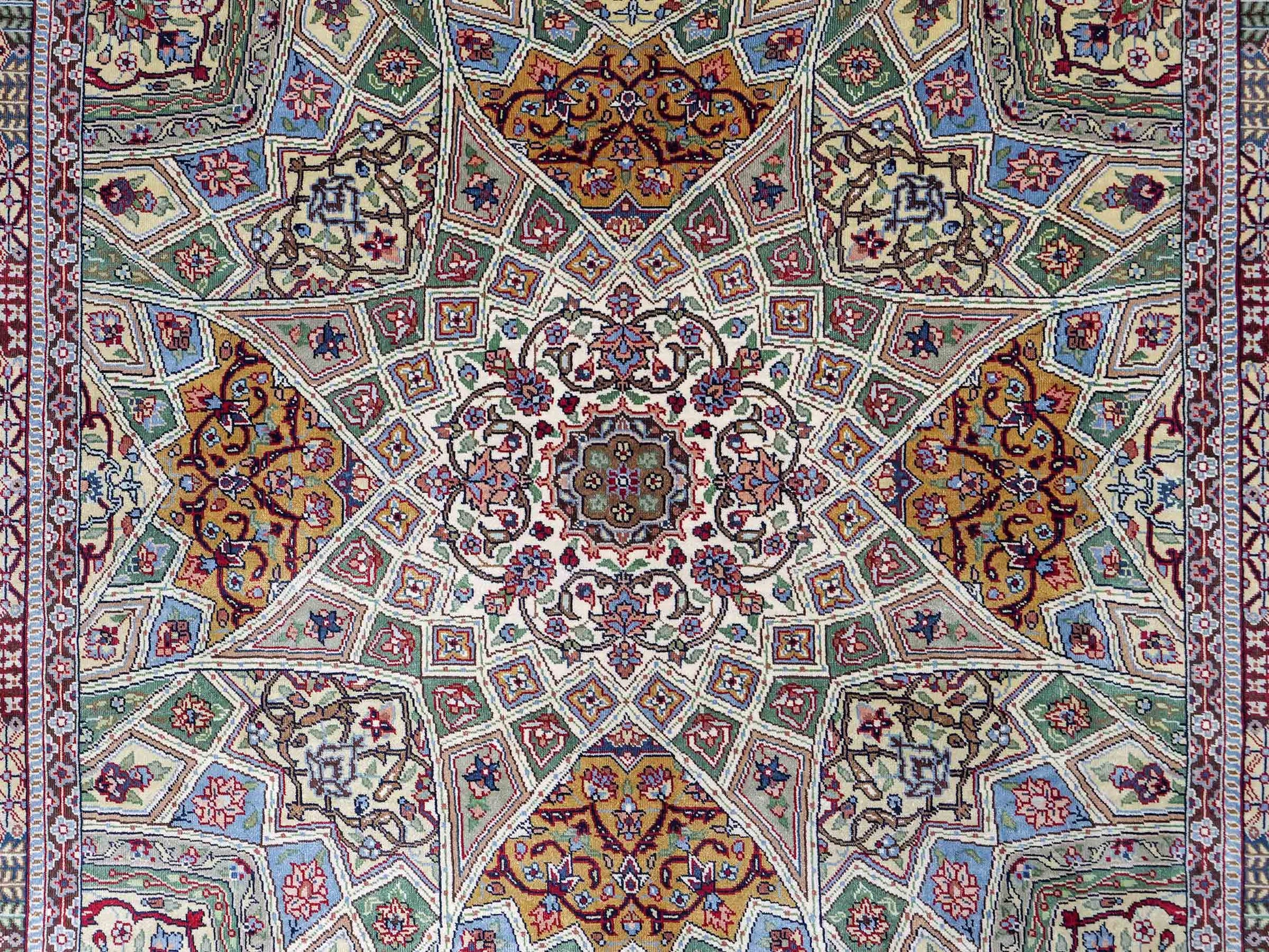 The pile and warp are made of pure silk, which not only grants the rug incredible worth, an unparalleled tactile experience, and breathtaking beauty but also imparts a uniquely shimmering appearance under different angles and lighting conditions.