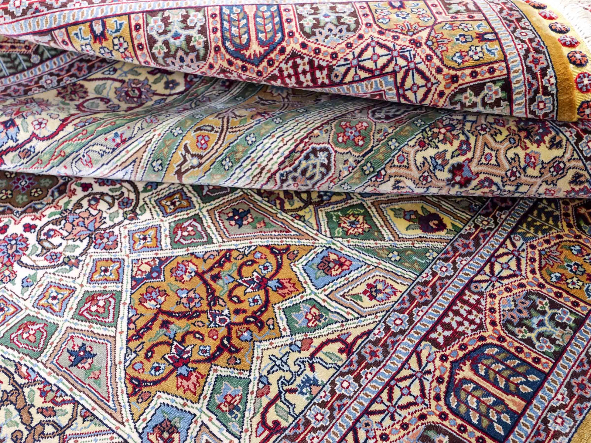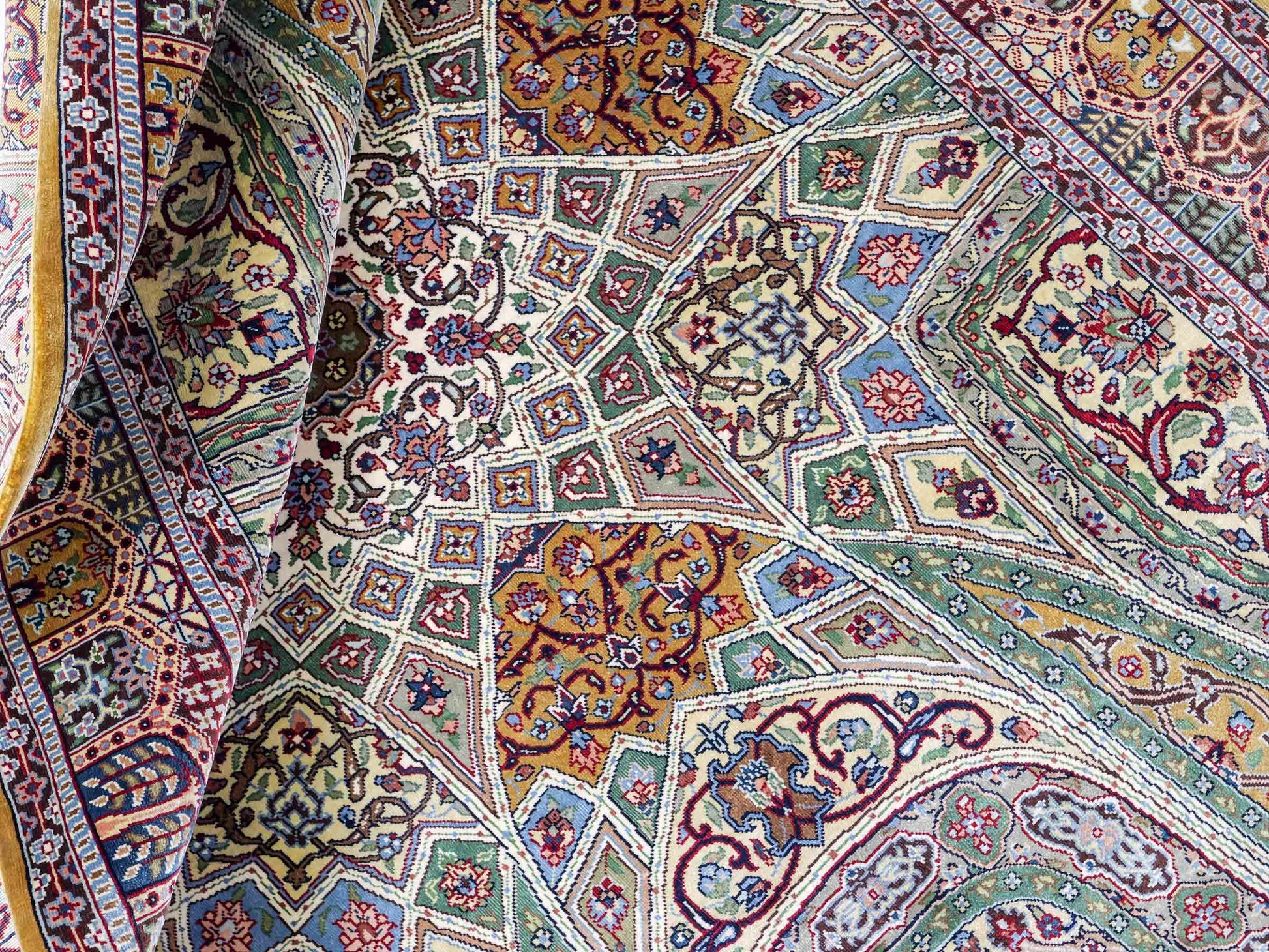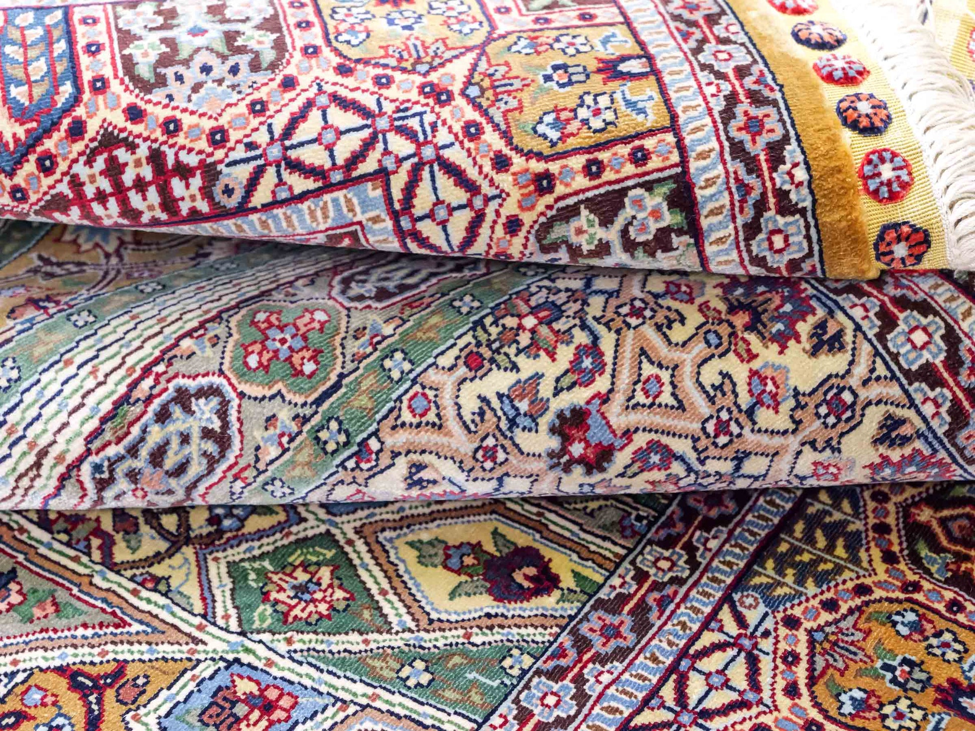 Wool with Silk: These rugs require particularly careful storage, as the combination of wool and silk makes both materials sensitive. Store them in a cool, dry place away from direct sunlight. A constant temperature of about 18 degrees Celsius is ideal. Use breathable cotton dust covers to protect the rug while ensuring ventilation. Regular inspections help to detect mold and pests early.
