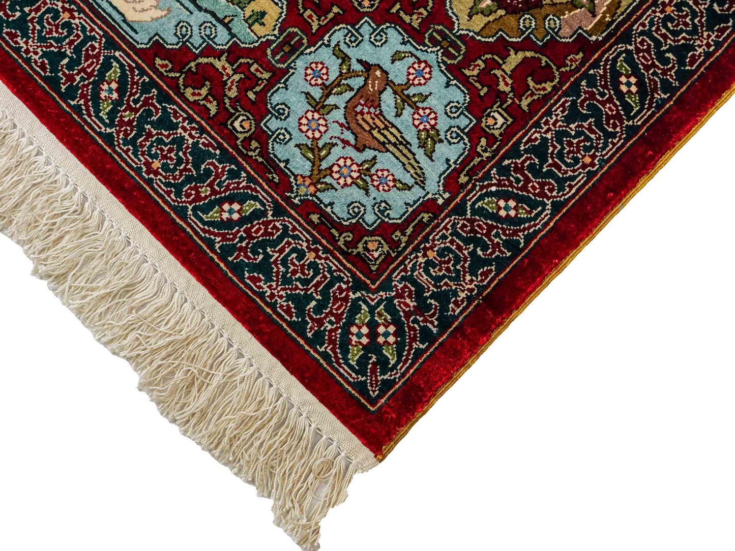 The pile and warp are made of pure silk, which not only grants the rug incredible worth, an unparalleled tactile experience, and breathtaking beauty but also imparts a uniquely shimmering appearance under different angles and lighting conditions.