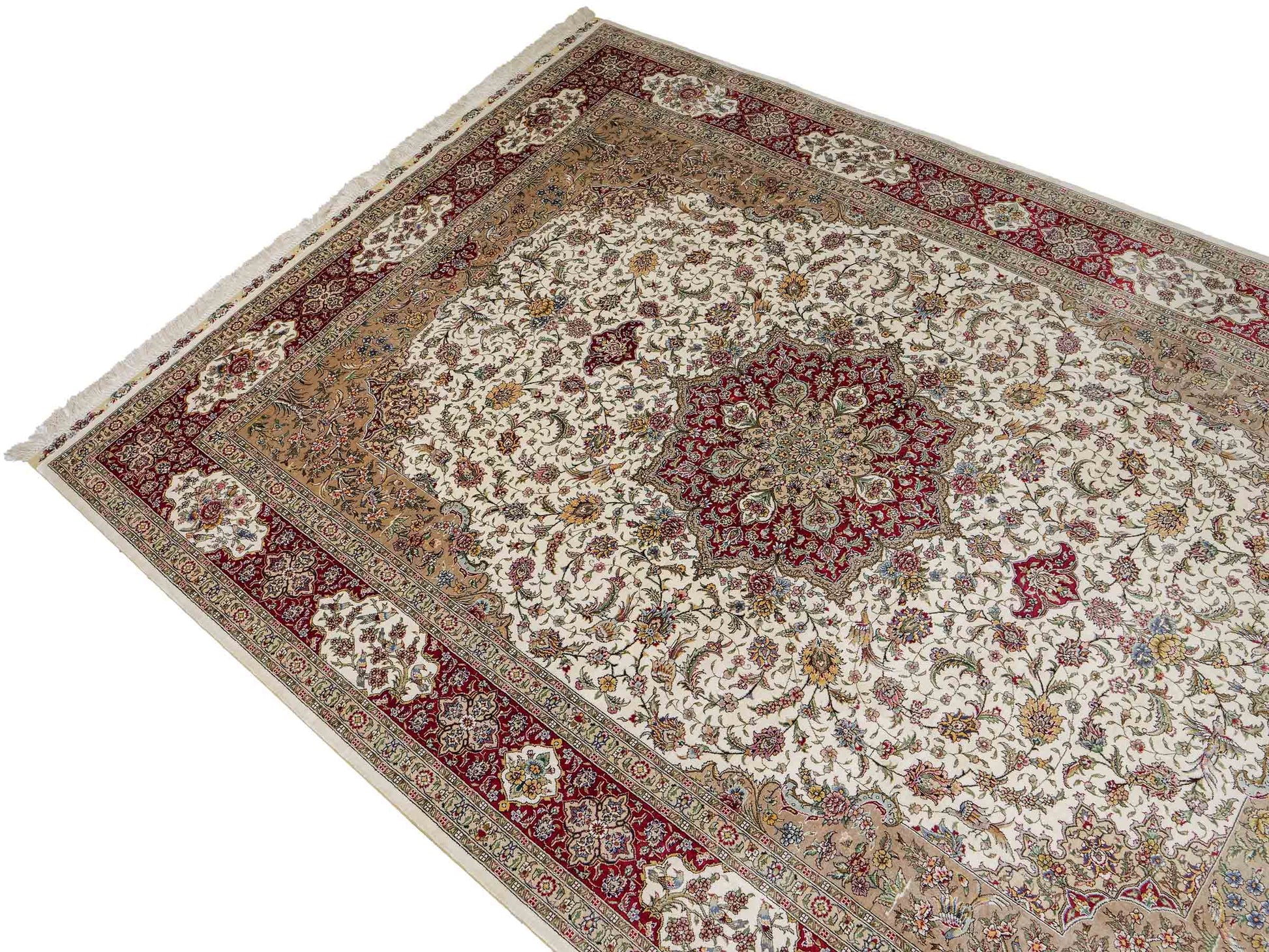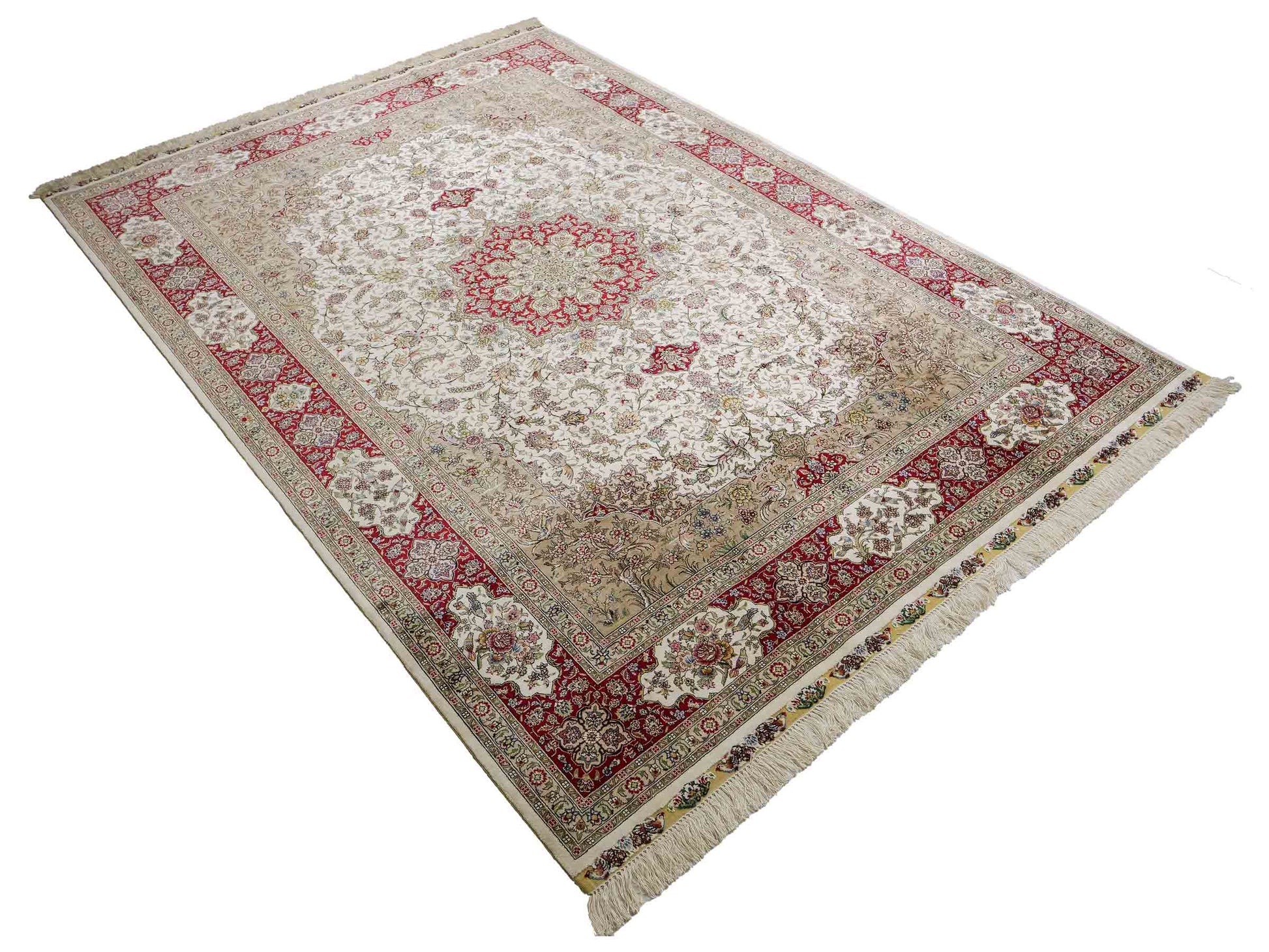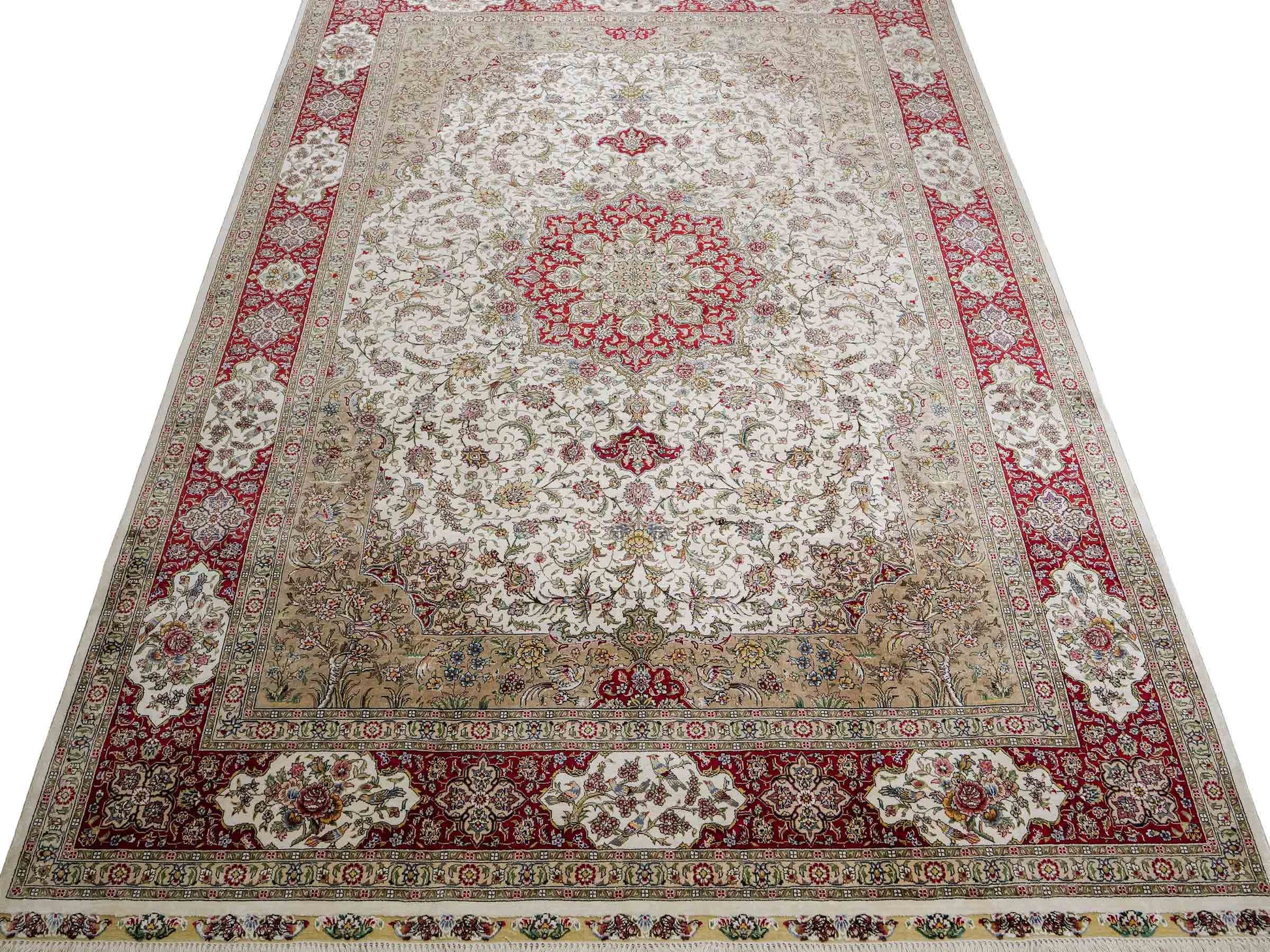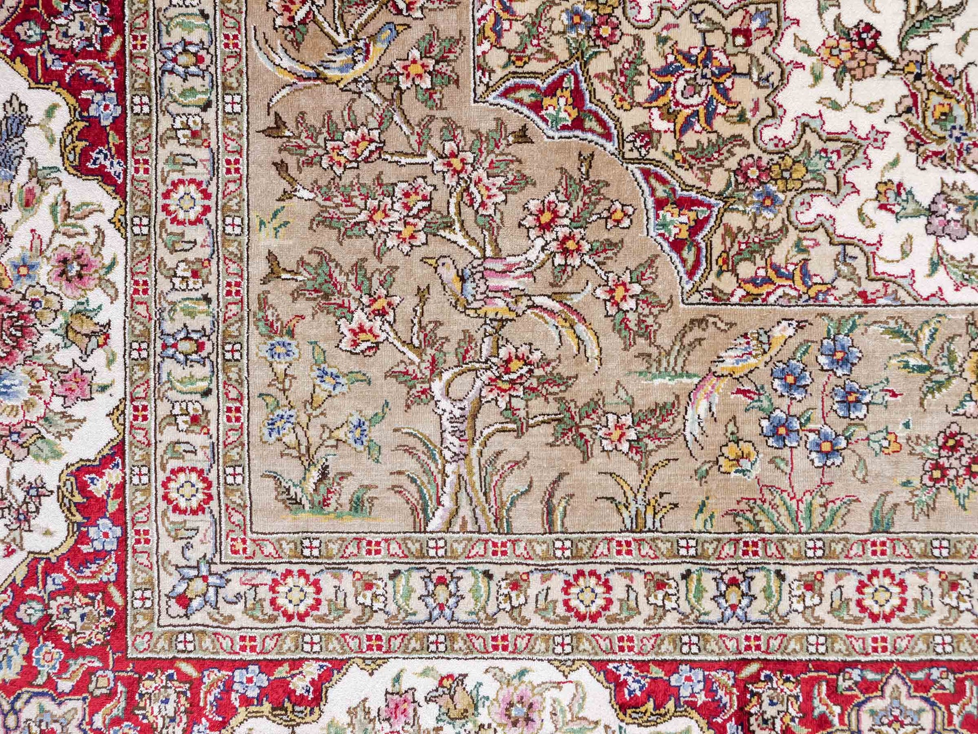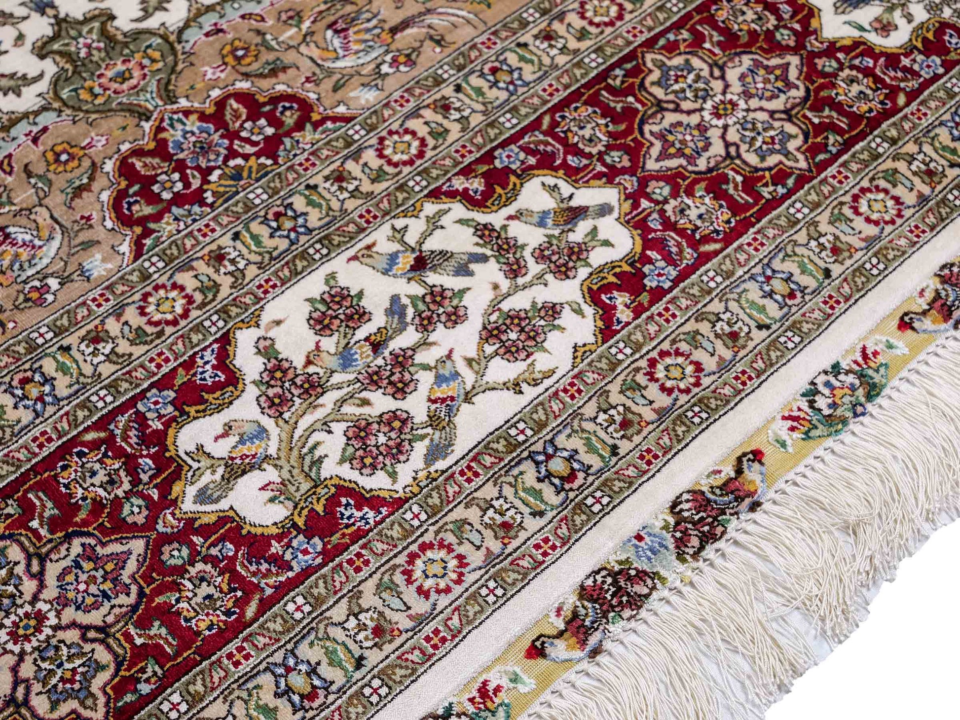 The pile and warp are made of pure silk, which not only grants the rug incredible worth, an unparalleled tactile experience, and breathtaking beauty but also imparts a uniquely shimmering appearance under different angles and lighting conditions.