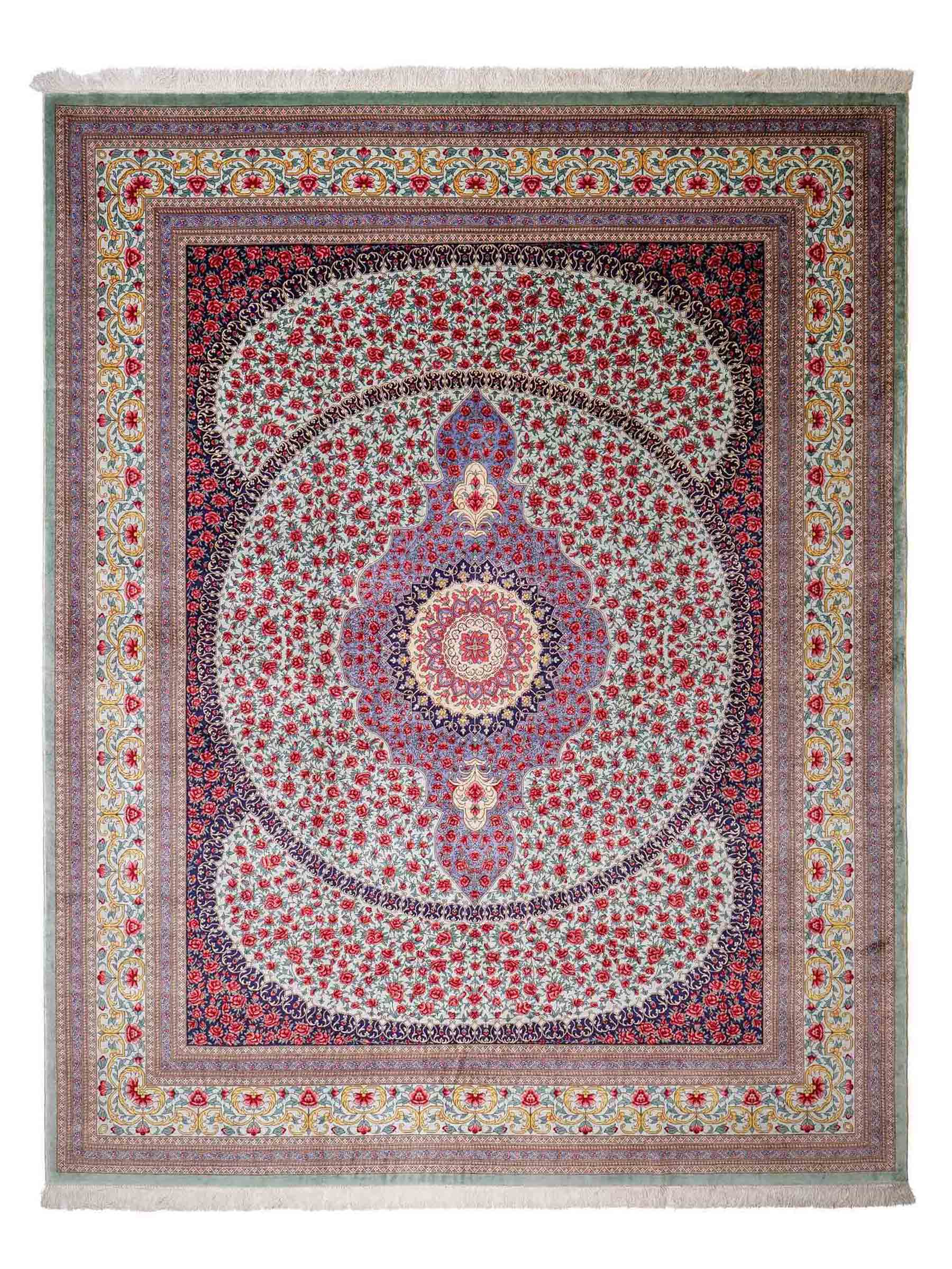 The pile and warp are made of pure silk, which not only grants the rug incredible worth, an unparalleled tactile experience, and breathtaking beauty but also imparts a uniquely shimmering appearance under different angles and lighting conditions.