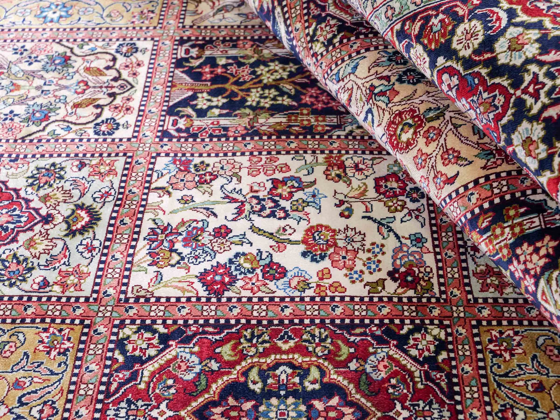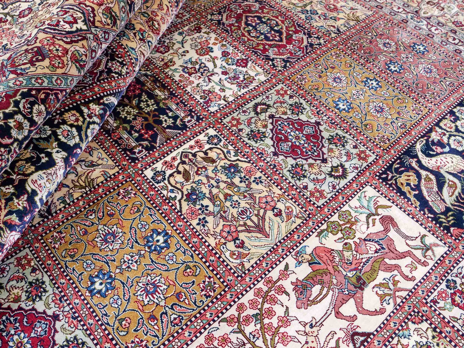 Wool with Silk: These rugs require particularly careful storage, as the combination of wool and silk makes both materials sensitive. Store them in a cool, dry place away from direct sunlight. A constant temperature of about 18 degrees Celsius is ideal. Use breathable cotton dust covers to protect the rug while ensuring ventilation. Regular inspections help to detect mold and pests early.