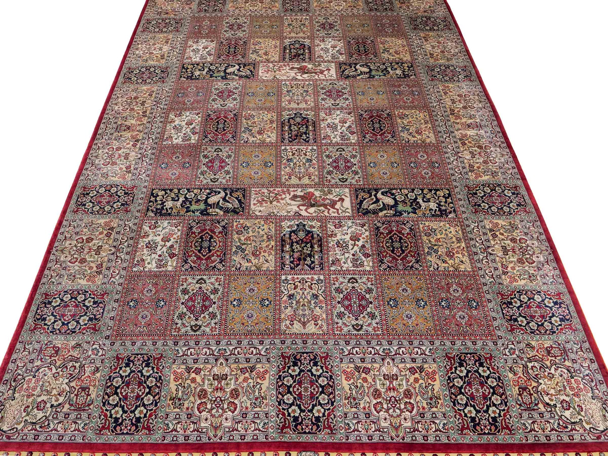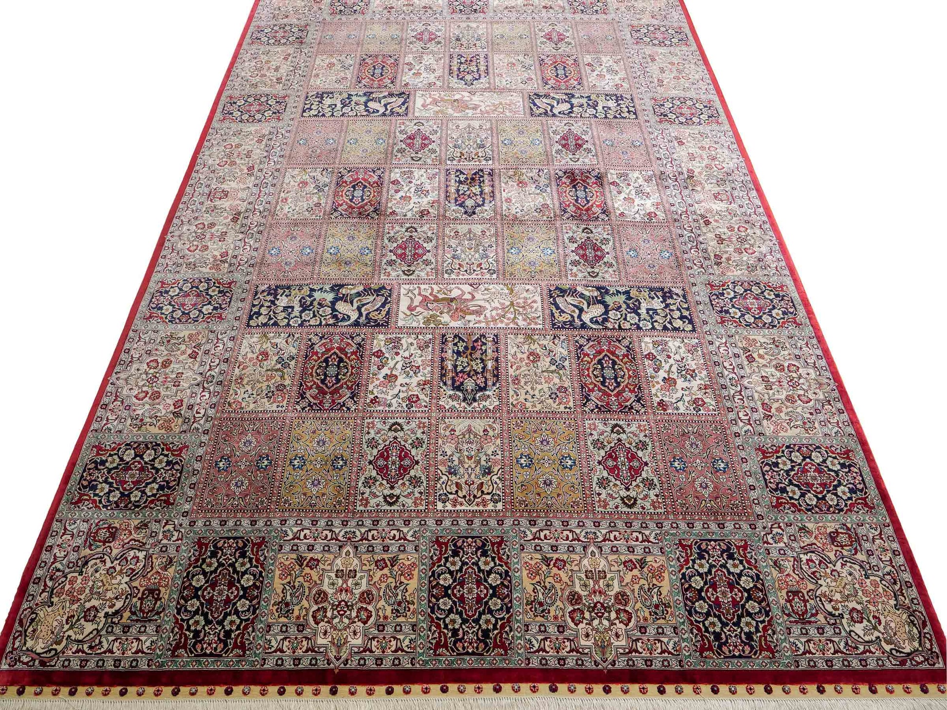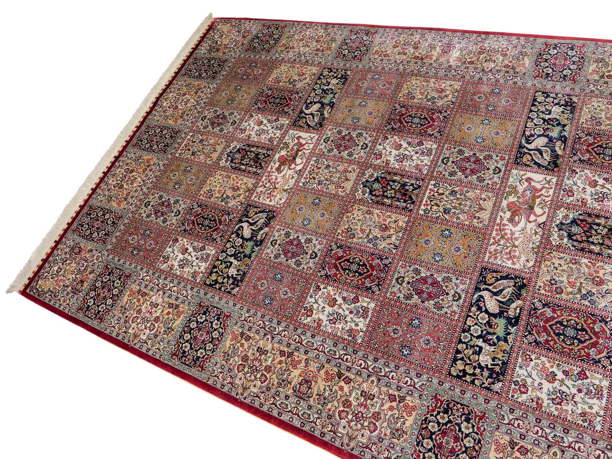 The pile and warp are made of pure silk, which not only grants the rug incredible worth, an unparalleled tactile experience, and breathtaking beauty but also imparts a uniquely shimmering appearance under different angles and lighting conditions.