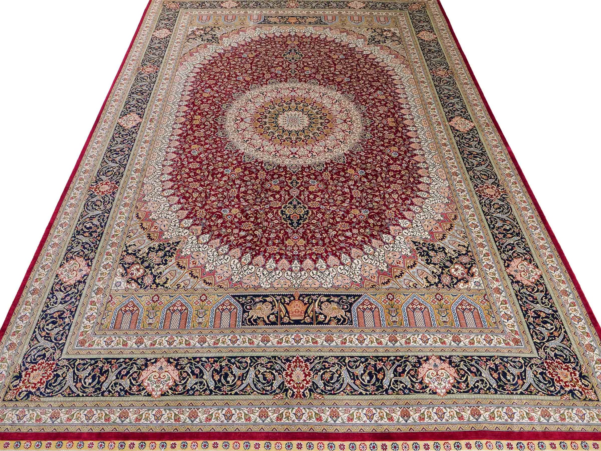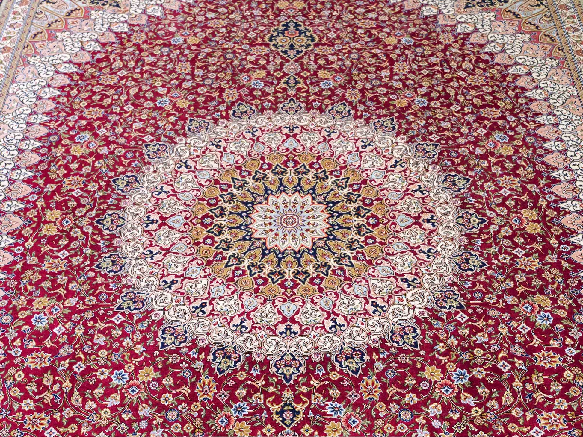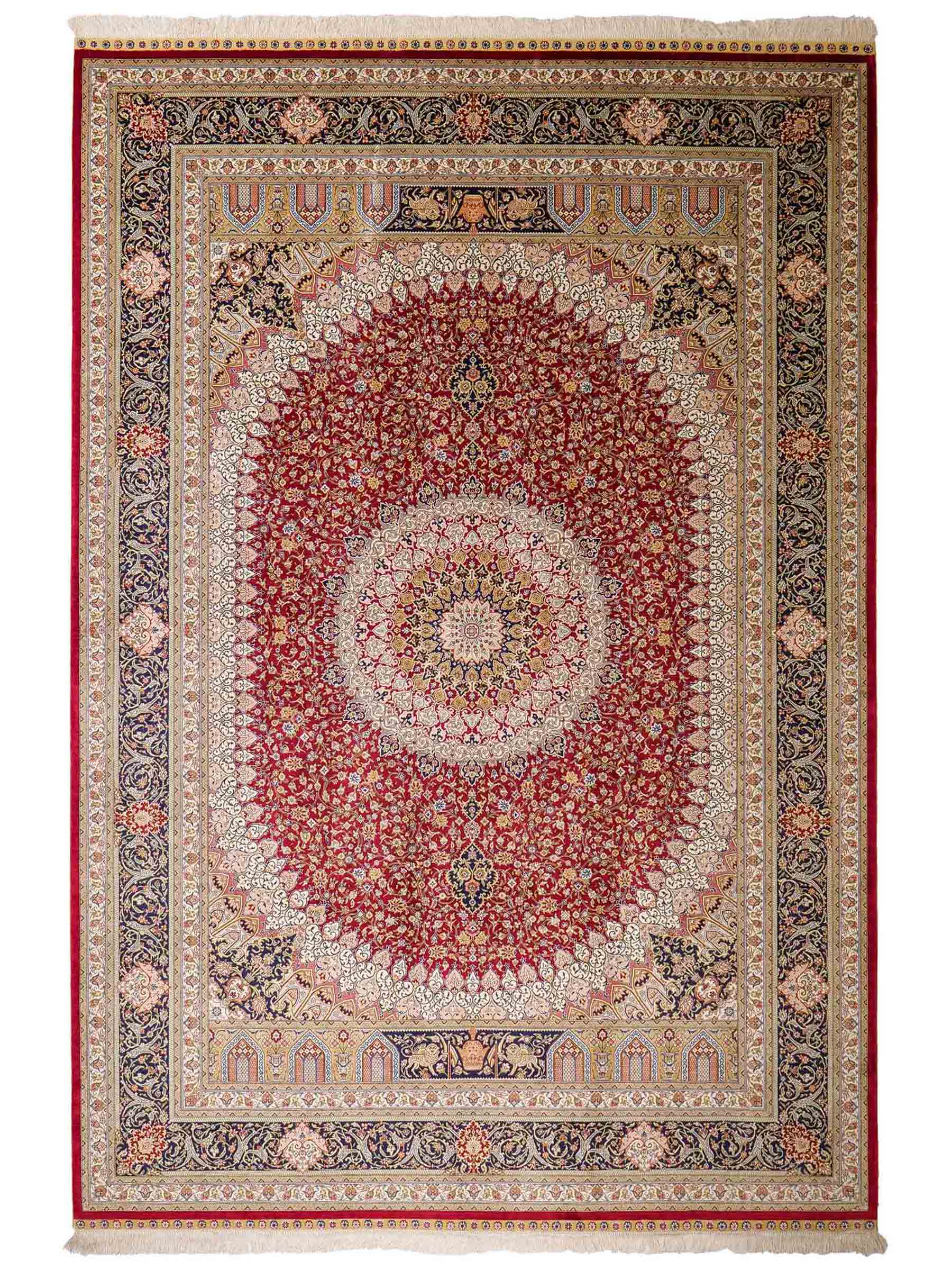 The pile and warp are made of pure silk, which not only grants the rug incredible worth, an unparalleled tactile experience, and breathtaking beauty but also imparts a uniquely shimmering appearance under different angles and lighting conditions.