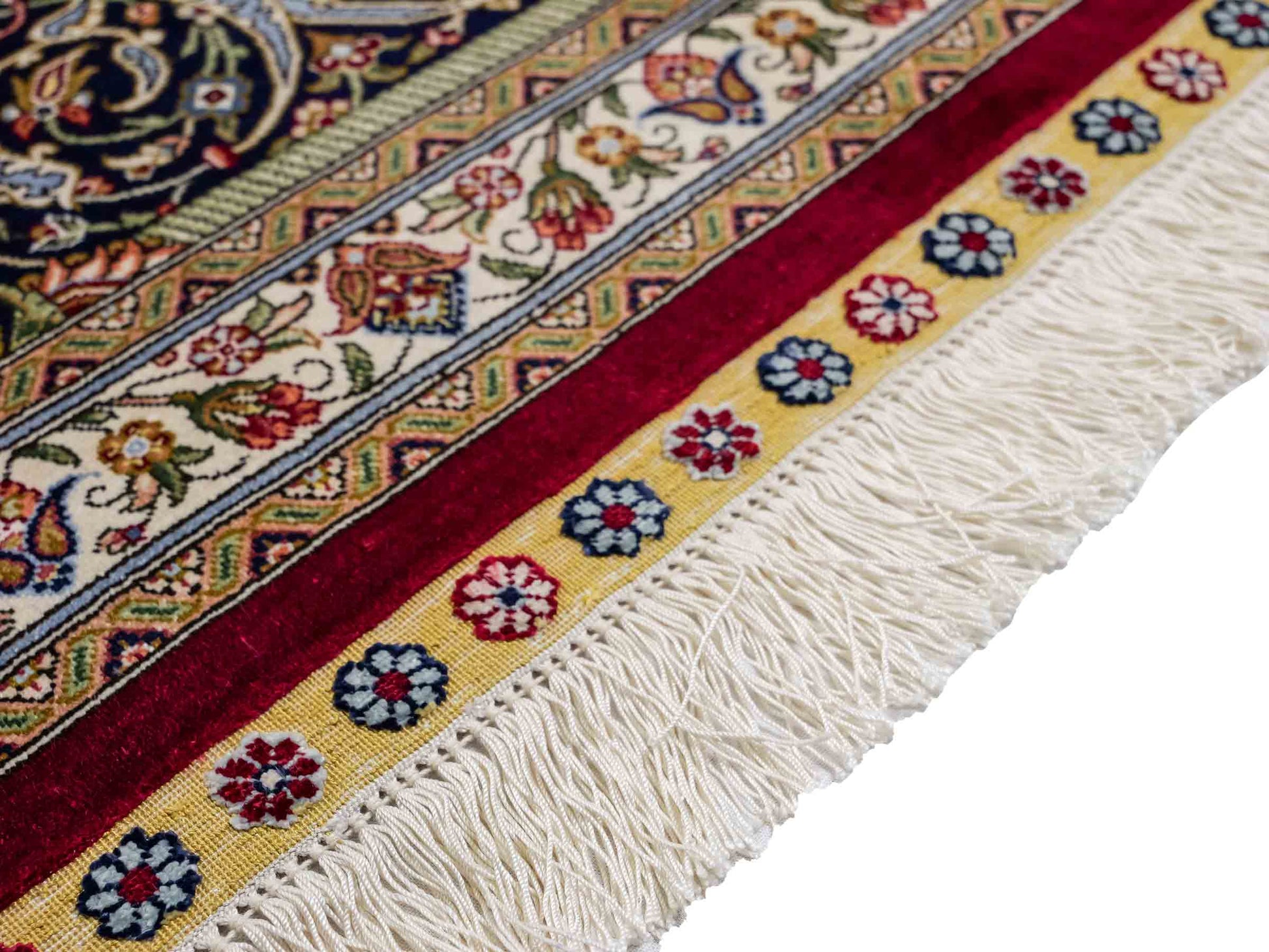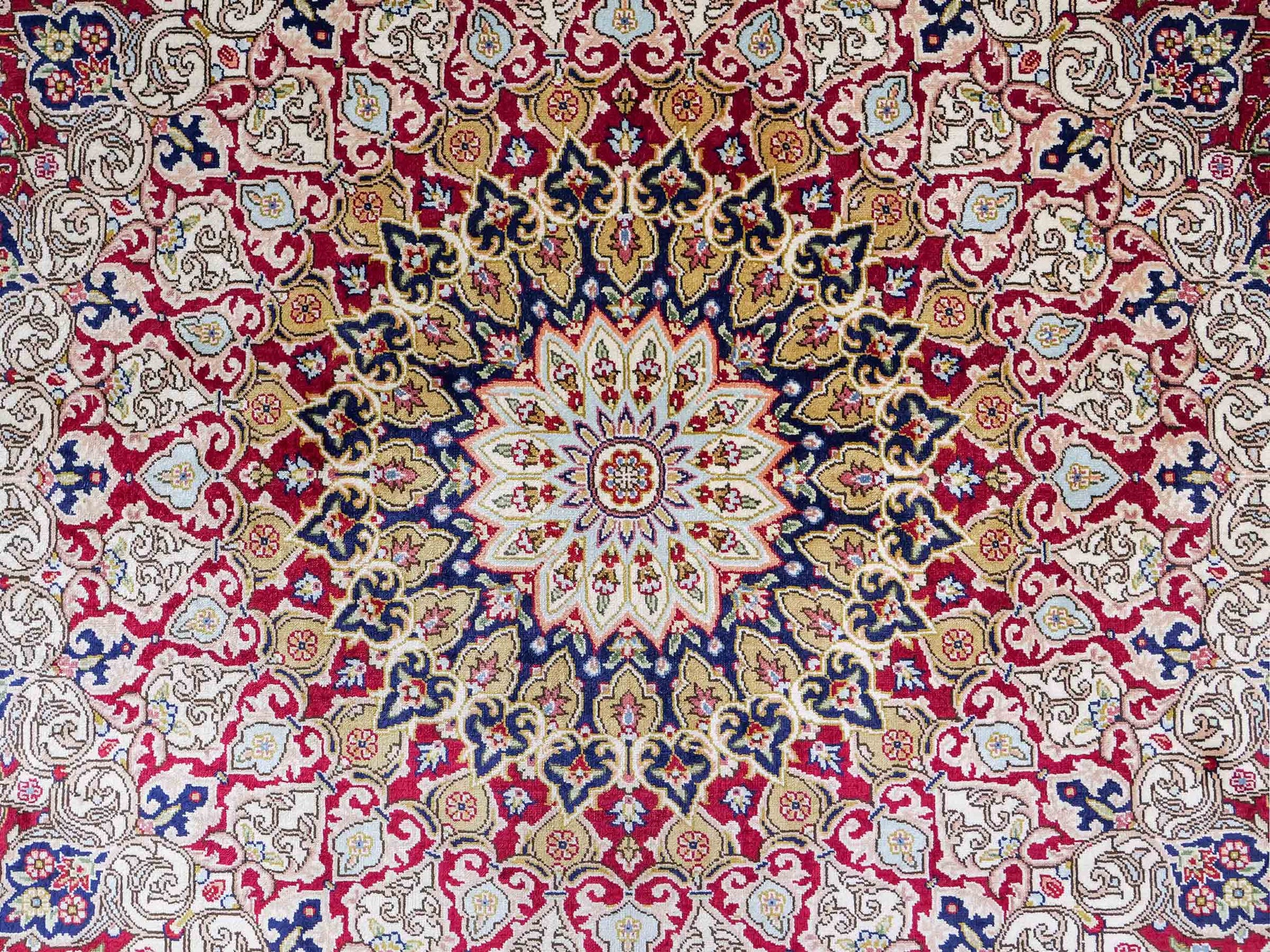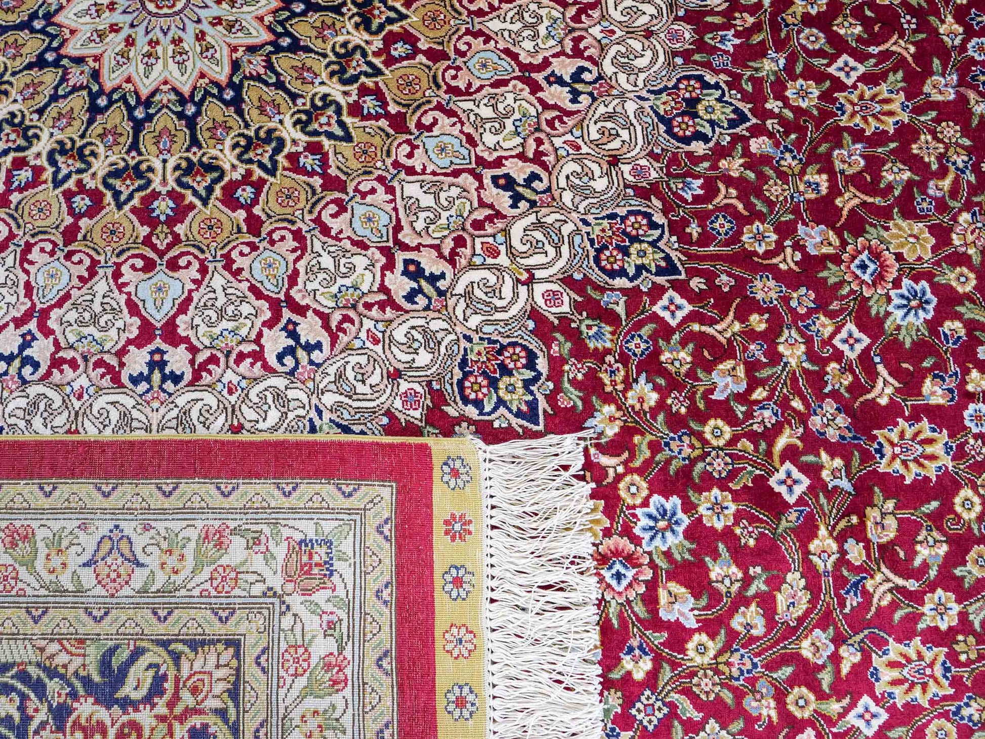 The pile and warp are made of pure silk, which not only grants the rug incredible worth, an unparalleled tactile experience, and breathtaking beauty but also imparts a uniquely shimmering appearance under different angles and lighting conditions.