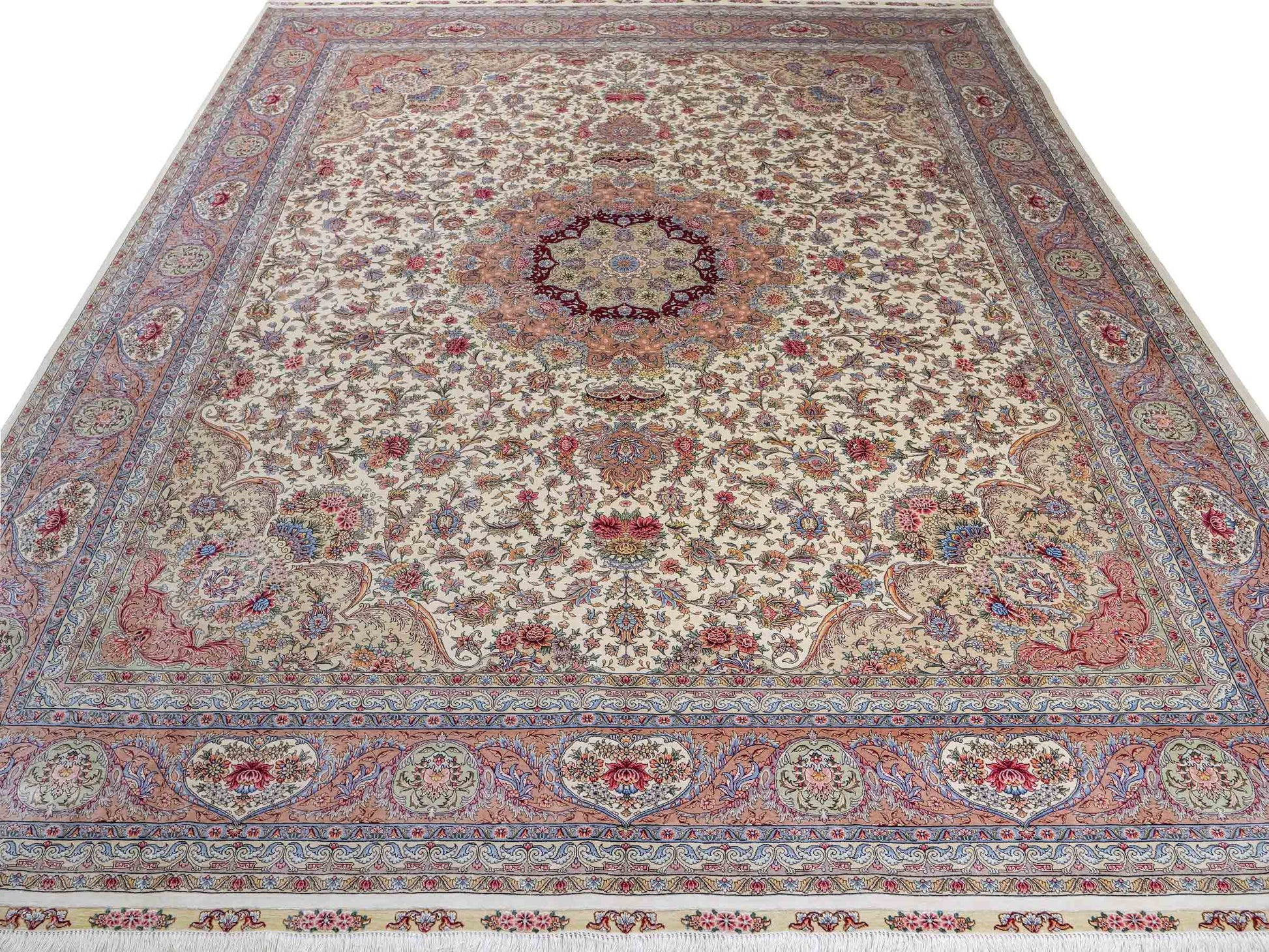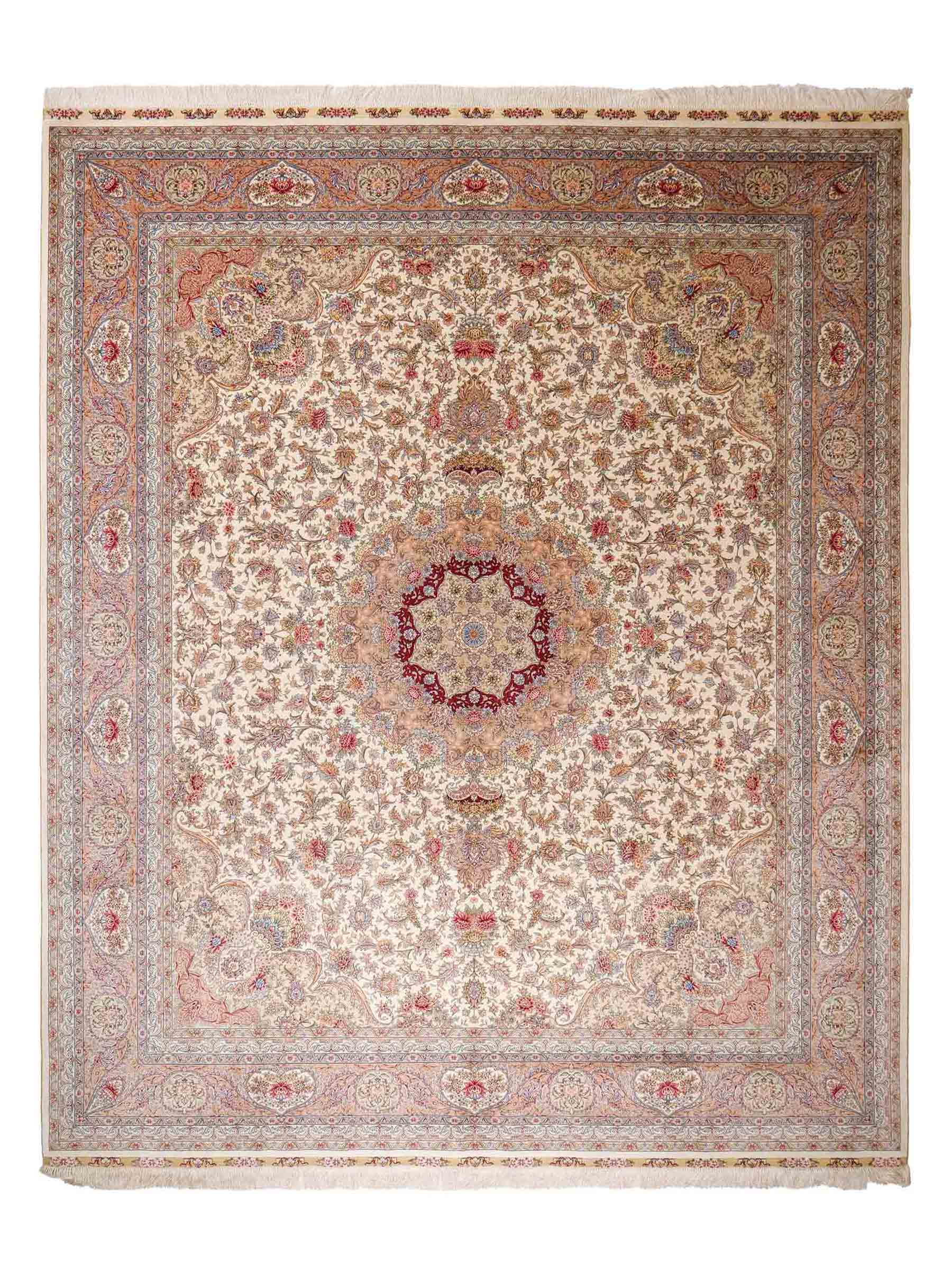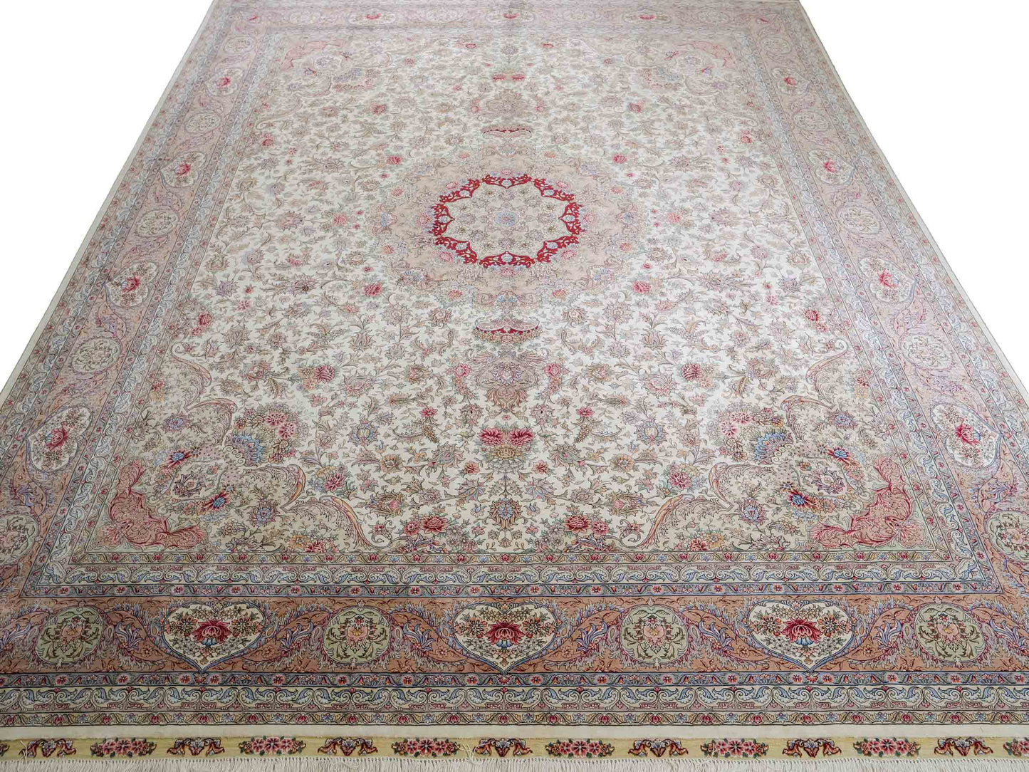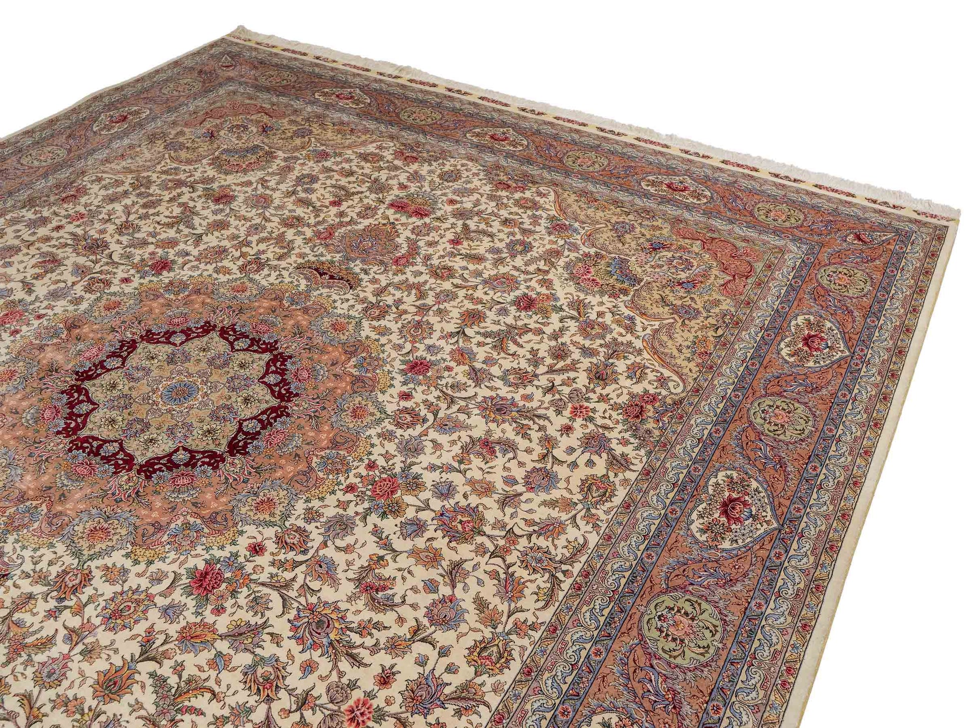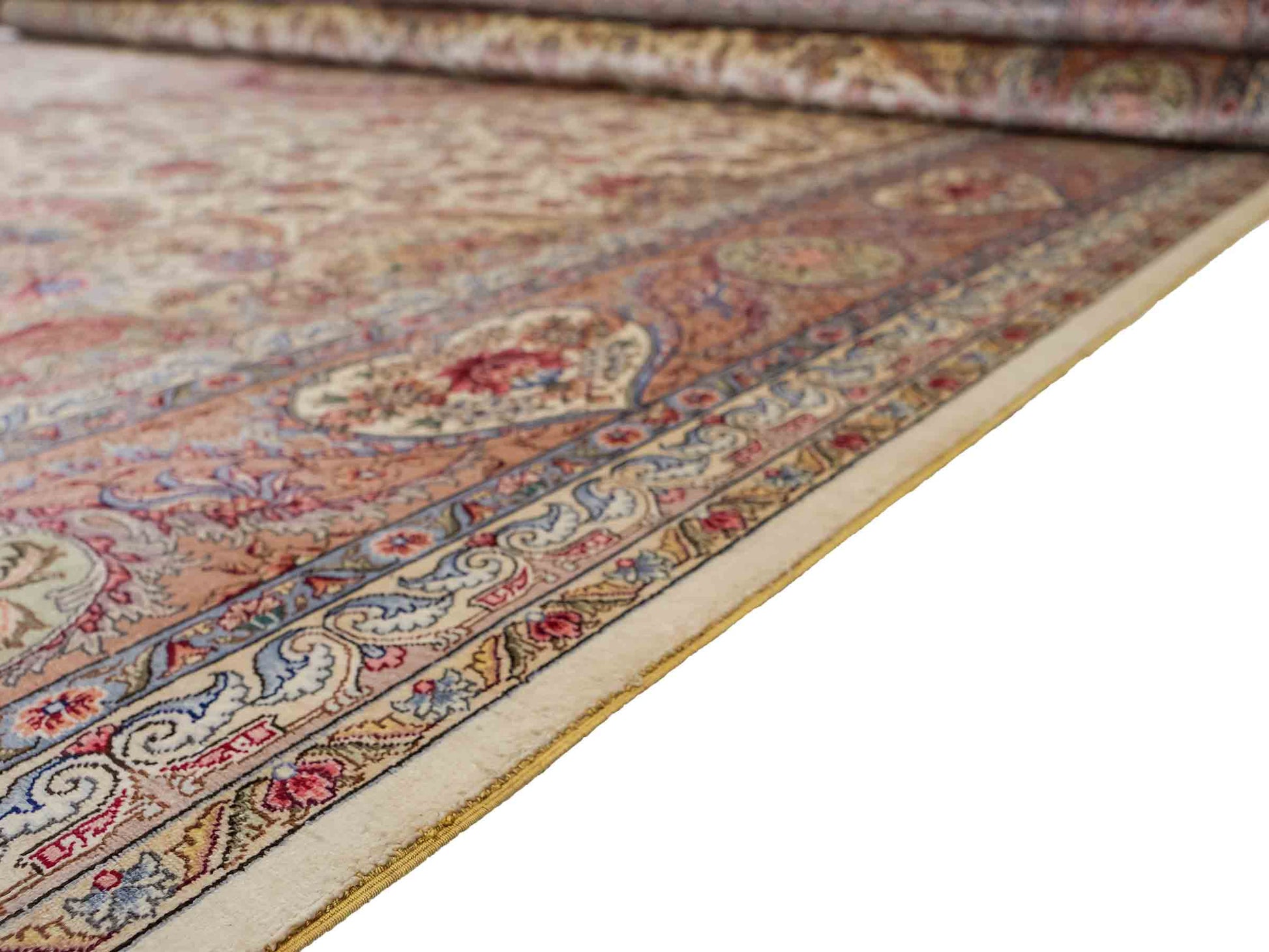 The pile and warp are made of pure silk, which not only grants the rug incredible worth, an unparalleled tactile experience, and breathtaking beauty but also imparts a uniquely shimmering appearance under different angles and lighting conditions.