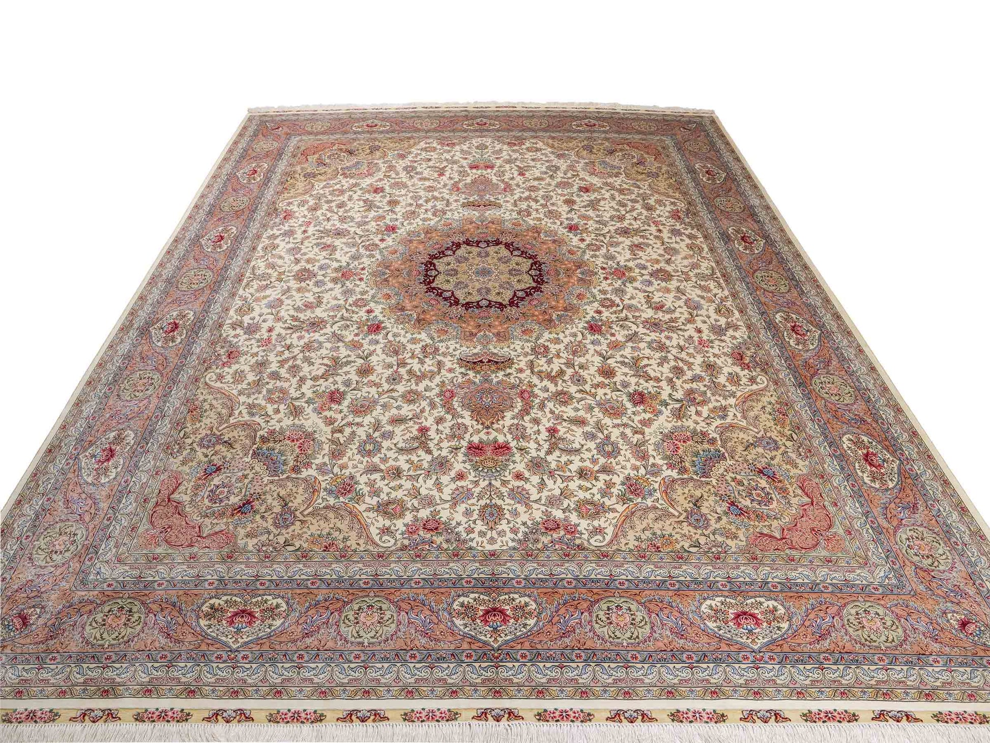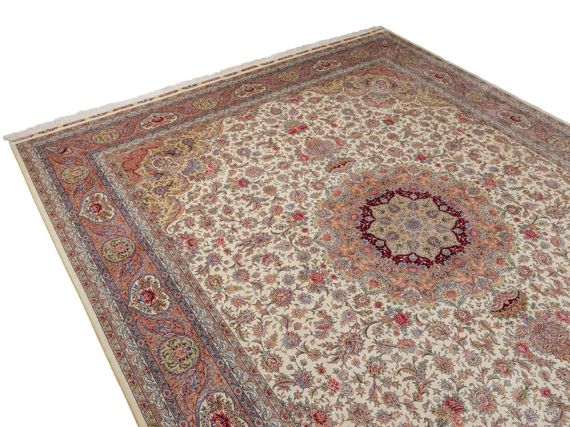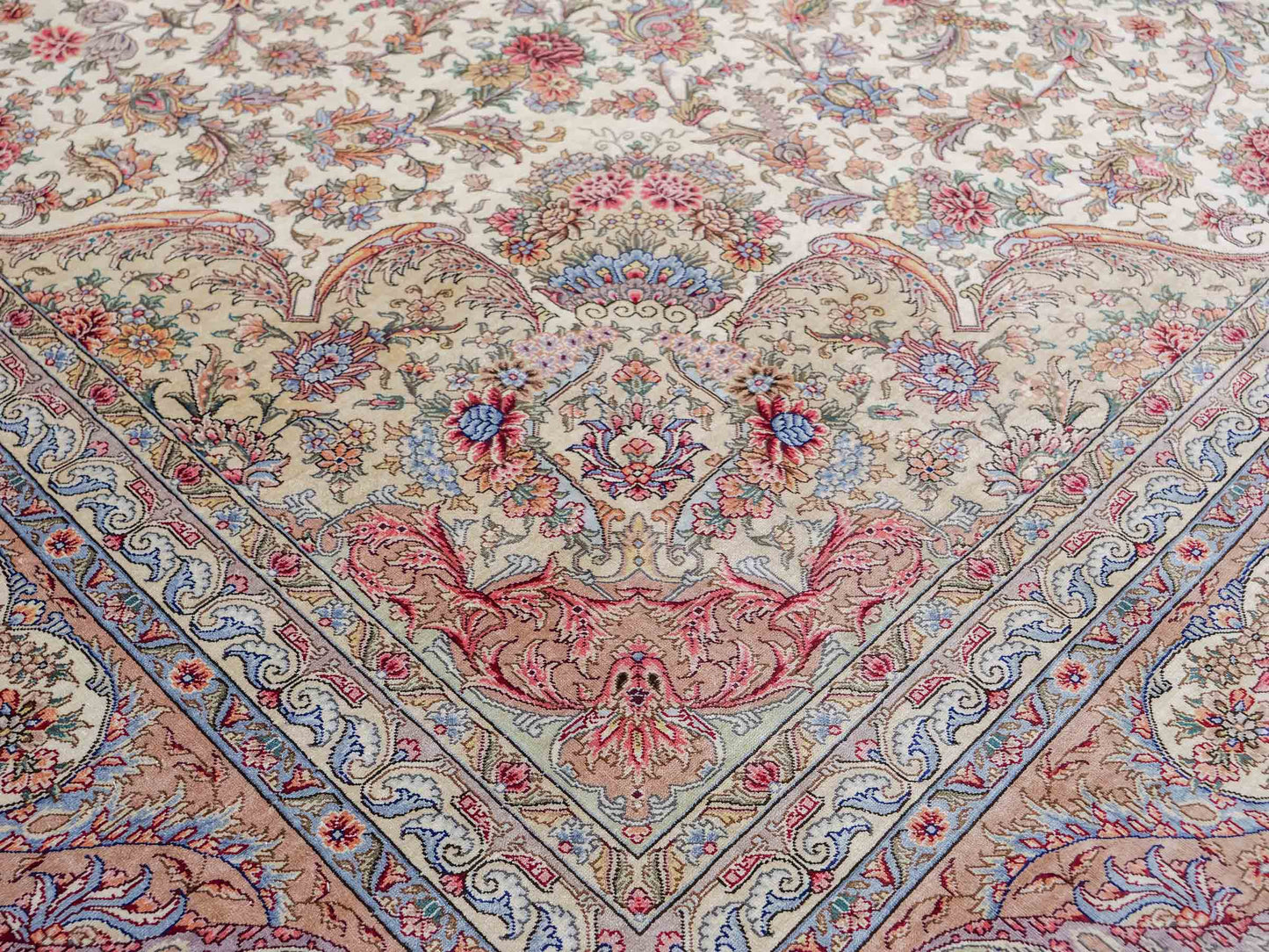 The pile and warp are made of pure silk, which not only grants the rug incredible worth, an unparalleled tactile experience, and breathtaking beauty but also imparts a uniquely shimmering appearance under different angles and lighting conditions.