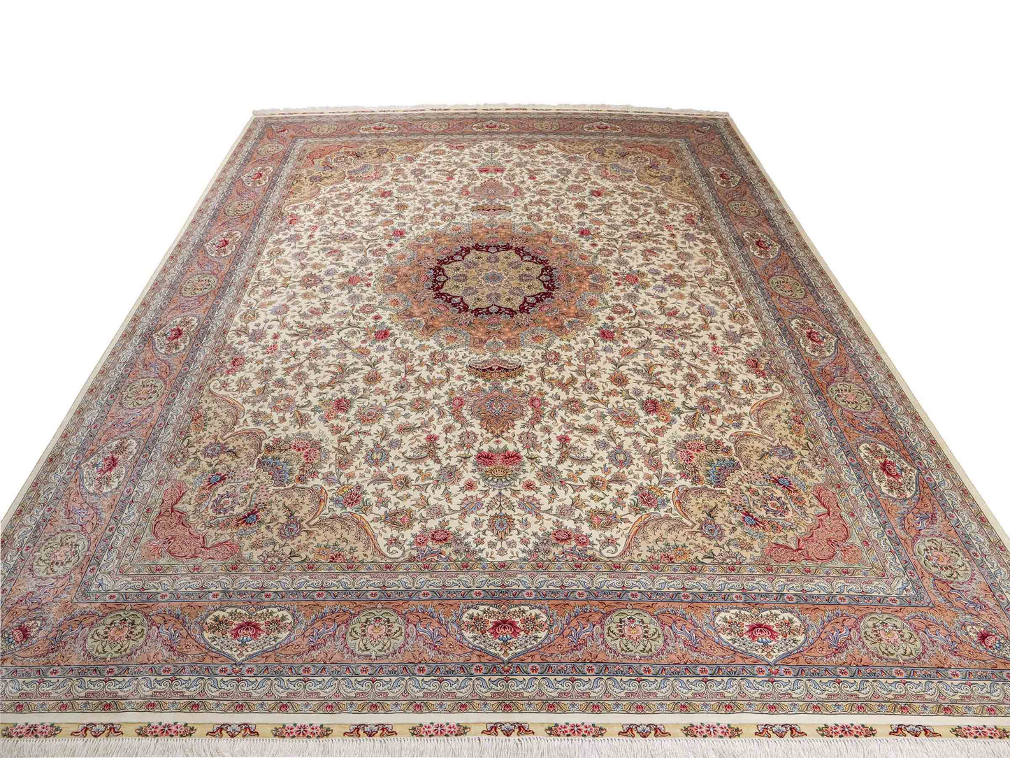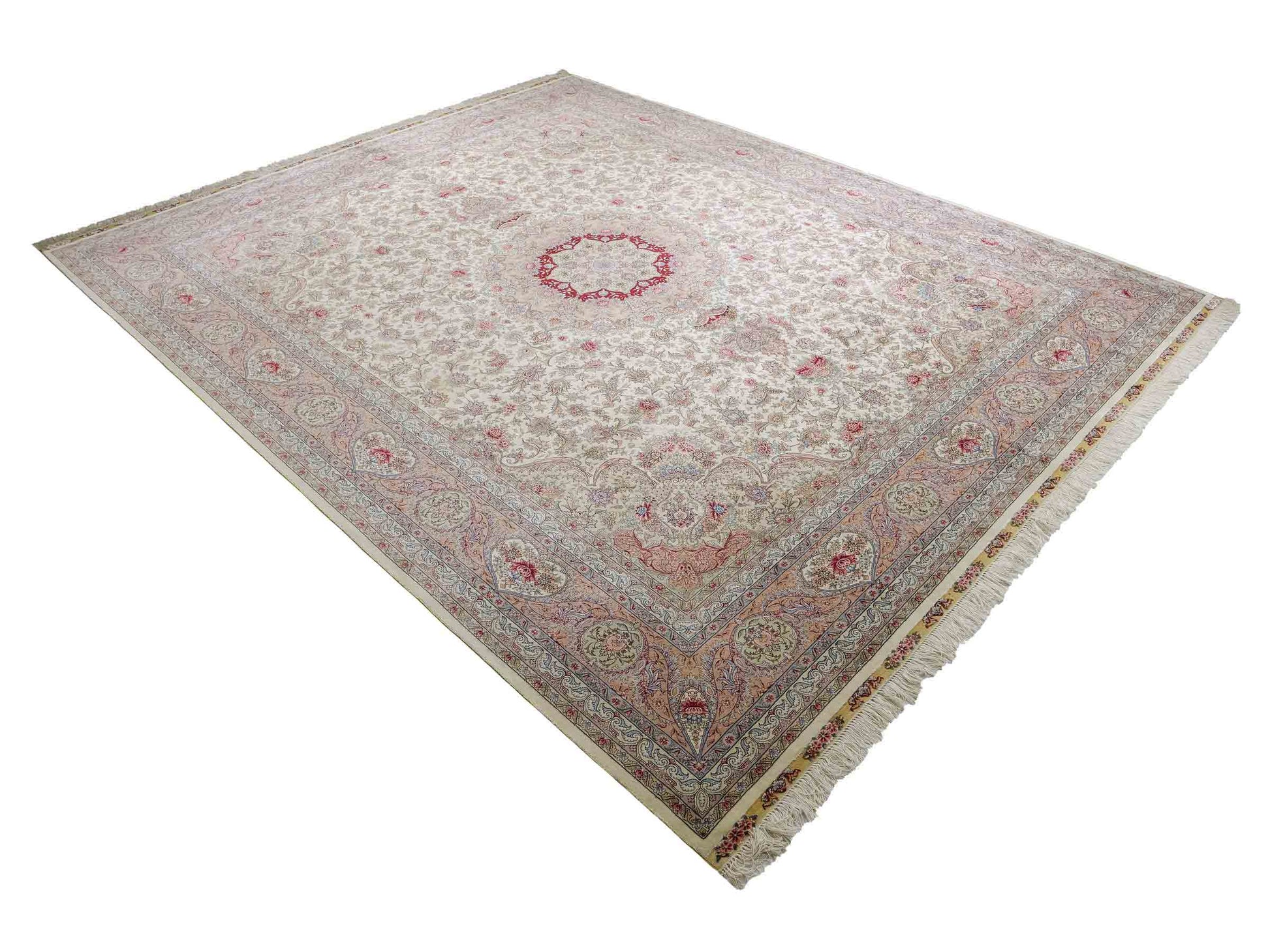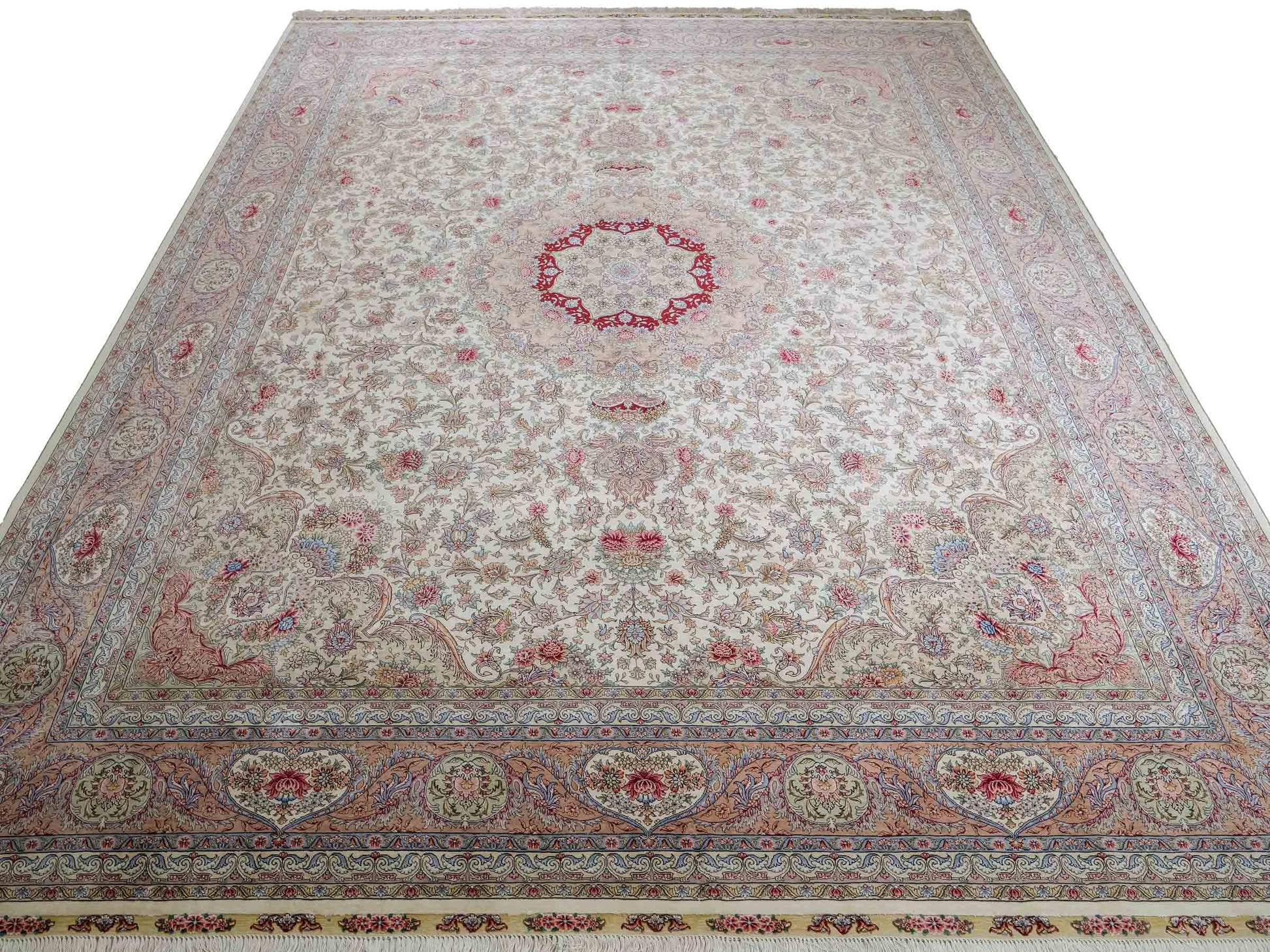 The pile and warp are made of pure silk, which not only grants the rug incredible worth, an unparalleled tactile experience, and breathtaking beauty but also imparts a uniquely shimmering appearance under different angles and lighting conditions.