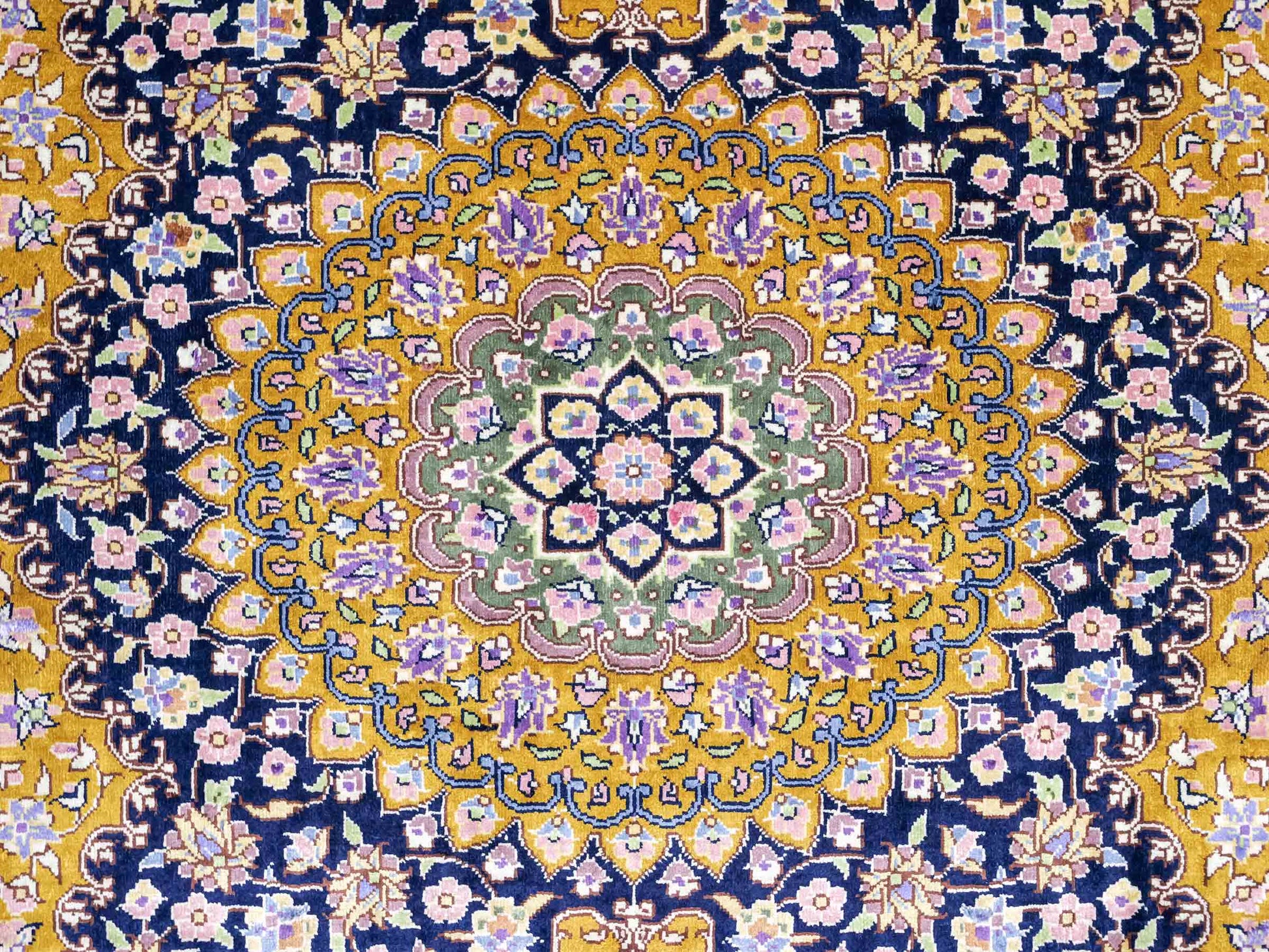 The pile and warp are made of pure silk, which not only grants the rug incredible worth, an unparalleled tactile experience, and breathtaking beauty but also imparts a uniquely shimmering appearance under different angles and lighting conditions.