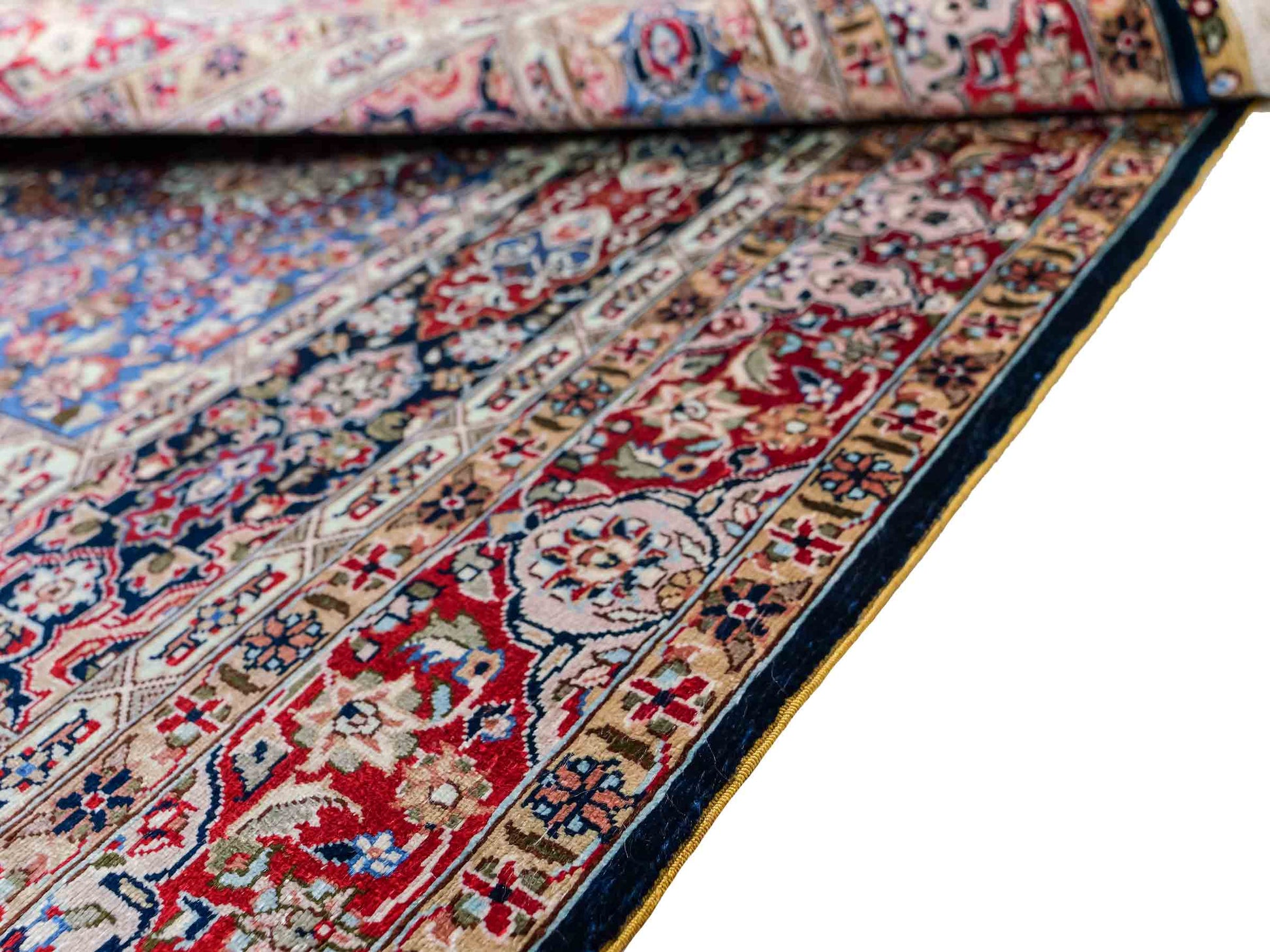 The pile and warp are made of pure silk, which not only grants the rug incredible worth, an unparalleled tactile experience, and breathtaking beauty but also imparts a uniquely shimmering appearance under different angles and lighting conditions.