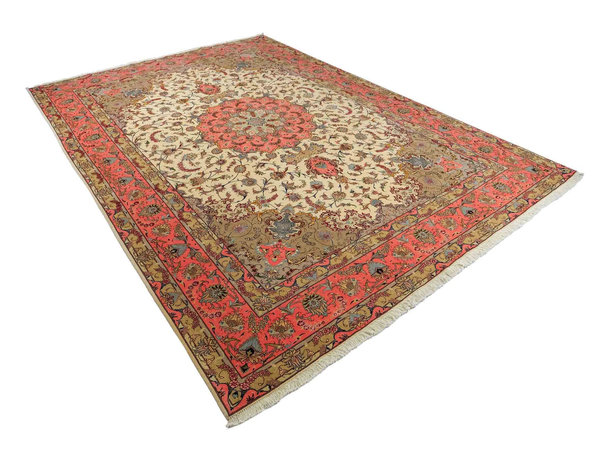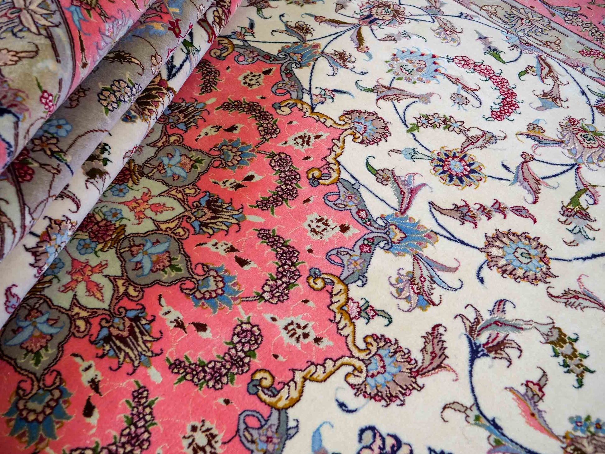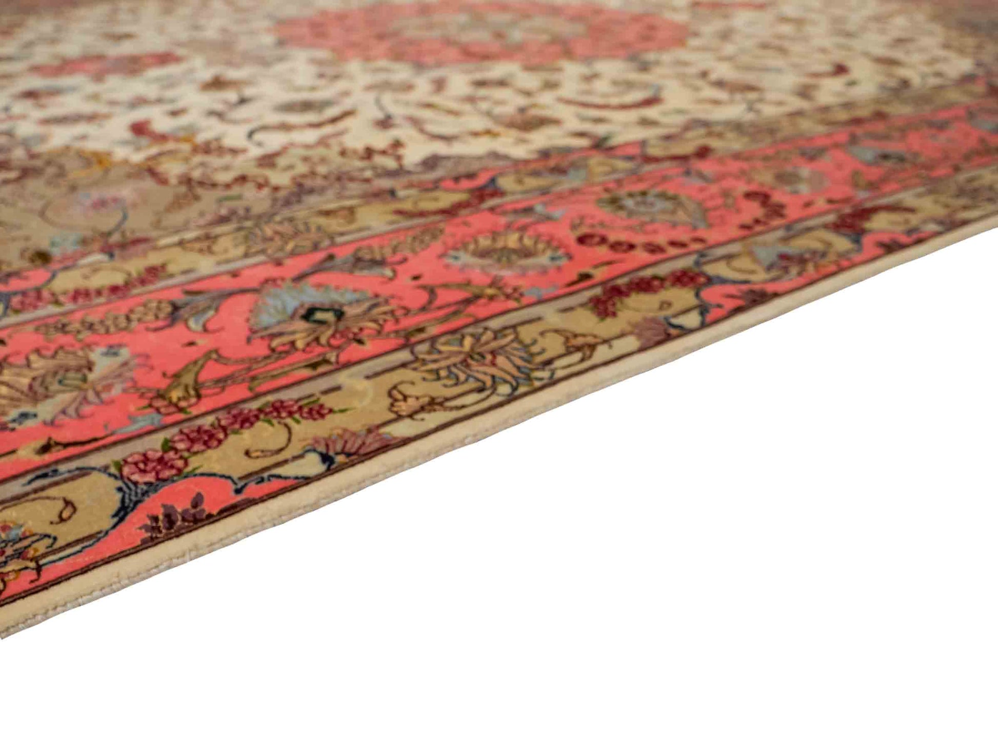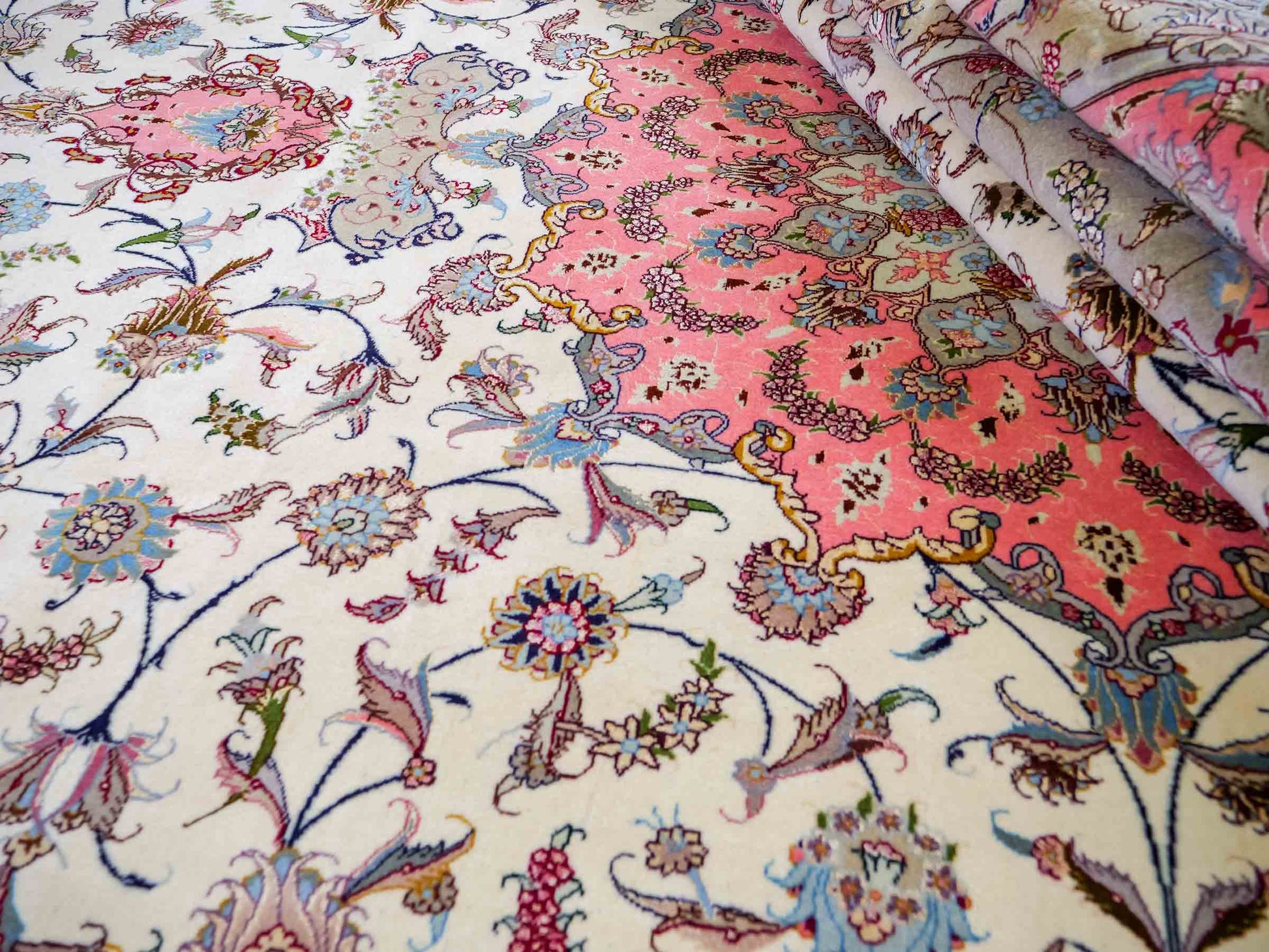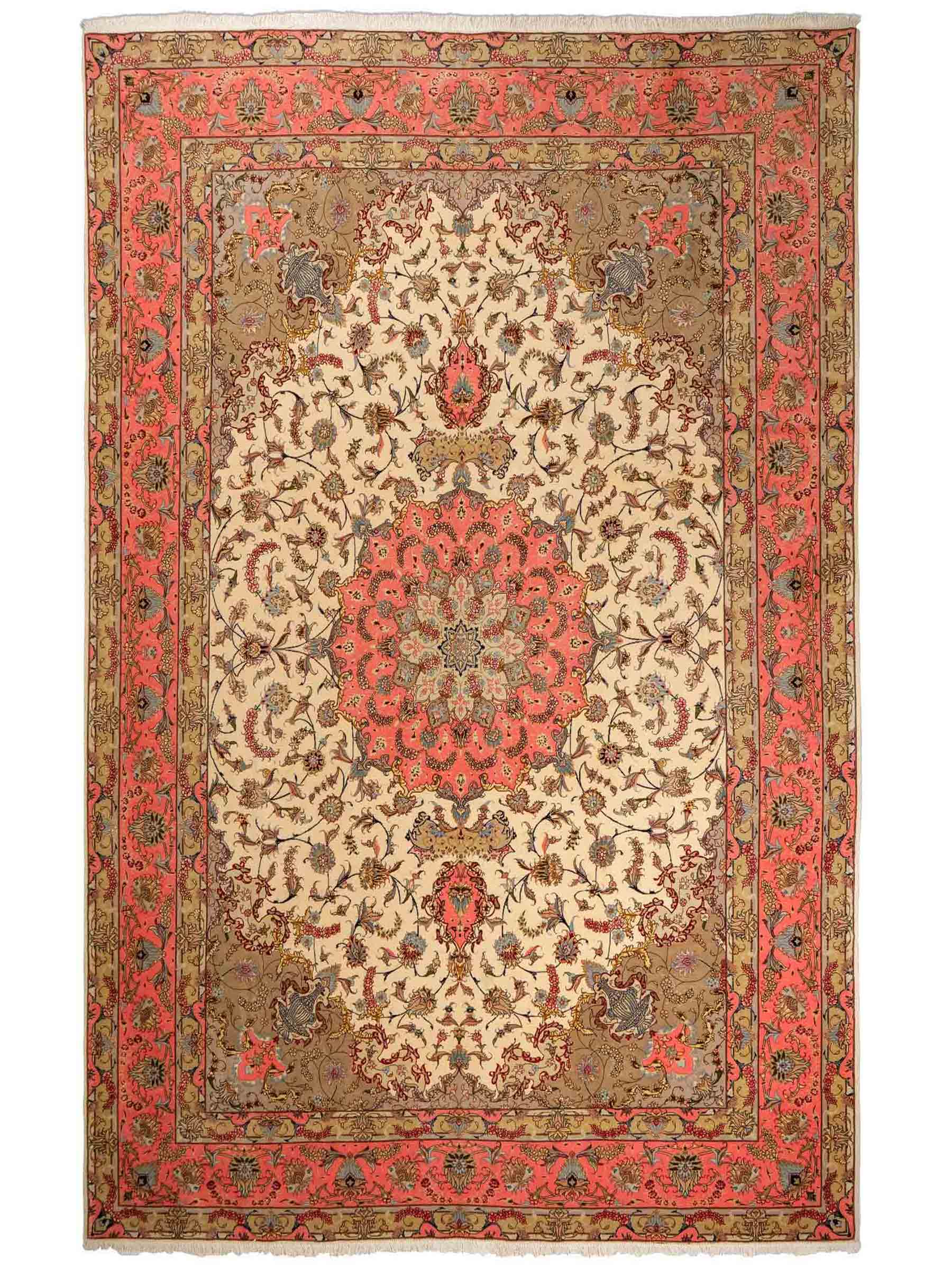Every Tabriz rug is hand-knotted from the finest virgin wool, with the most exclusive examples further highlighted by the use of silk—guaranteeing impressive visual impact and luxurious texture. In addition, these rugs stand out for their immense knot density, which enhances both the level of detail and their durability.