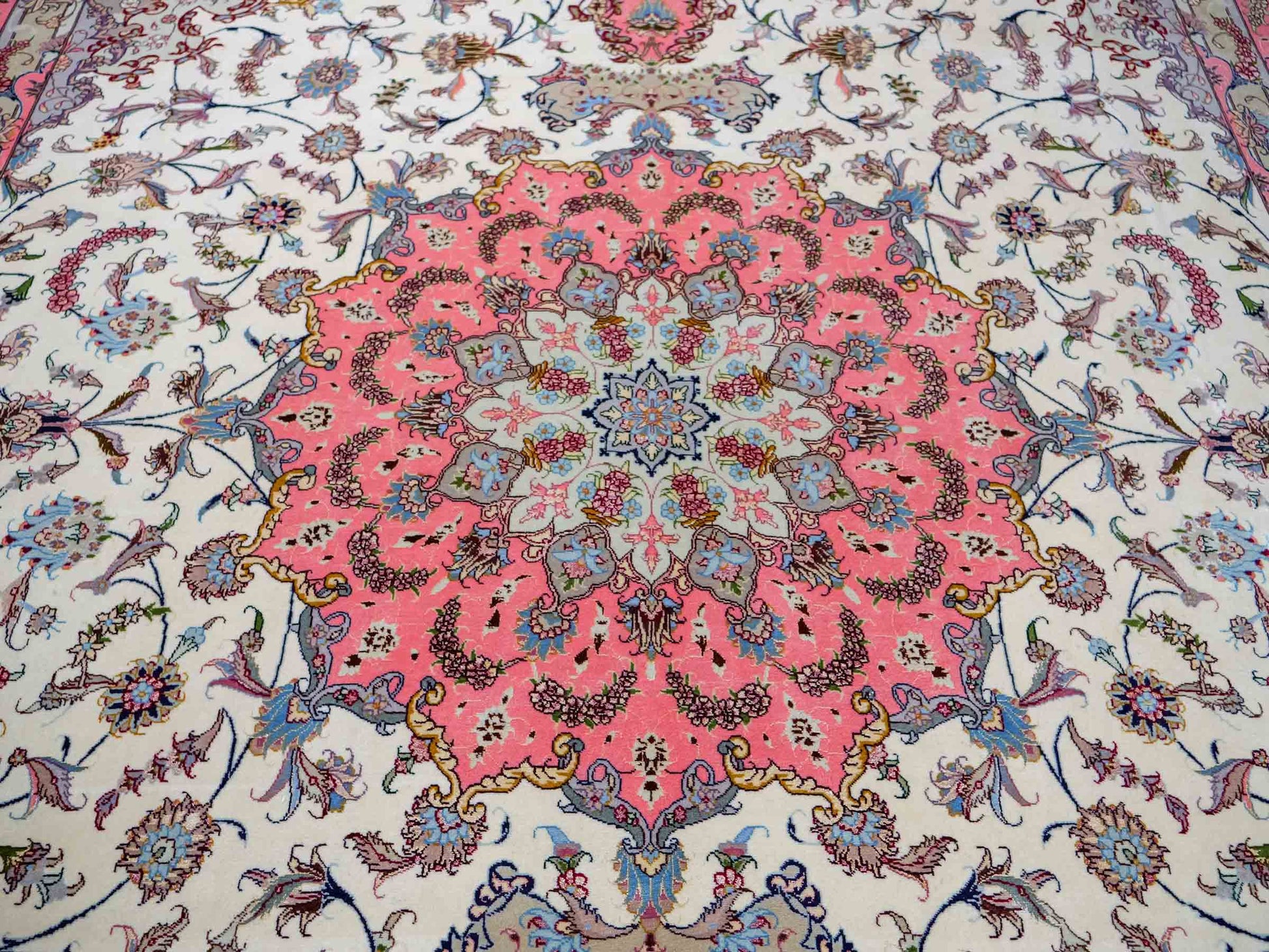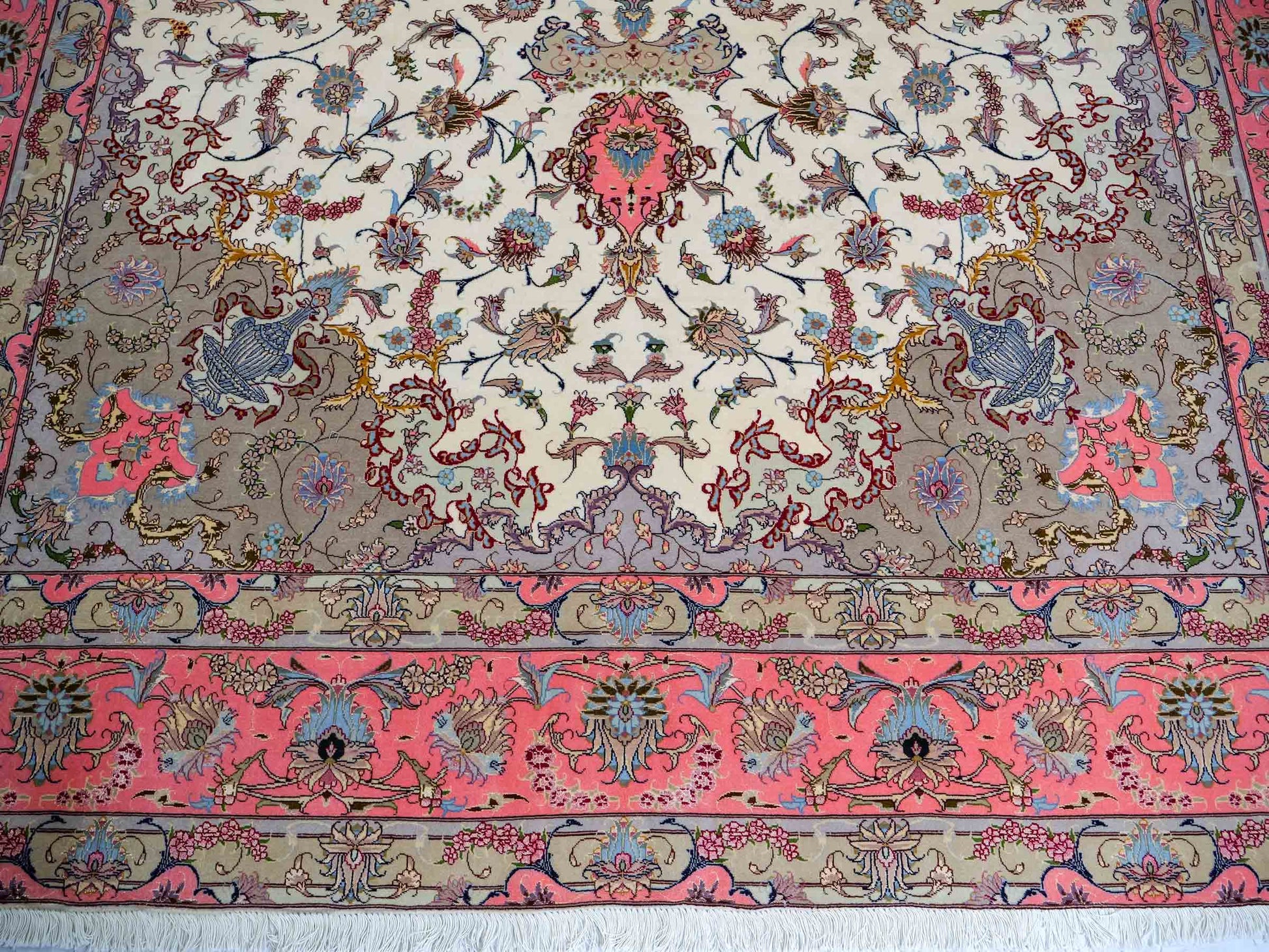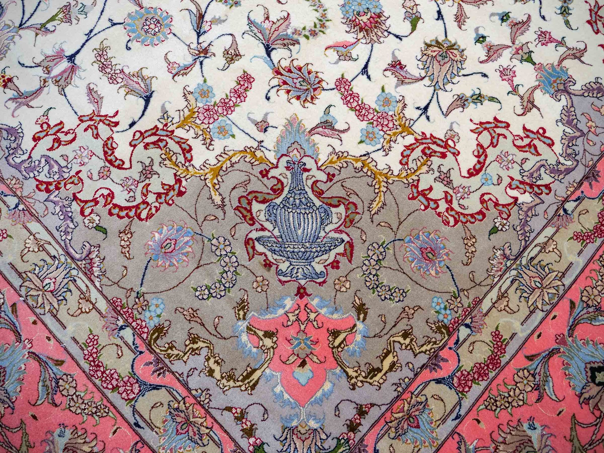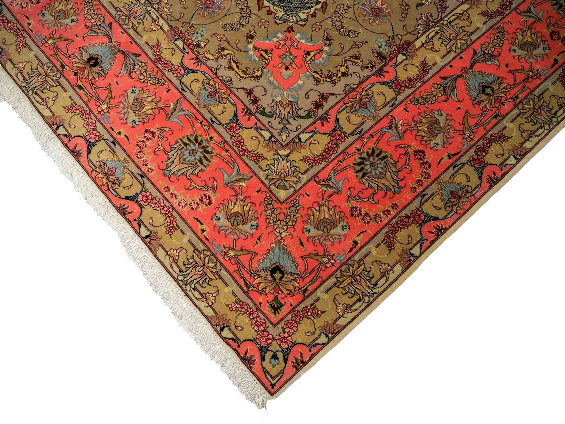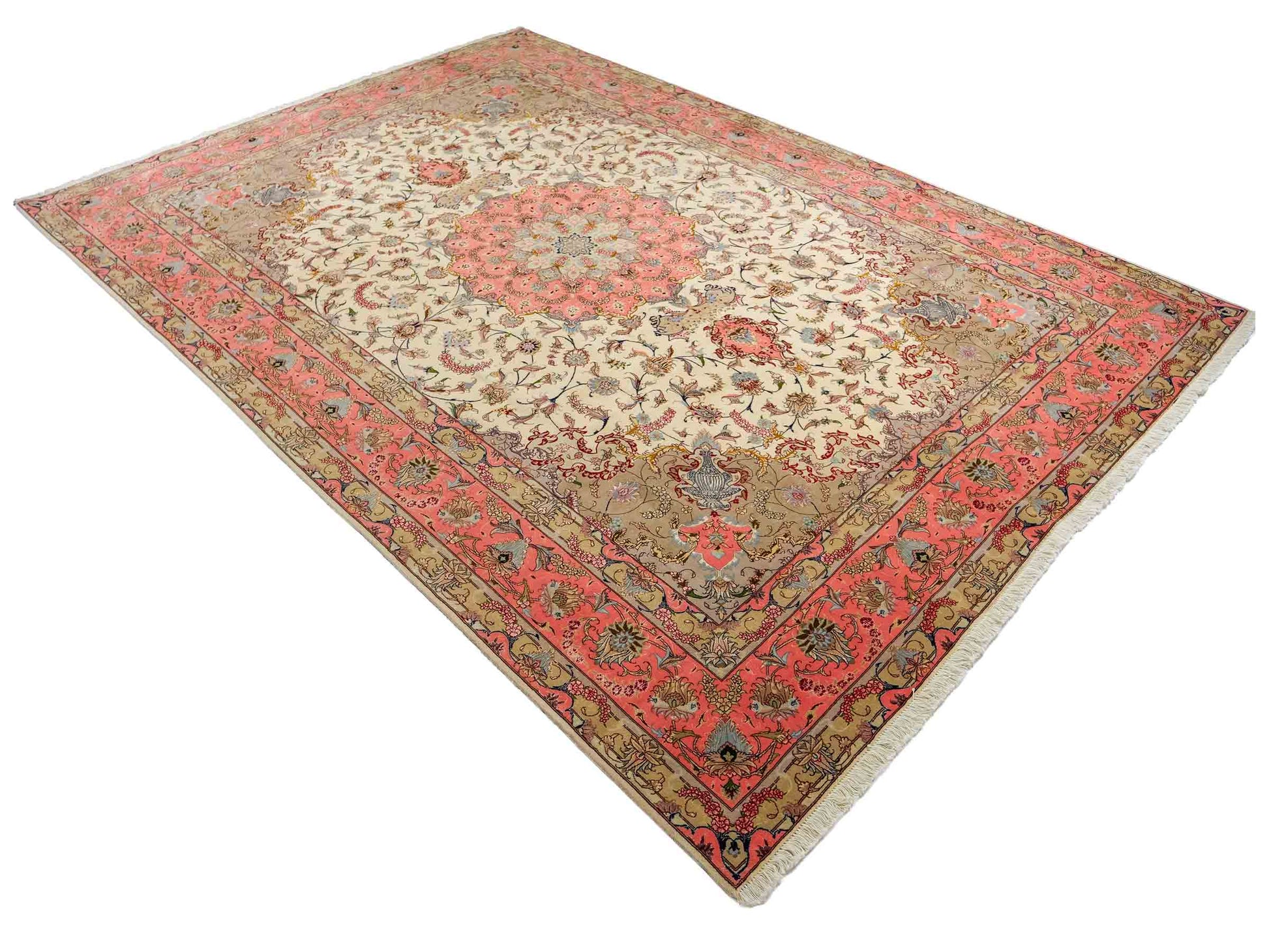 Every Tabriz rug is hand-knotted from the finest virgin wool, with the most exclusive examples further highlighted by the use of silk—guaranteeing impressive visual impact and luxurious texture. In addition, these rugs stand out for their immense knot density, which enhances both the level of detail and their durability.