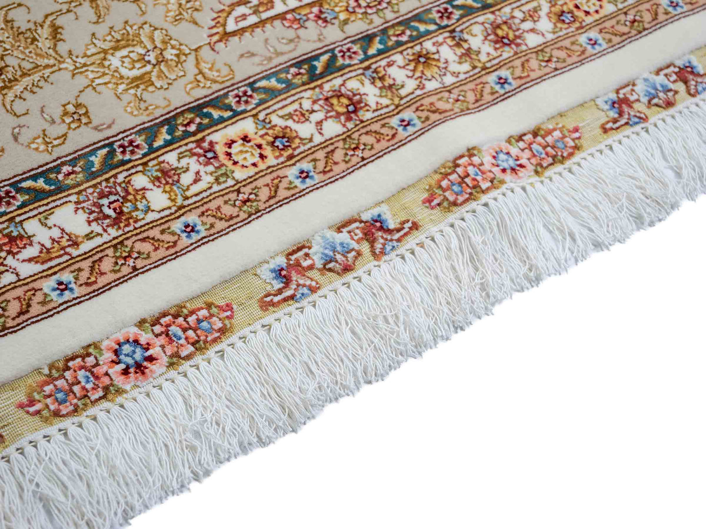 The pure silk warp guarantees lasting durability, while the pile is woven from the finest virgin wool and elegantly accented with silk. This harmonious blend of valuable materials ensures both comfort and sophisticated artisan aesthetics.
