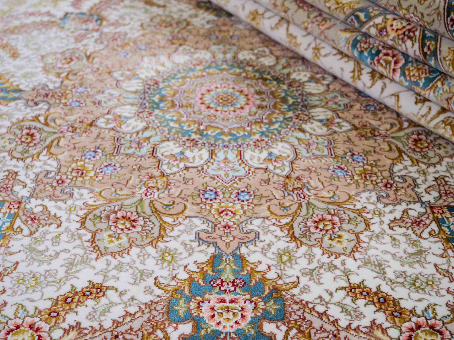 Wool with Silk: These rugs require particularly careful storage, as the combination of wool and silk makes both materials sensitive. Store them in a cool, dry place away from direct sunlight. A constant temperature of about 18 degrees Celsius is ideal. Use breathable cotton dust covers to protect the rug while ensuring ventilation. Regular inspections help to detect mold and pests early.
