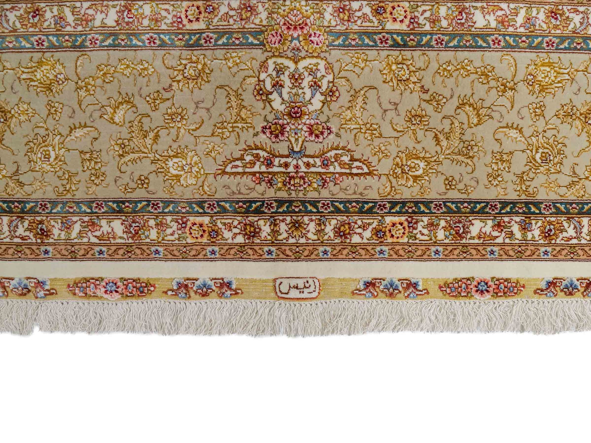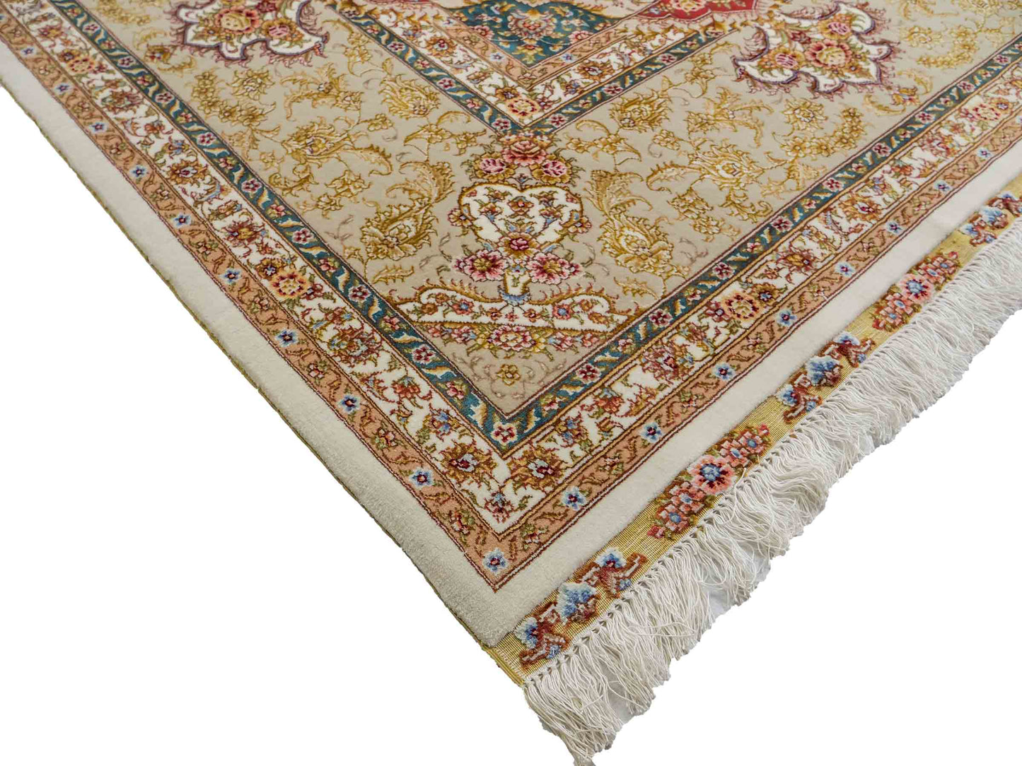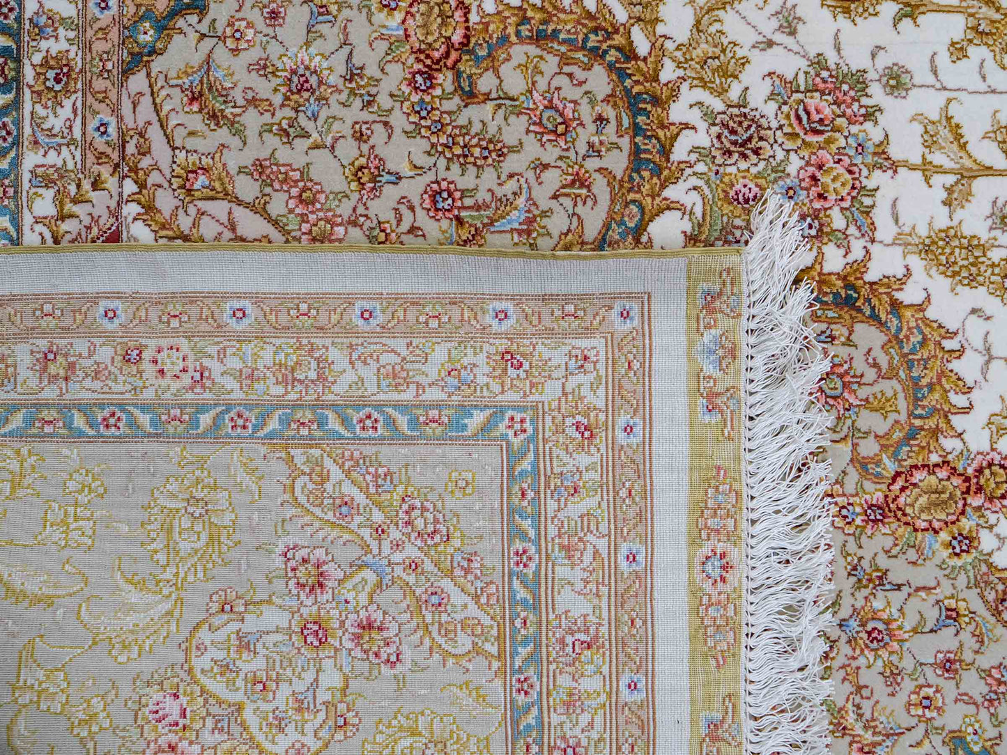 The pure silk warp guarantees lasting durability, while the pile is woven from the finest virgin wool and elegantly accented with silk. This harmonious blend of valuable materials ensures both comfort and sophisticated artisan aesthetics.
