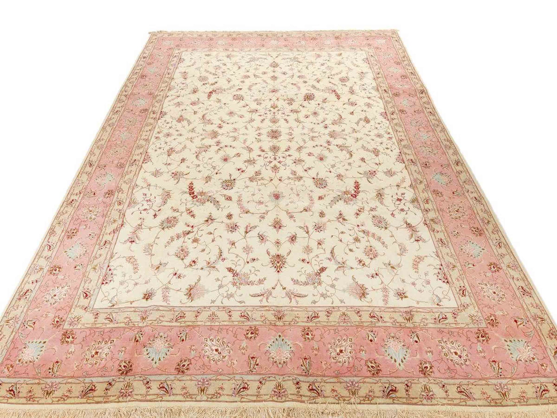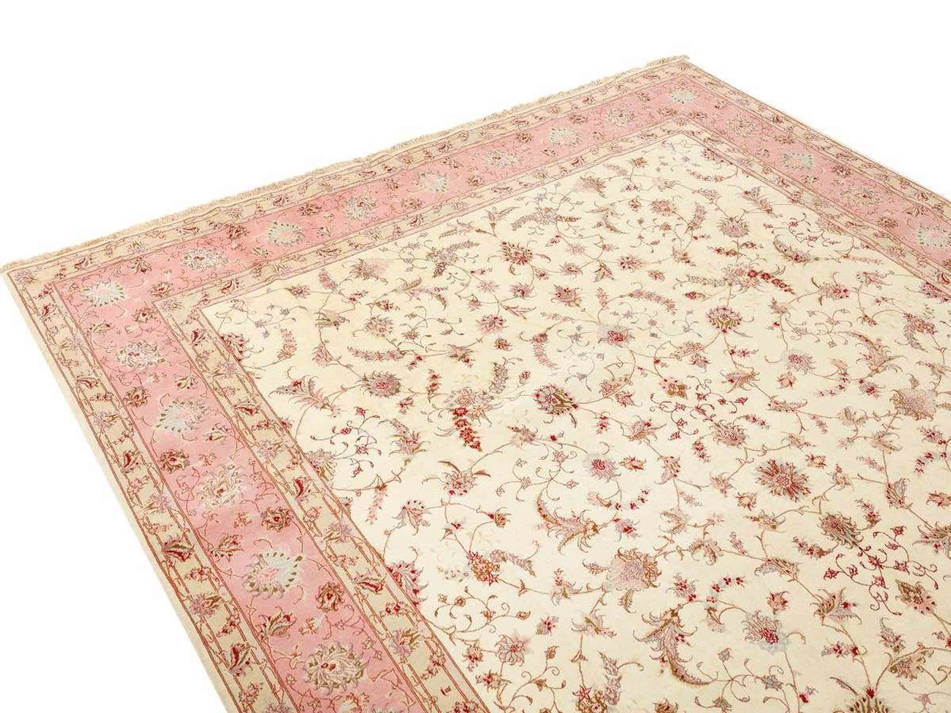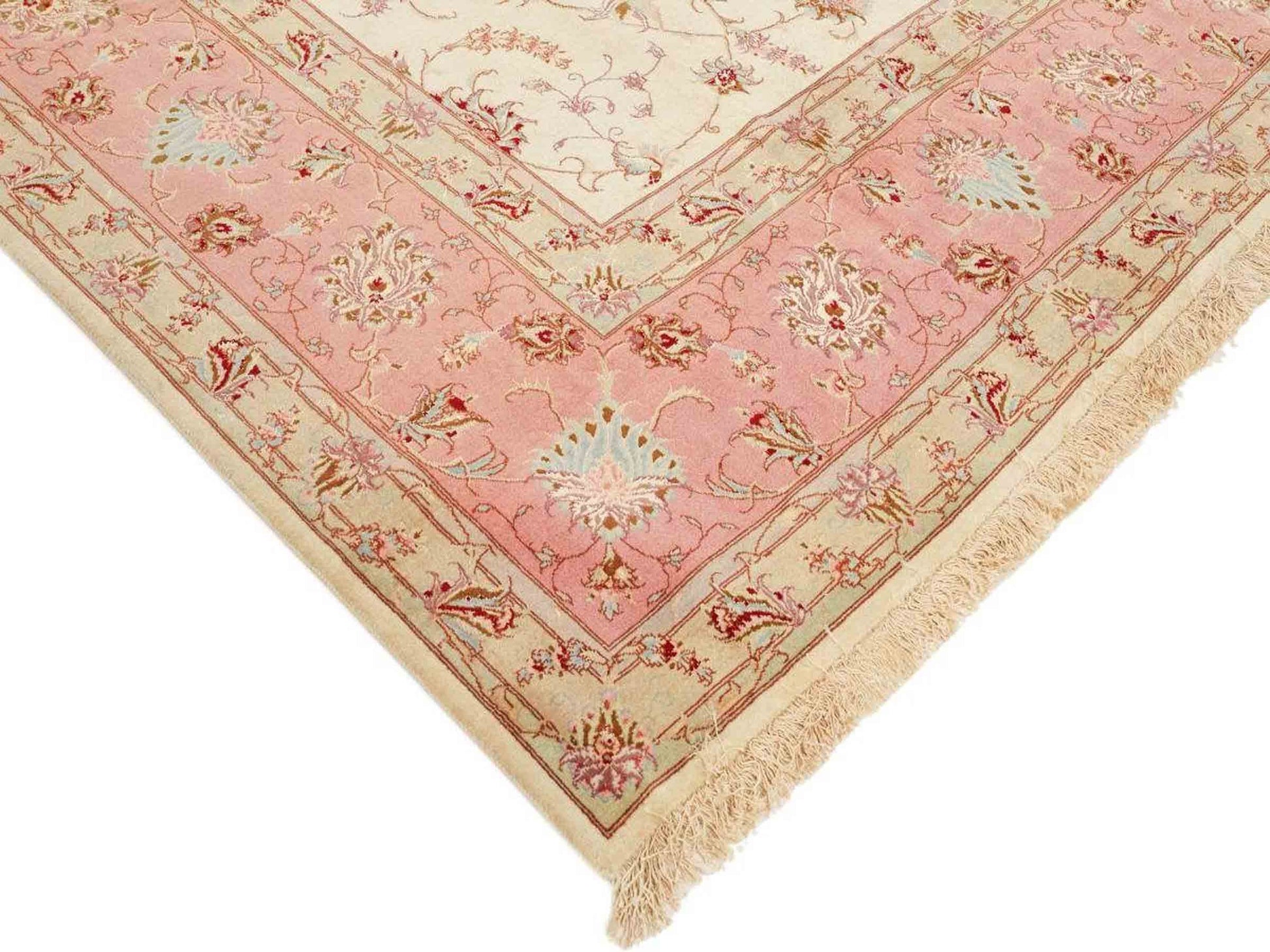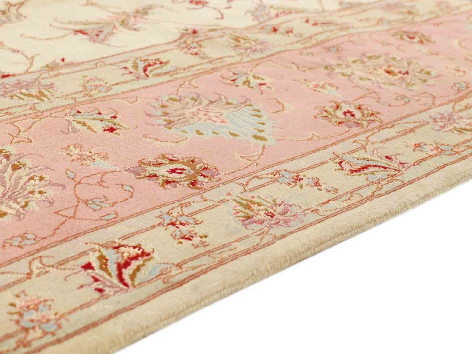 Every Tabriz rug is hand-knotted from the finest virgin wool, with the most exclusive examples further highlighted by the use of silk. Silk is used for the warp, the fringes, as well as for accentuating floral motifs—guaranteeing impressive visual impact and luxurious texture. In addition, these rugs stand out for their immense knot density, which enhances both the level of detail and their durability.