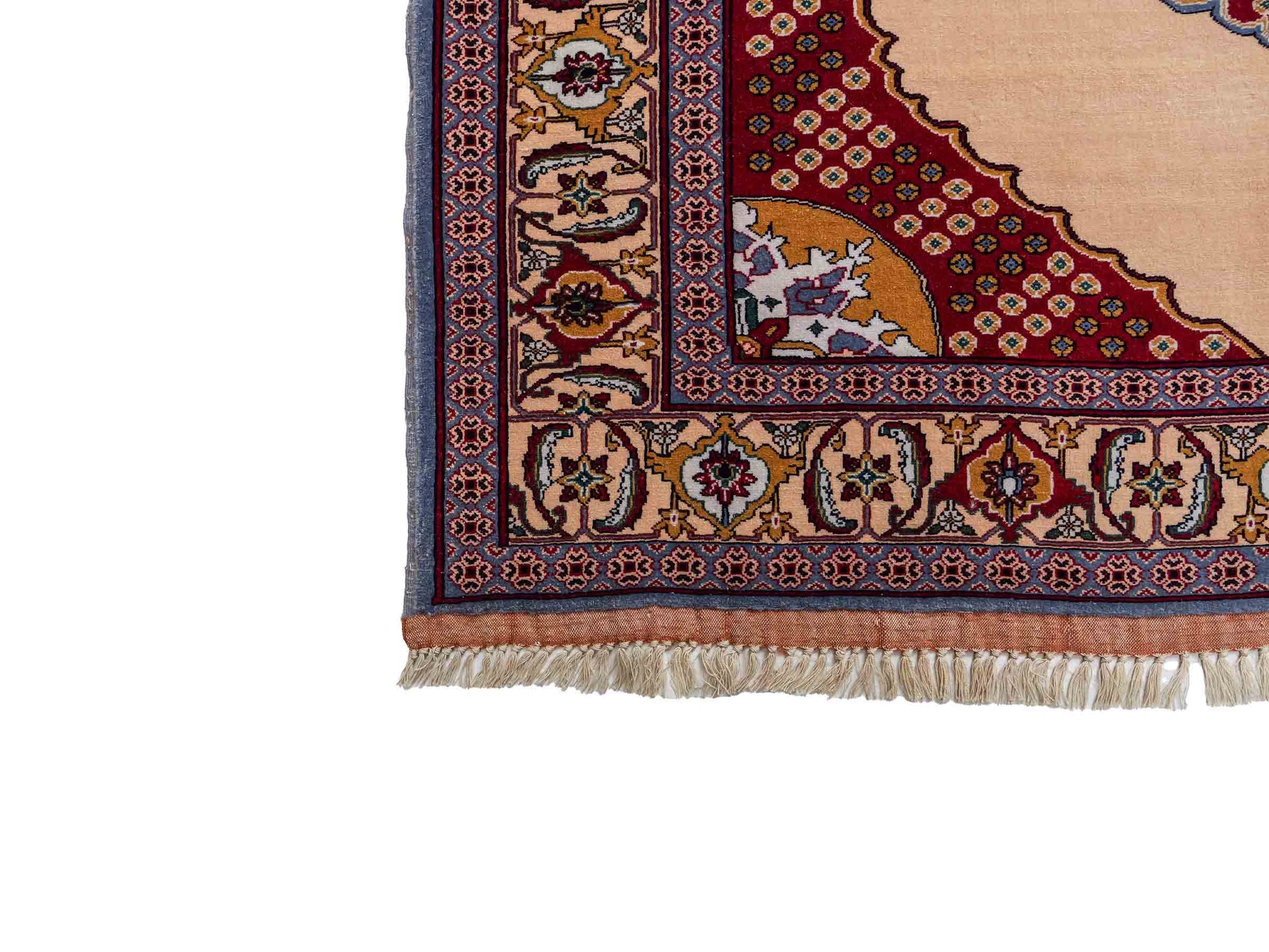 Wool with Silk: These rugs require particularly careful storage, as the combination of wool and silk makes both materials sensitive. Store them in a cool, dry place away from direct sunlight. A constant temperature of about 18 degrees Celsius is ideal. Use breathable cotton dust covers to protect the rug while ensuring ventilation. Regular inspections help to detect mold and pests early.